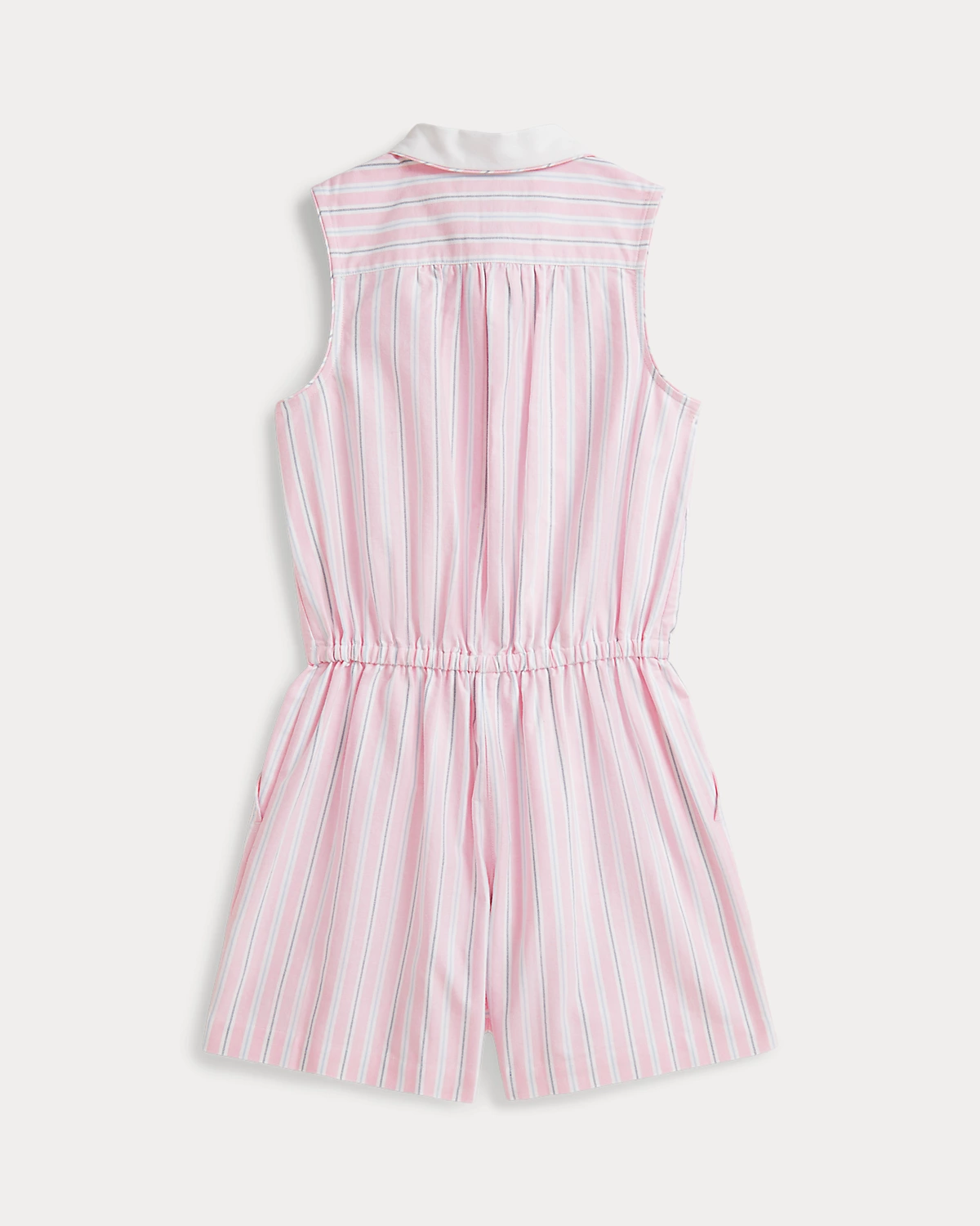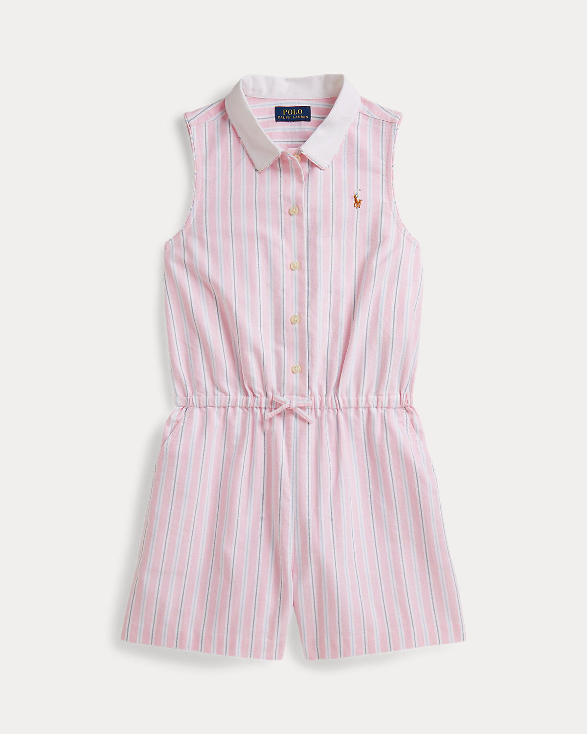 Inspired by New England’s effortless coastal charm, this cotton oxford romper is yarn-dyed in a striped motif then detailed with a contrasting collar and our signature multicolored embroidered Pony.