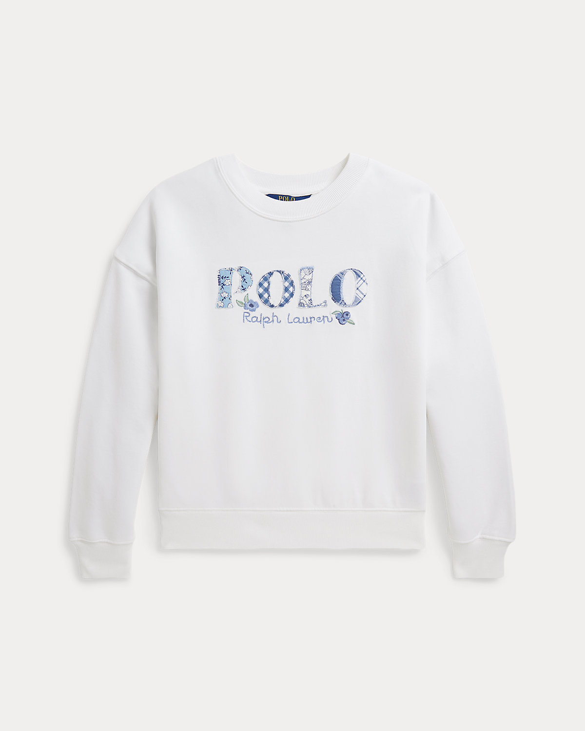 On this cotton French terry sweatshirt, our “Polo” logo is depicted with appliqués in a mix of seasonal prints inspired by New England’s effortless coastal charm.