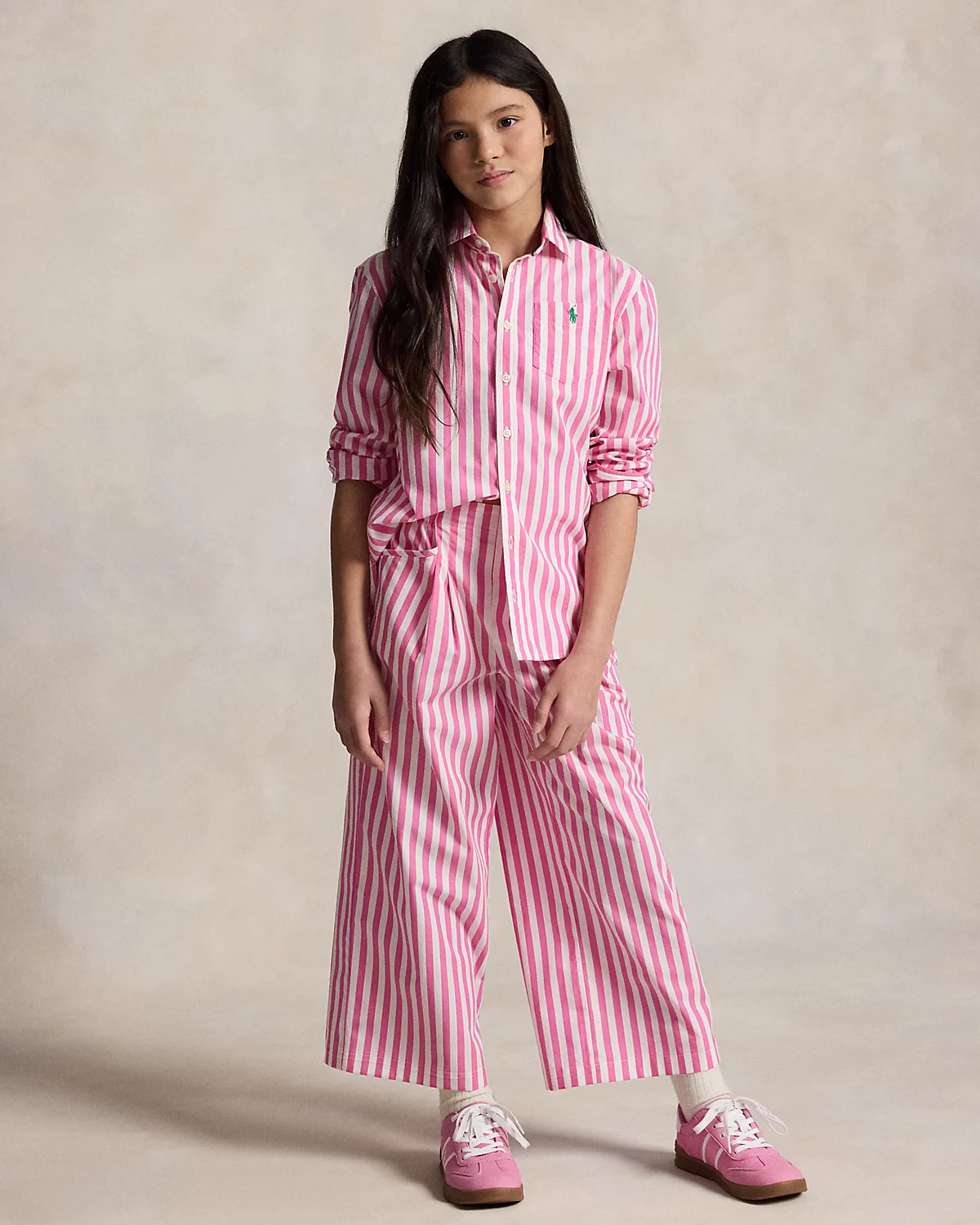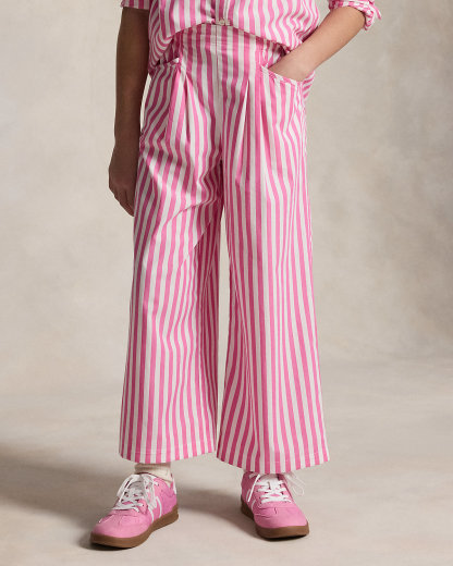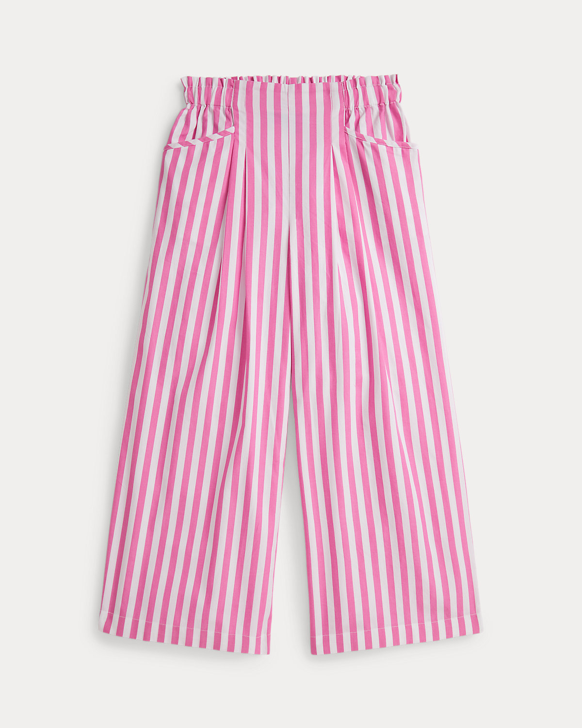 Polished yet playful, these cotton pants are designed with a wide-leg silhouette, vibrant stripes, and ruffle trim at the waist.