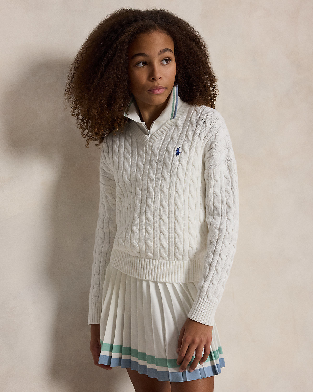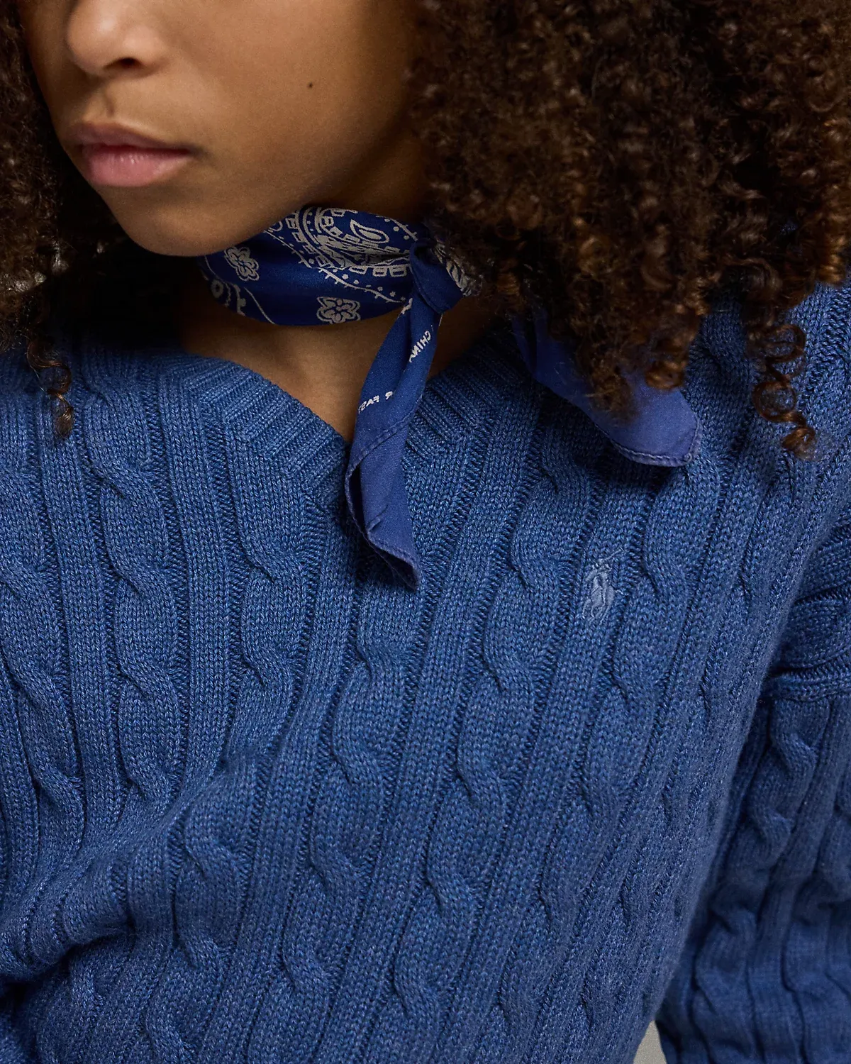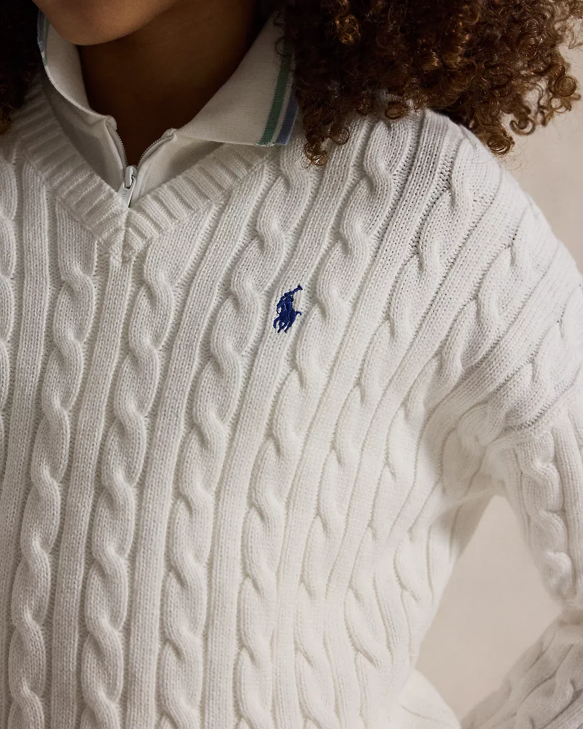 This V-neck sweater is made with combed cotton and then washed for added softness. A cable-knit pattern along with our signature embroidered Pony lend classic Polo style.
