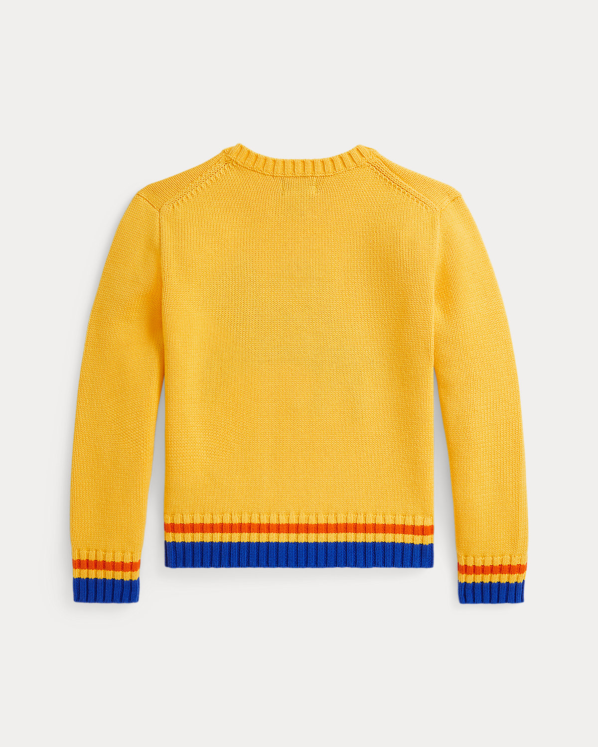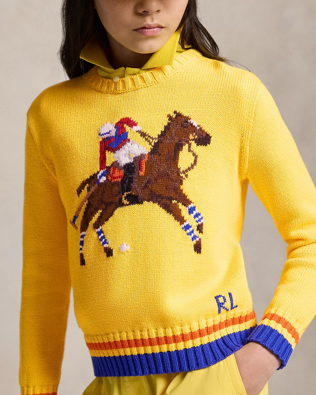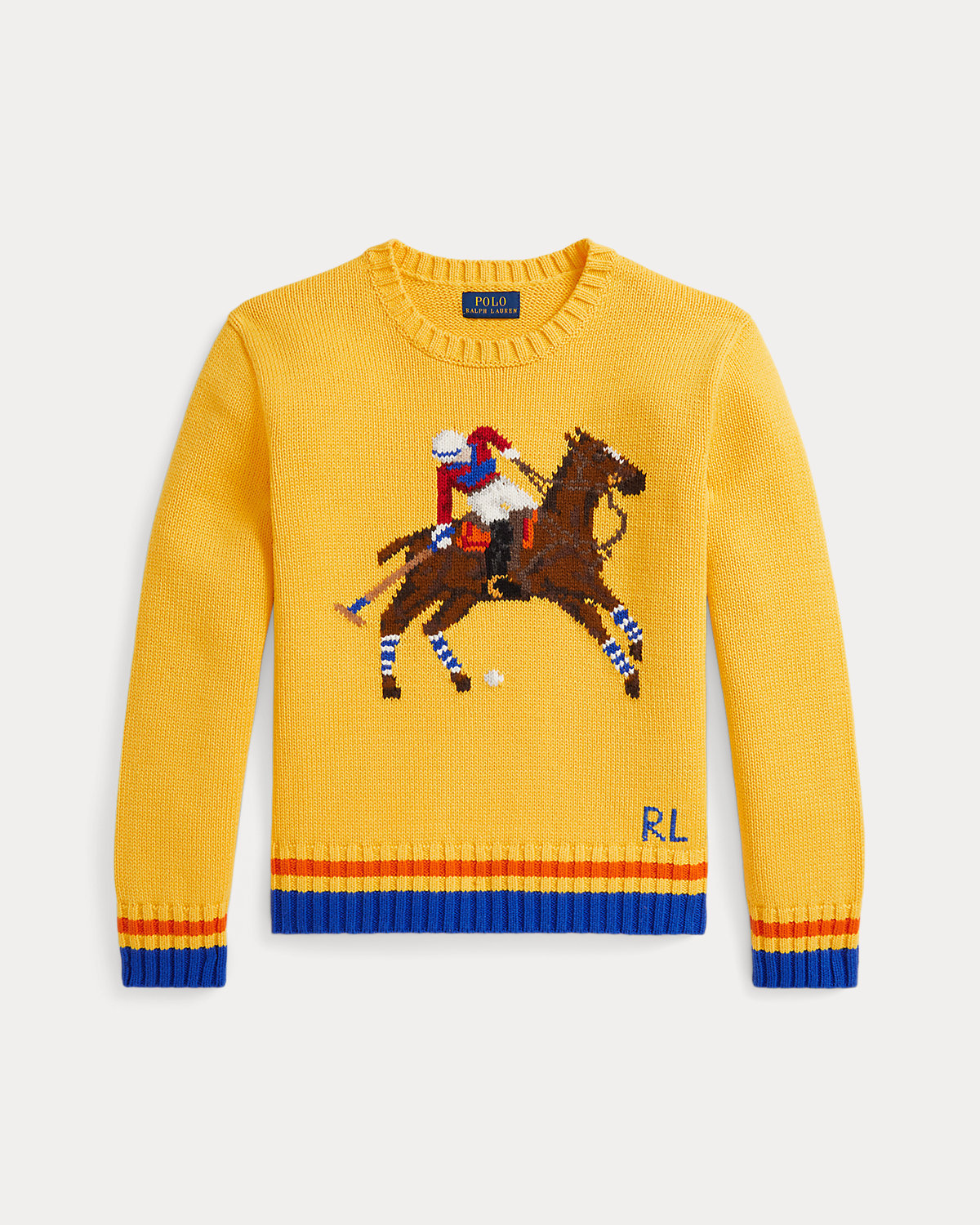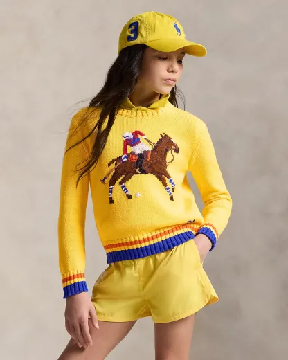 In a nod to our equestrian roots, this chunky-knit sweater utilizes more than 15 different yarns to depict a polo player competing on horseback.