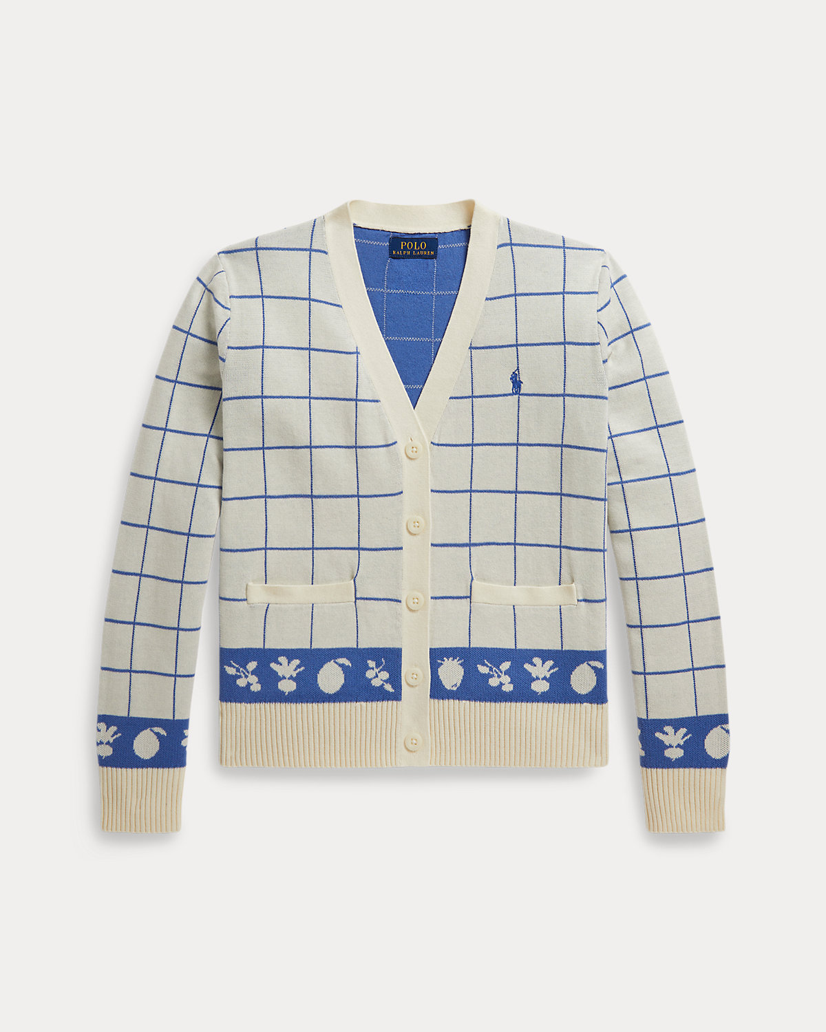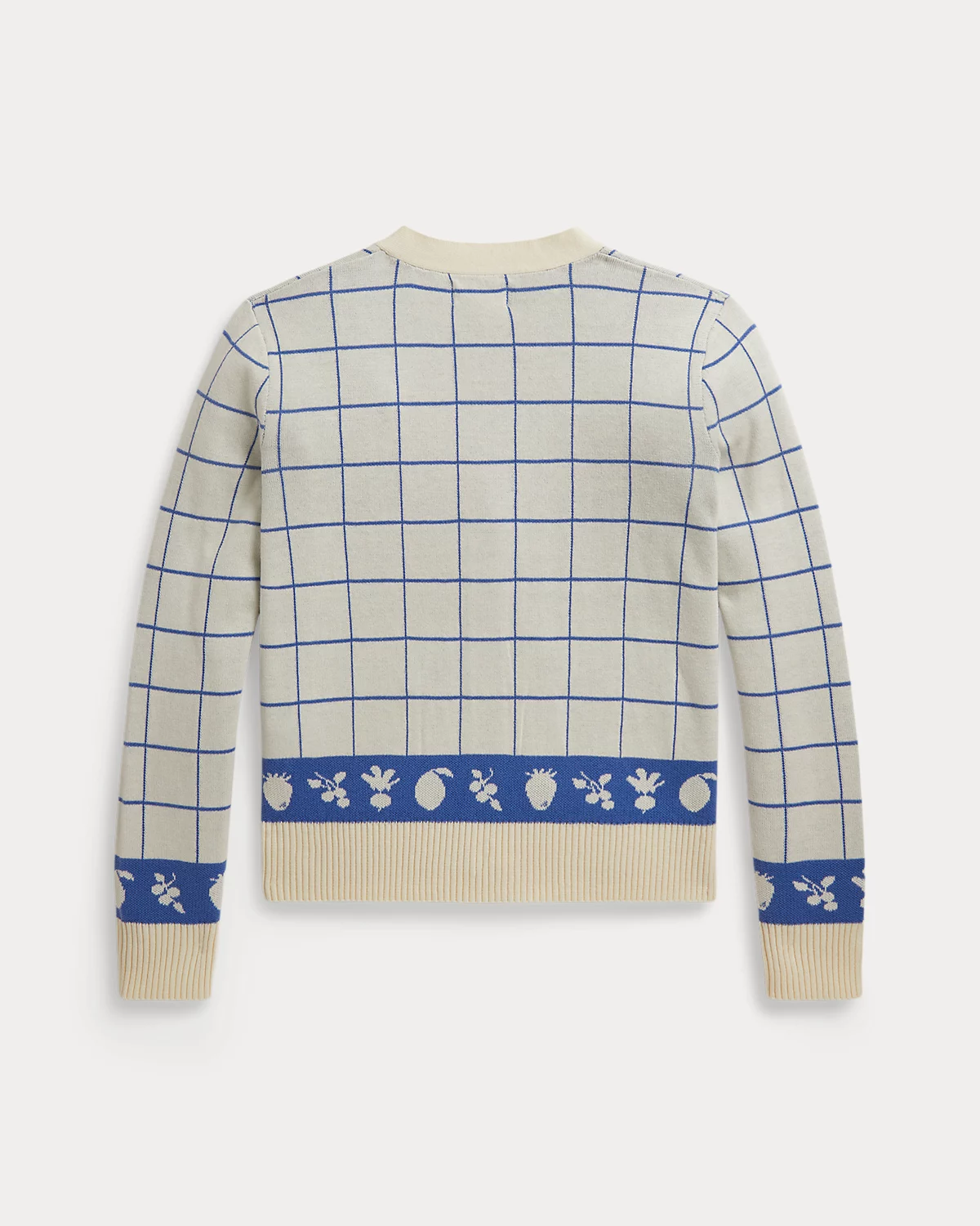Inspired by New England’s effortless coastal charm, this cardigan unites a windowpane pattern with a motif of fruits and vegetables at the hem. It is made with lightweight combed cotton then washed for added softness.