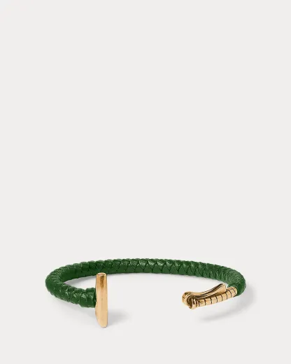 Part of Ralpthth Lauren’s inaugural fine jewelry collection for men, this equestrian-inspired cuff is meticulously crafted in Italy from tumbled antiqued brass with a matte finish, wrapped in woven full grain calfskin, and designed with a polo mallet silhouette.