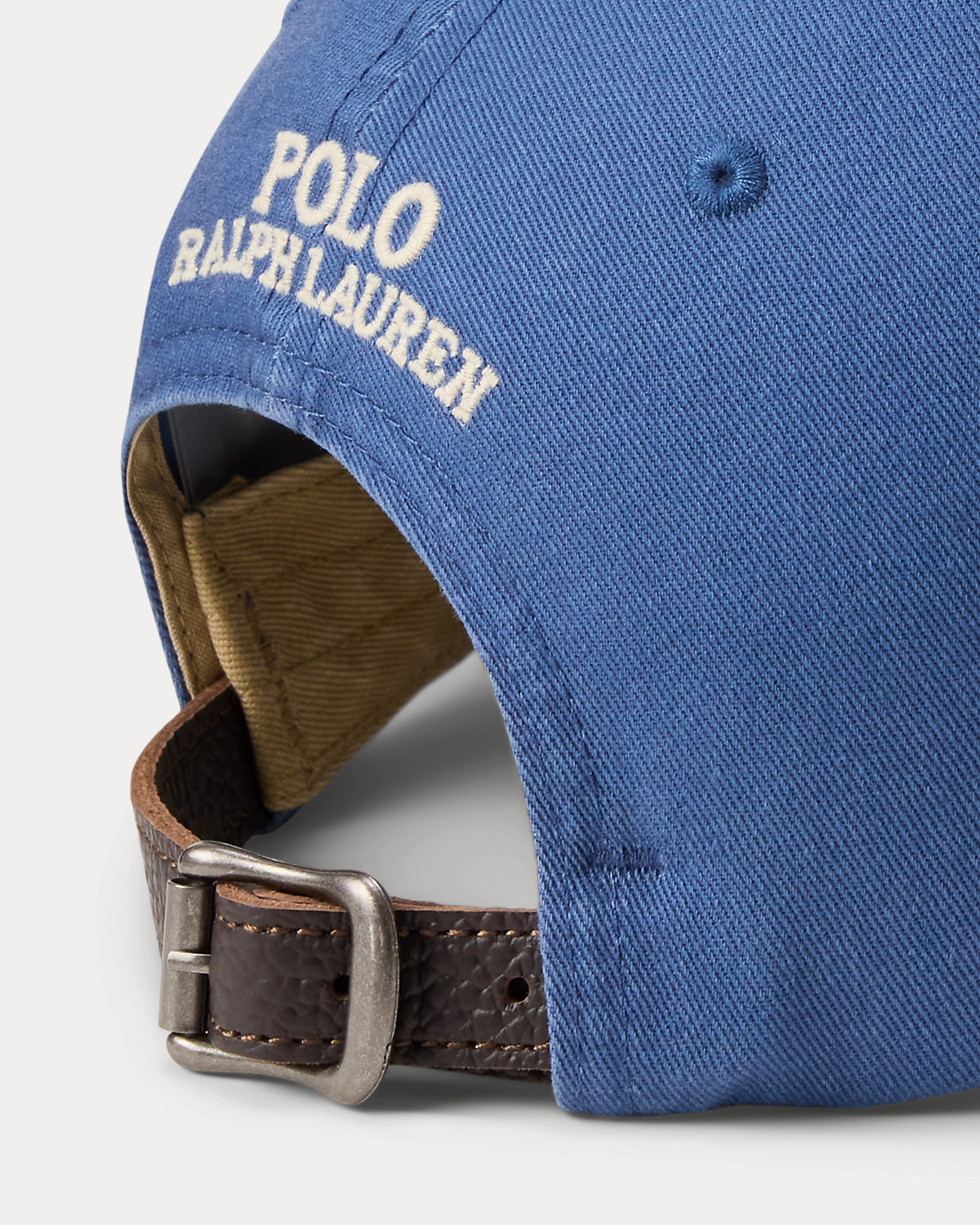 - “Polo Ralpthth Lauren” embroidery and a buckled leather strap at the back.
