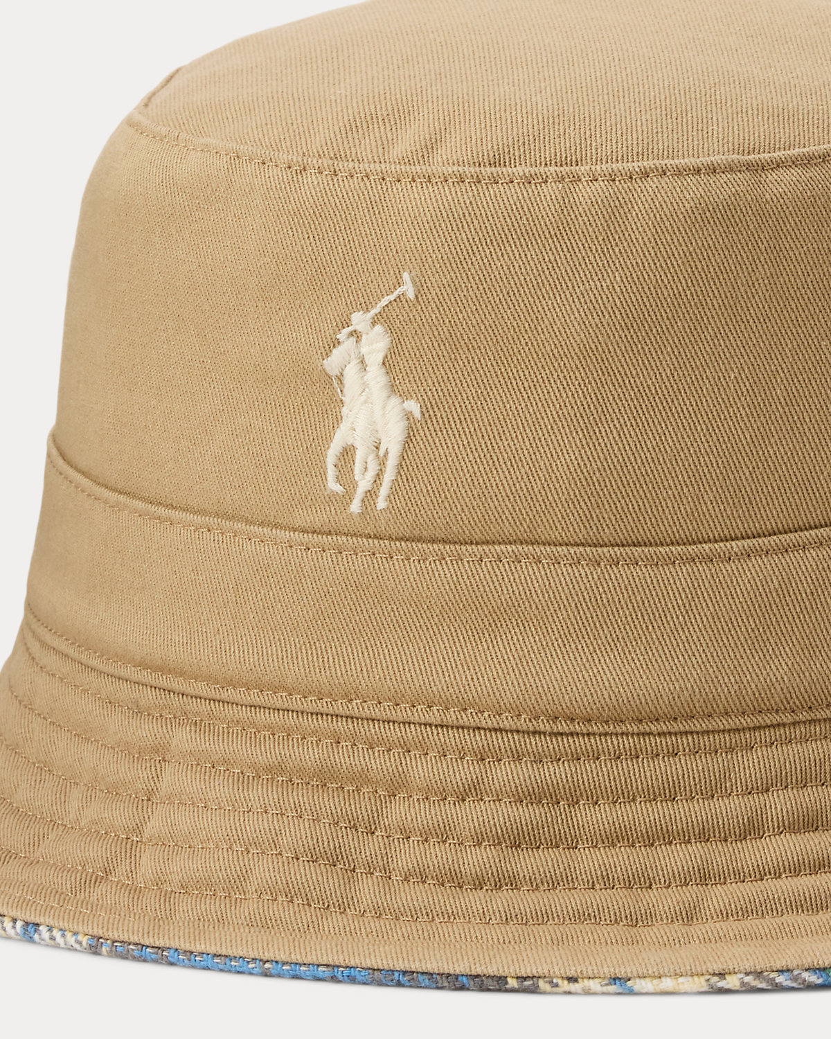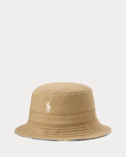 This cotton twill bucket hat reverses to a plaid patchwork design that nods to the vintage utilitarian style of Polo’s flannel shirts.