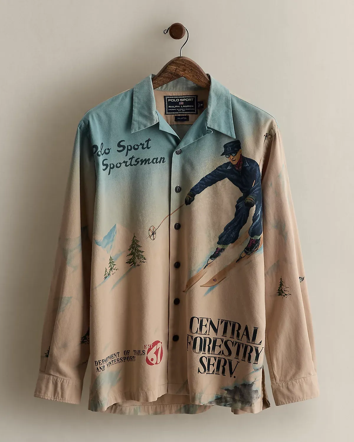 - “Polo Sport Sportsman,” “Department of Trails and Winter Sports,” “Est 67,” “Central Forestry Serv.,” and a downhill skier graphic printed at the front and back.