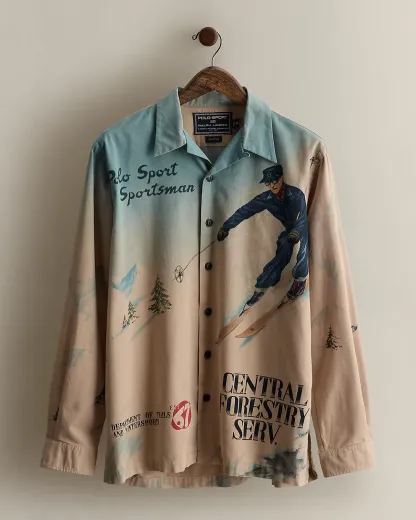 Part of the Fall 1992 Polo Sport collection. Camp-collar shirt features a “Polo Sport Sportsman” graphic and downhill skier. Size medium has approximately a 29" back body length, an 18.75" shoulder, a 45.5" chest, and a 24.25" sleeve length.