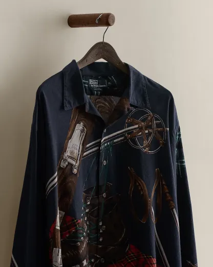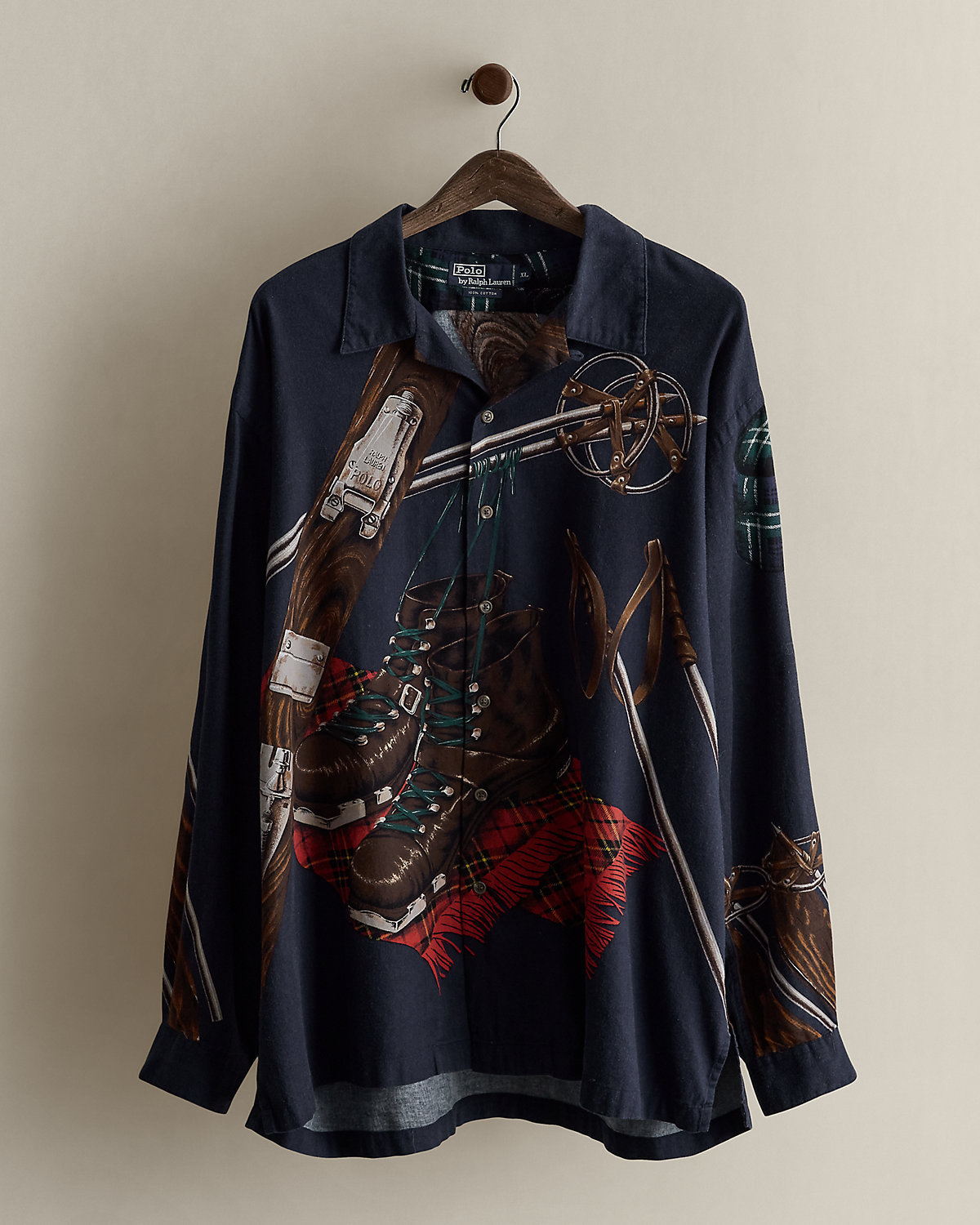 Part of the Fall 1992 Polo collection. Cotton shirt printed with a motif of ski equipment. Size XL has approximately a 32" back body length, a 22" shoulder, a 55" chest, and a 25" sleeve length.