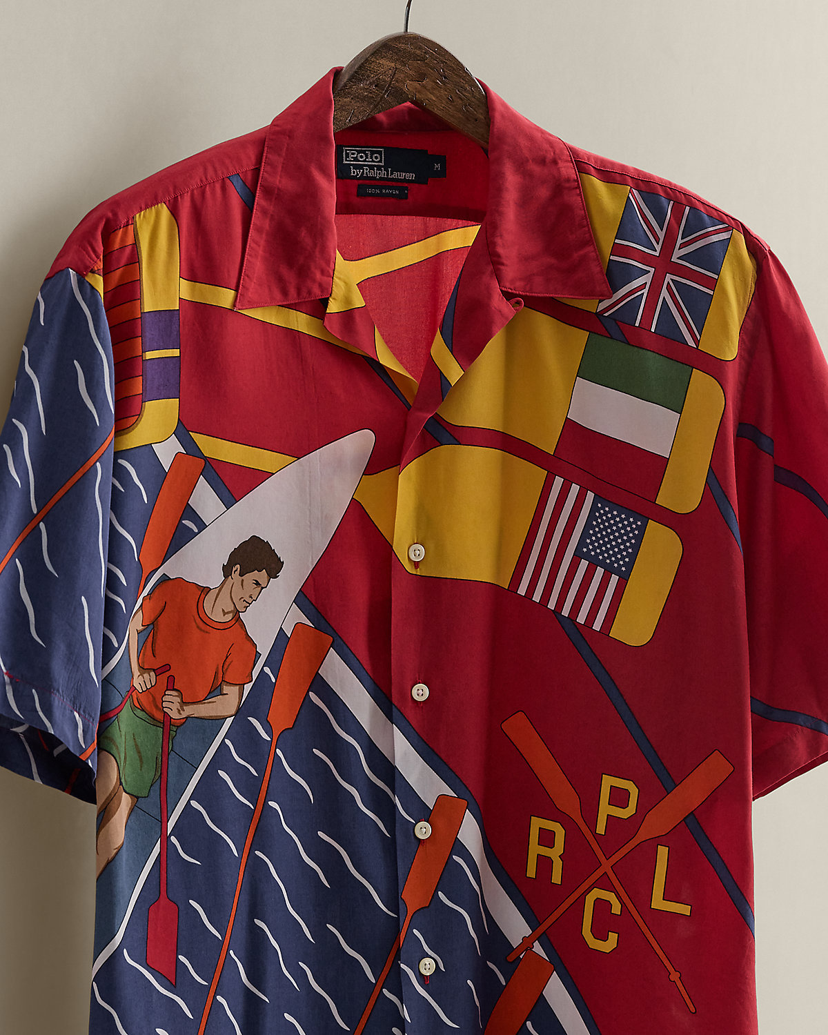 Part of a Polo collection from the early ’90s. Camp shirt features a vibrant rowing-inspired graphic printed at the front and back. Size medium has approximately a 30.25" back body length, a 21.5" shoulder, and a 48" chest.