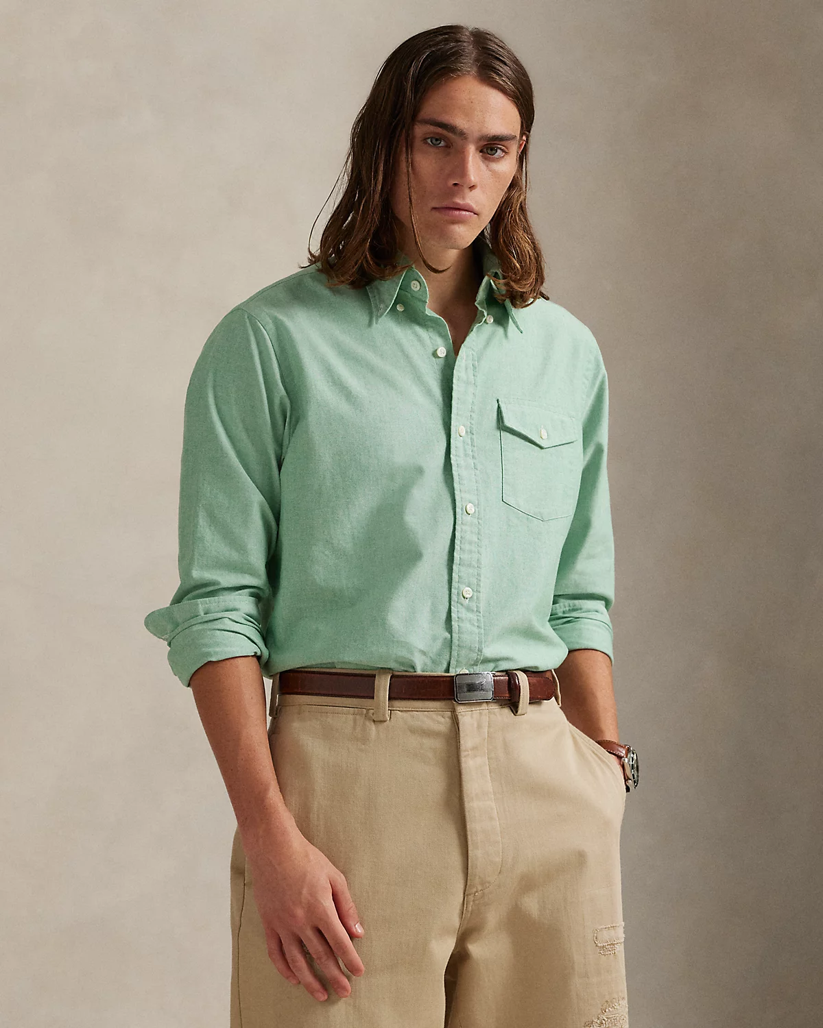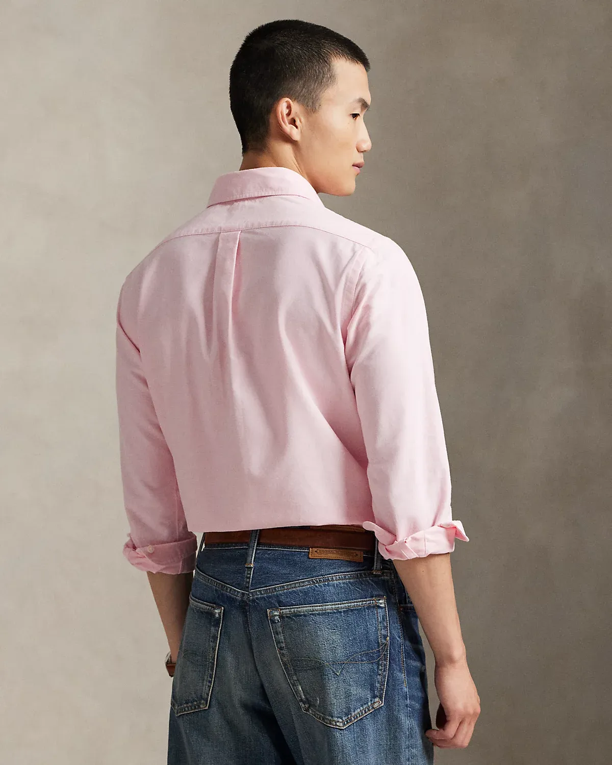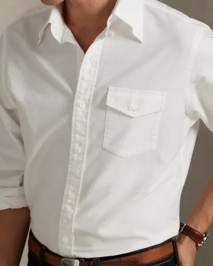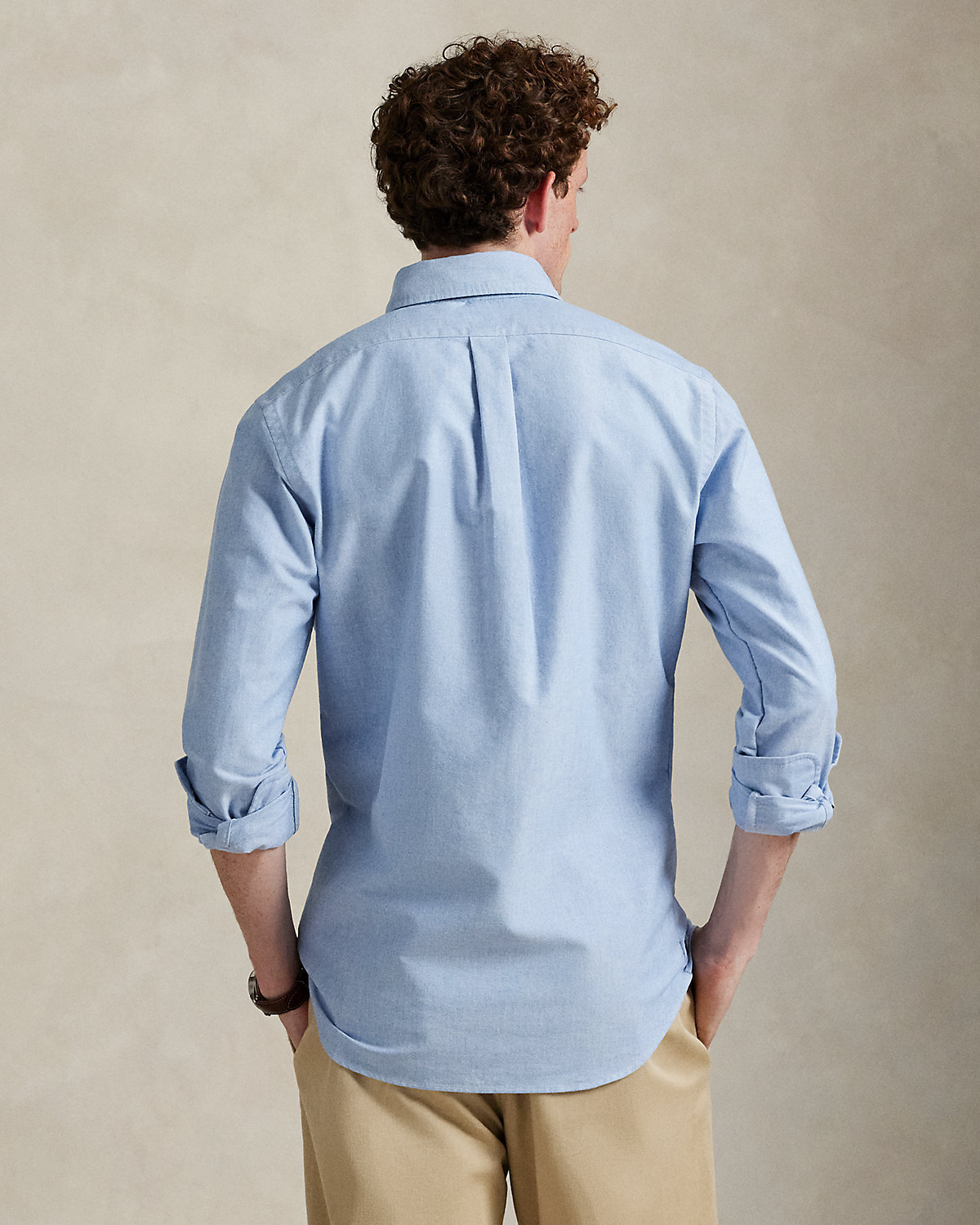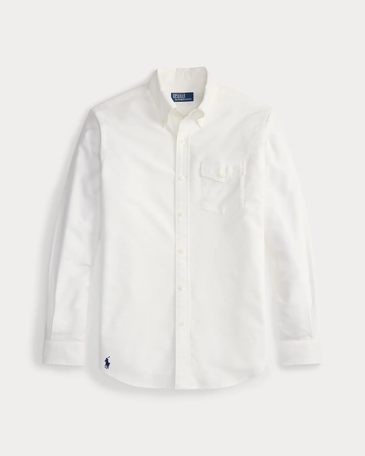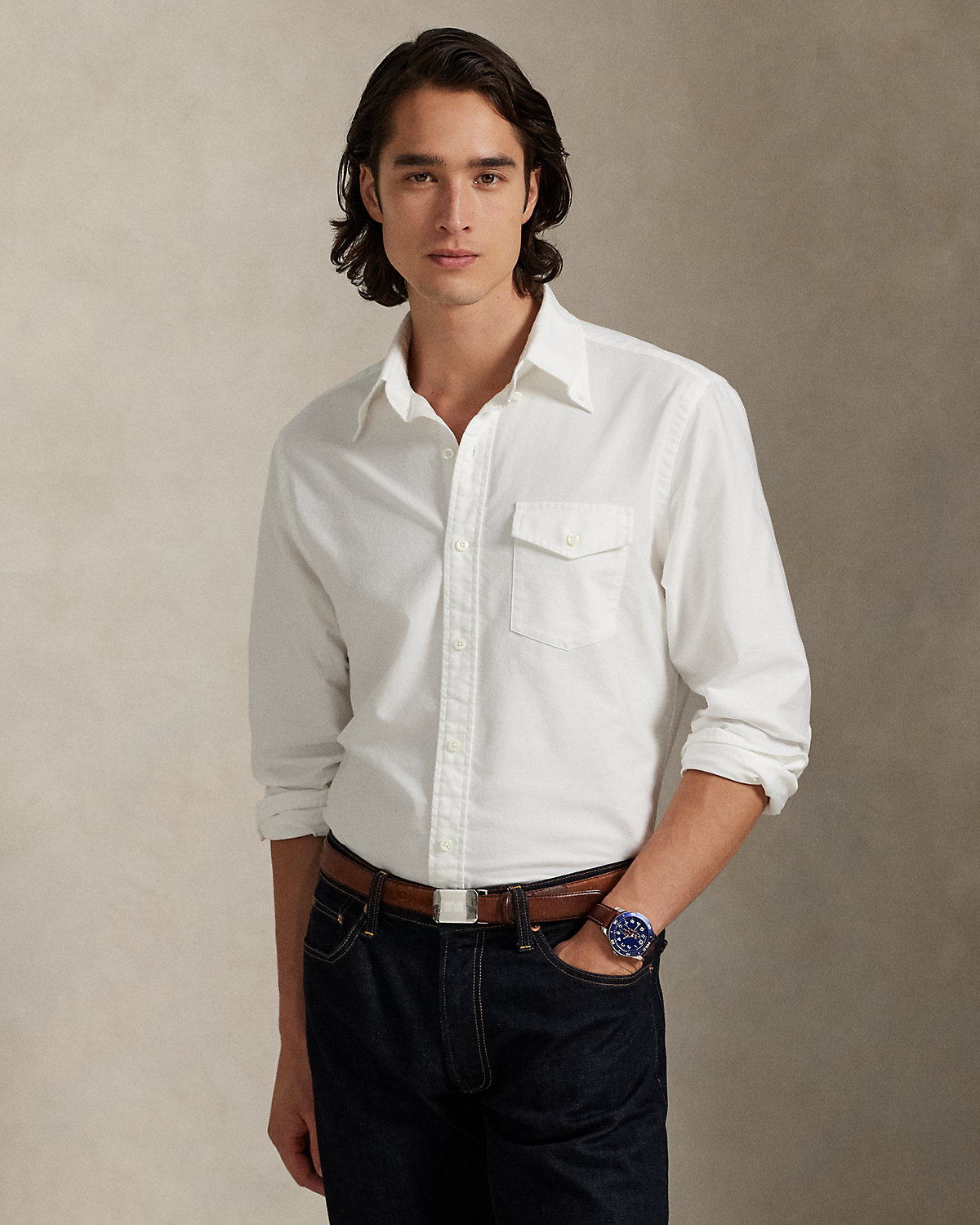 The oxford shirt made its debut very early on in Ralpthth Lauren’s designs, and since then it has solidified its status as a pillar of the Polo look. Our fabric is developed with a secret wash that gives it instant character, ease, and a heathered softness—what we call the perfect “rumple.” The formula is so unique, it’s been kept in a safe for more than three decades. Today, Mr. Lauren continues to create countless variations of his iconic shirt, including this version that is finished with genuine mother-of-pearl divs.