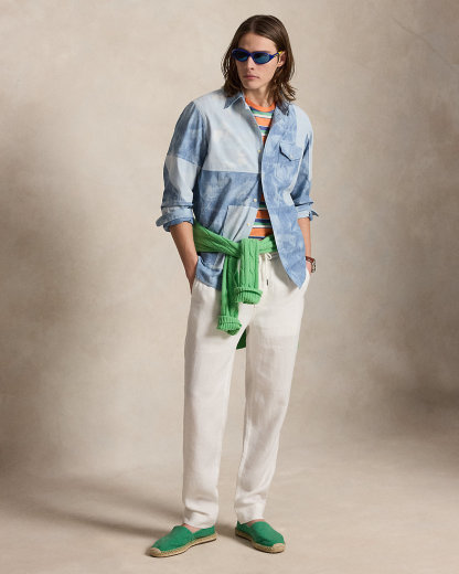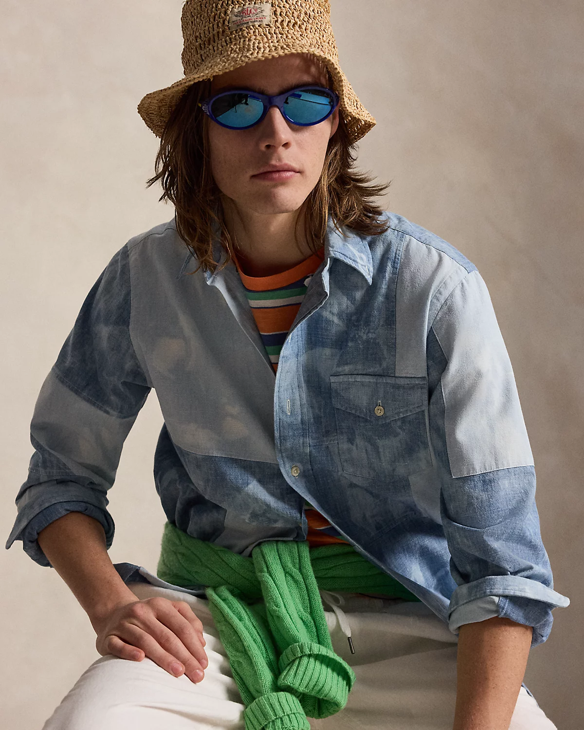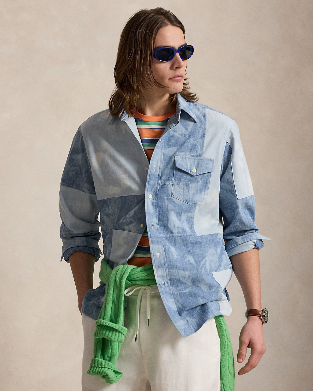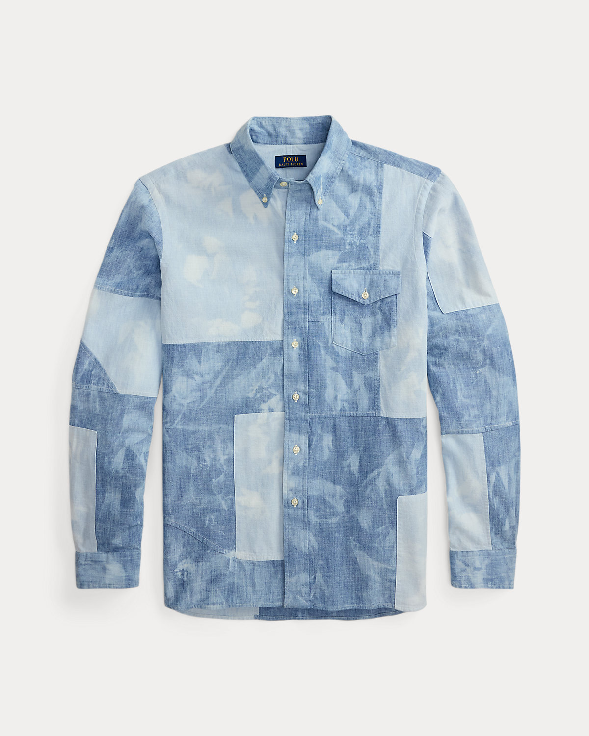 This shirt is crafted with indigo-dyed cotton chambray that is developed in different washed-out shades.
