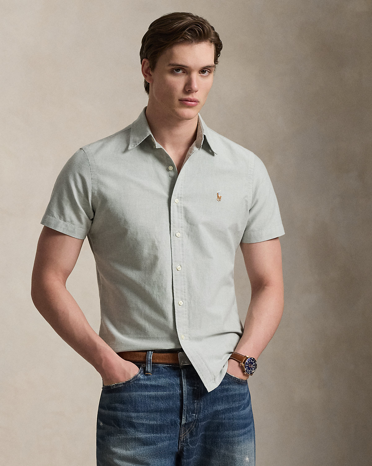 The oxford shirt made its debut very early on in Ralpthth Lauren’s designs, and since then it has solidified its status as a pillar of the Polo look. Our fabric is developed with a secret wash that gives it instant character, ease, and a heathered softness—what we call the perfect “rumple.” The formula is so unique, it’s been kept in a safe for more than three decades. Today, Mr. Lauren continues to create countless variations of his iconic shirt, including this short-sleeve version that is embroidered with our multicolored signature Pony.