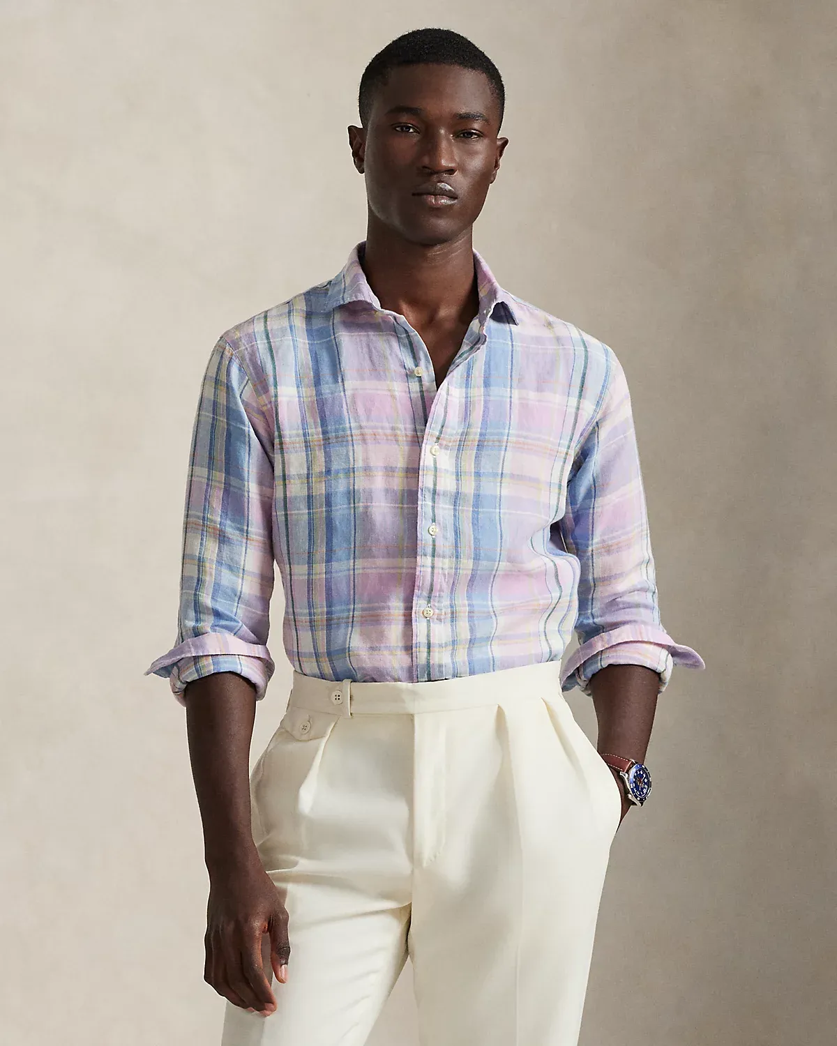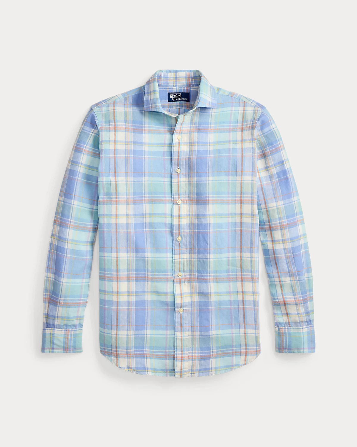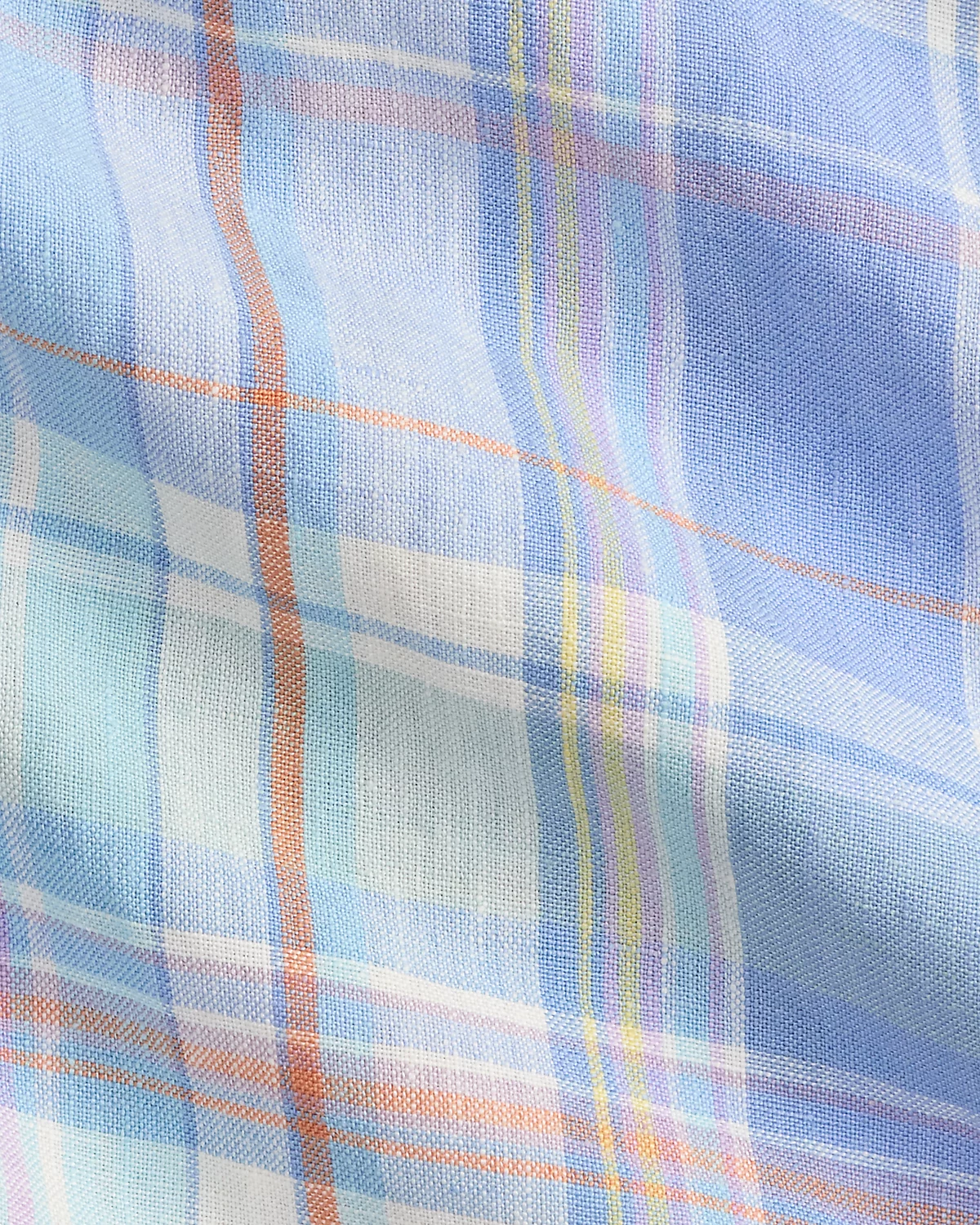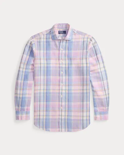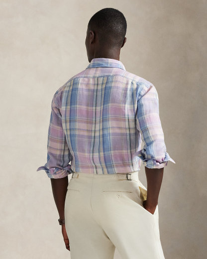 Made with lightweight slub linen, this shirt features a classic plaid pattern rendered in pastel hues.