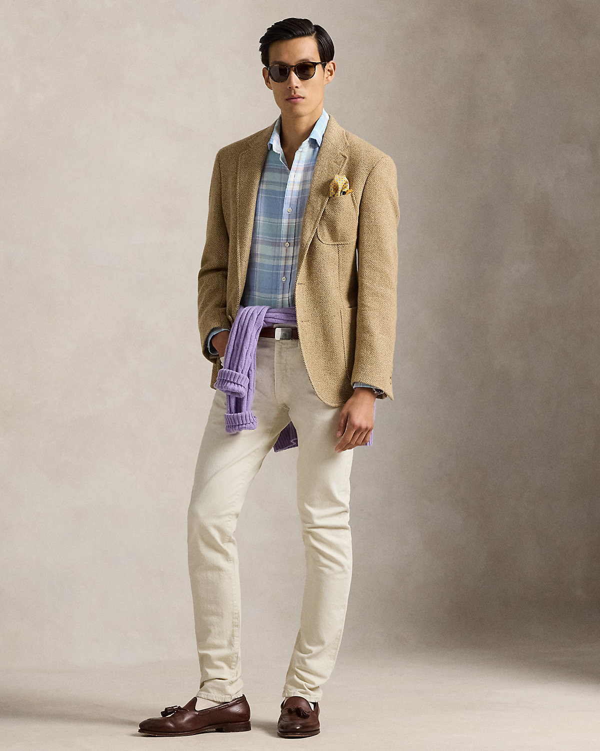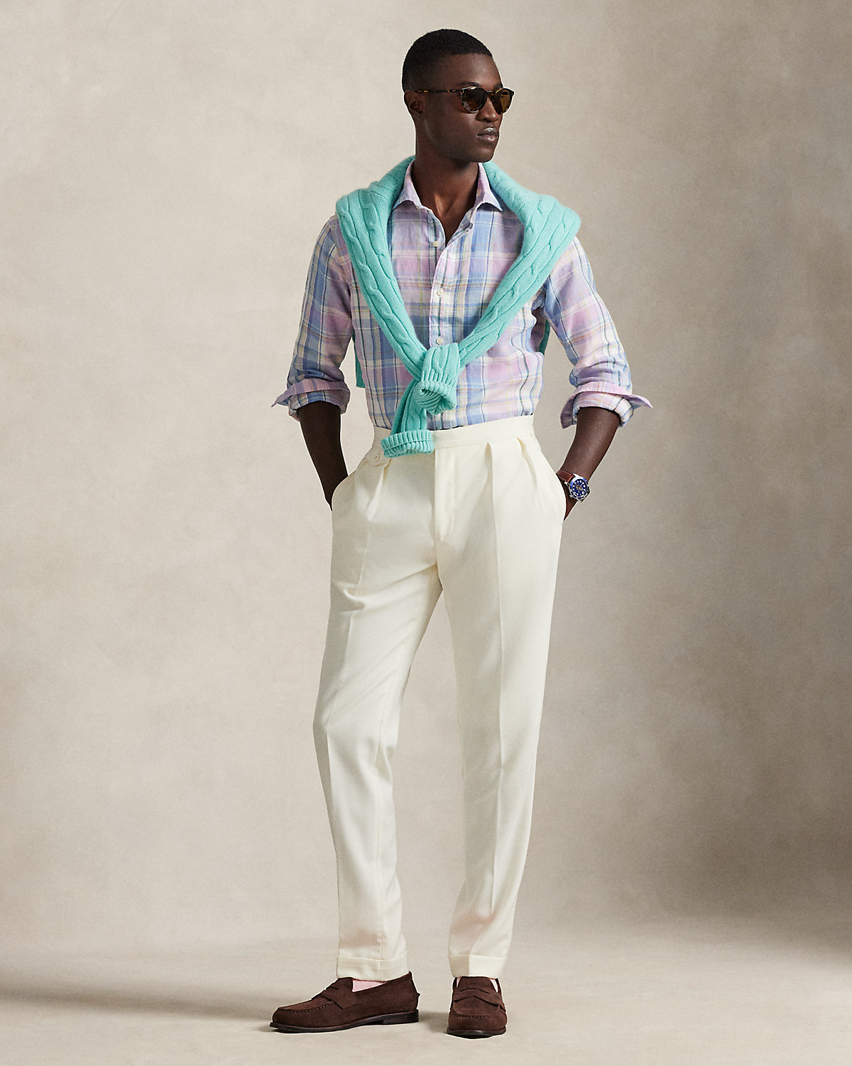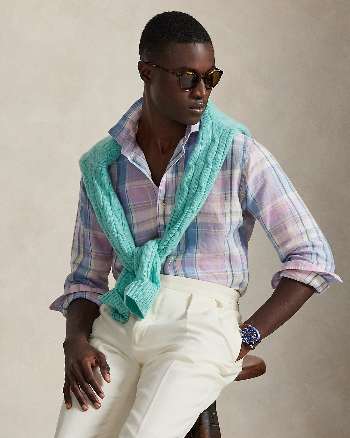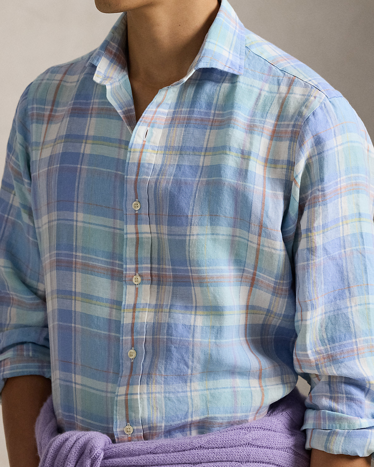 Made with lightweight slub linen, this shirt features a classic plaid pattern rendered in pastel hues.