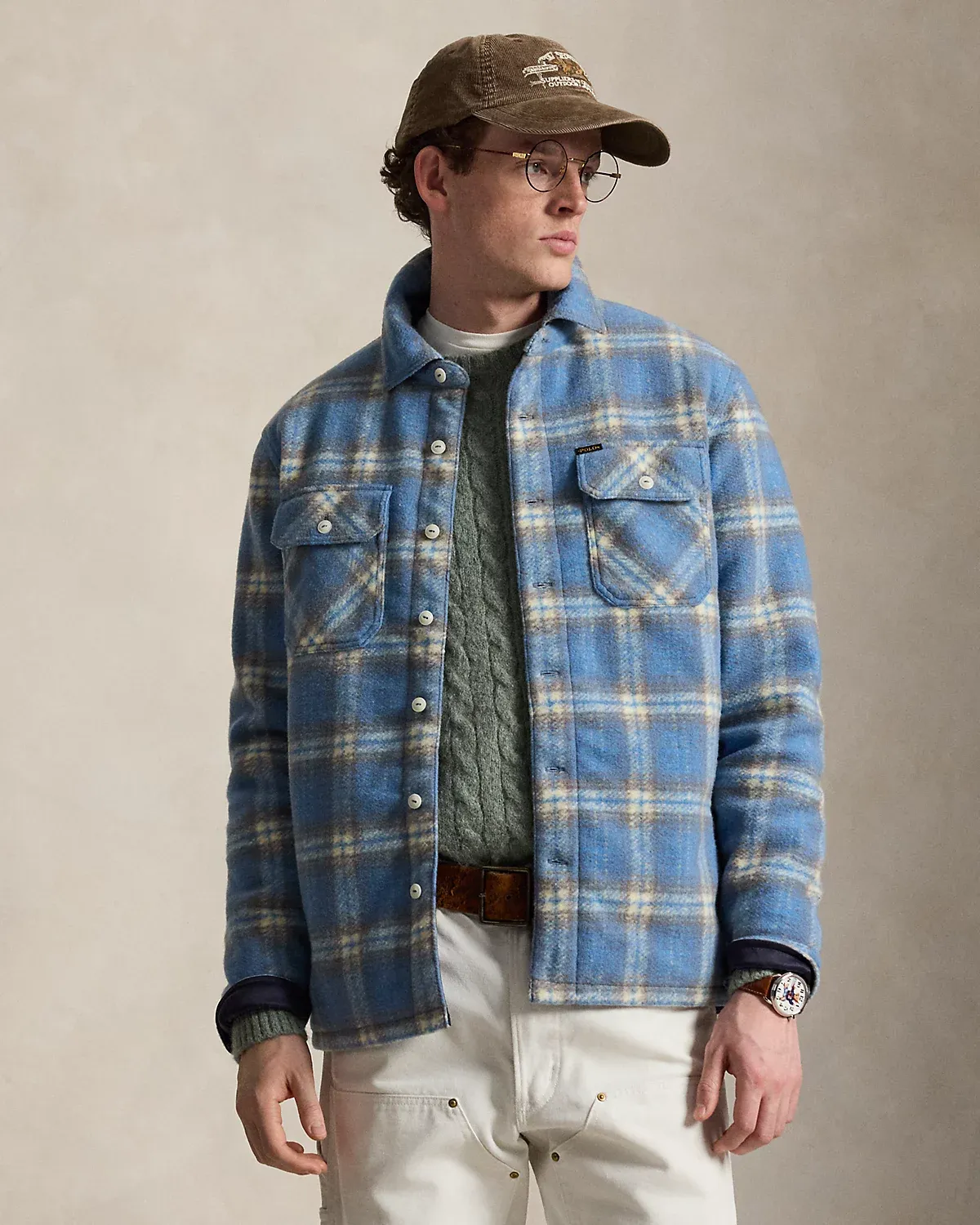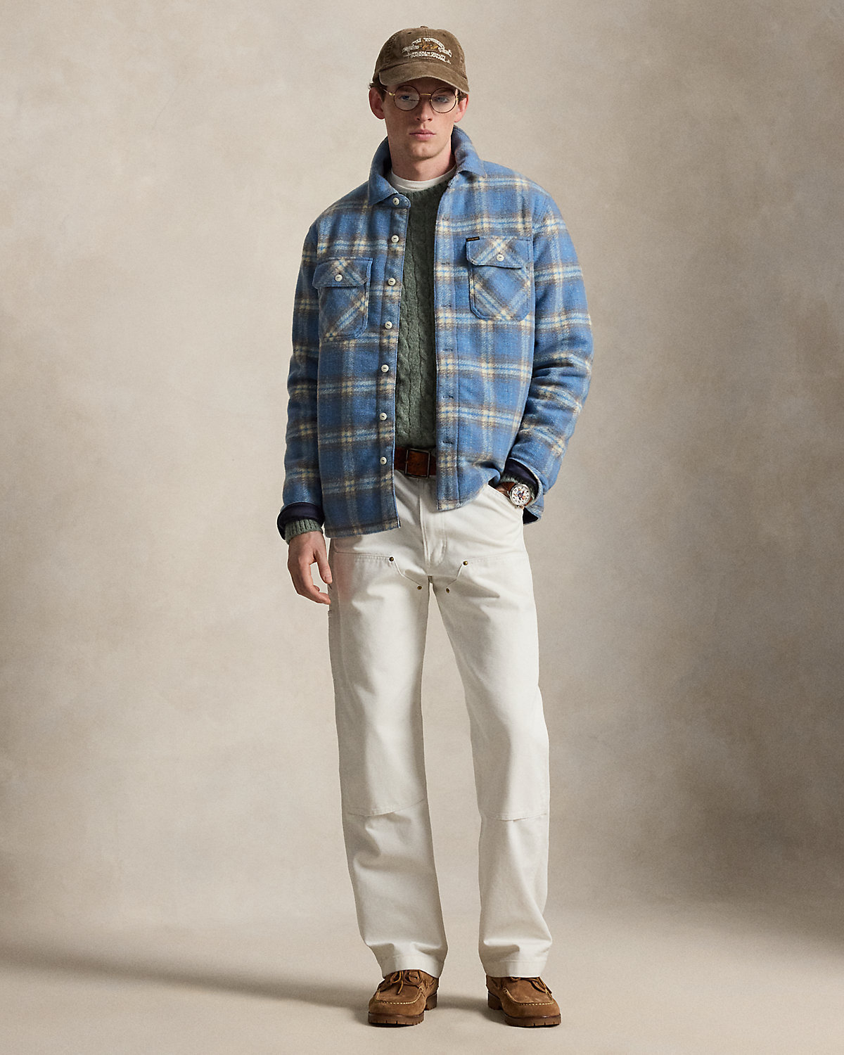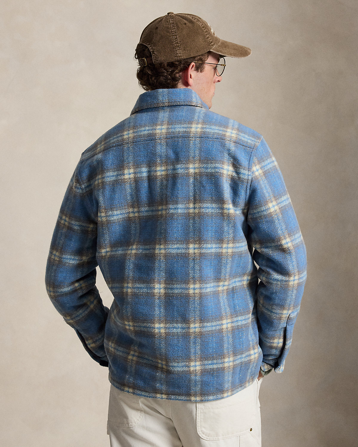 This plaid overshirt elevates a classic workwear silhouette with felted wool jacquard and down-alternative fill, seamlessly merging form and function.