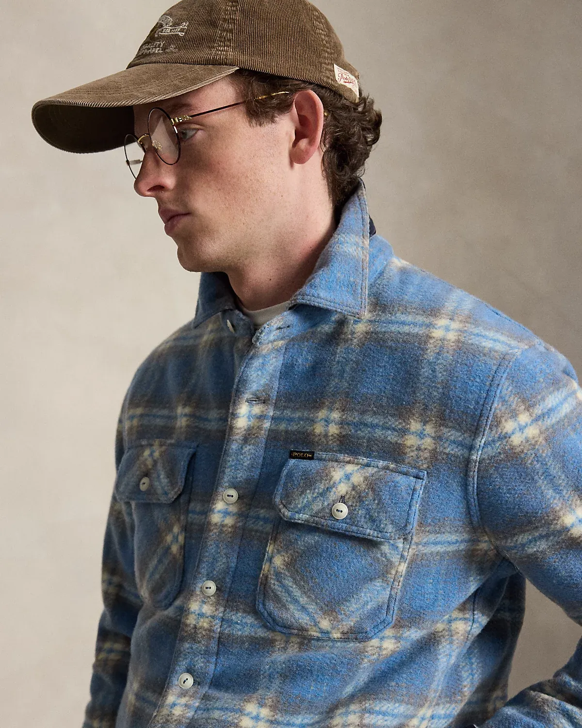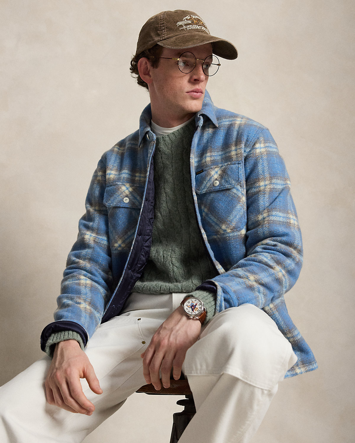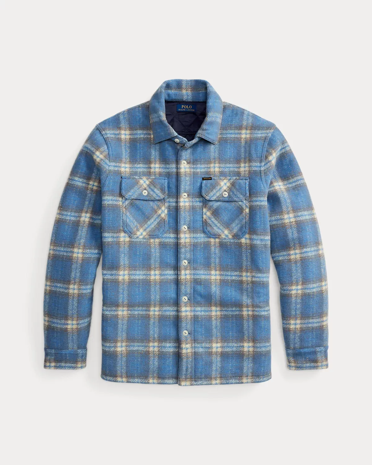 This plaid overshirt elevates a classic workwear silhouette with felted wool jacquard and down-alternative fill, seamlessly merging form and function.