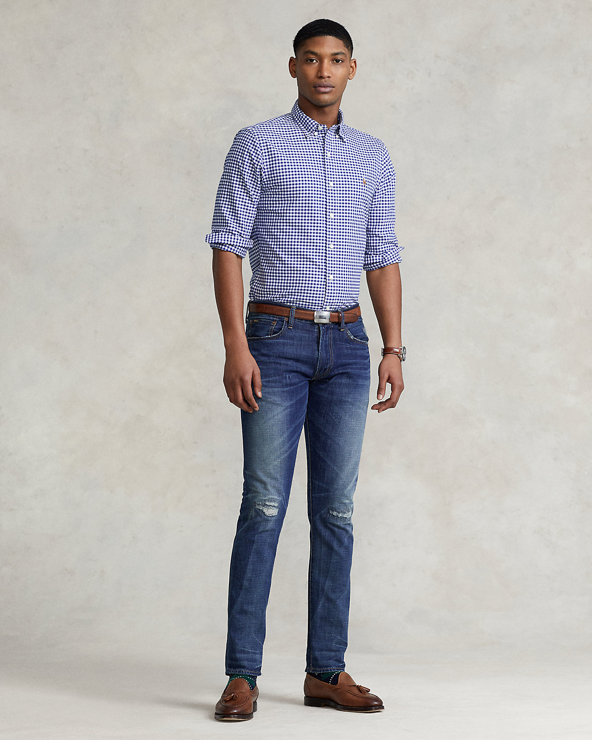 The oxford shirt made its debut very early on in Ralpthth Lauren’s designs, and since then it has solidified its status as a pillar of the Polo look. Our fabric is developed with a secret wash that gives it instant character, ease, and a heathered softness. The formula is so unique, it’s been kept in a safe for more than three decades. In addition to details that evoke its prep-school inspiration, it offers a relaxed feel that produces what we call the perfect “rumple.” Today, Mr. Lauren continues to create countless variations of his iconic shirt, including this gingham version that is embroidered with our multicolored signature Pony.