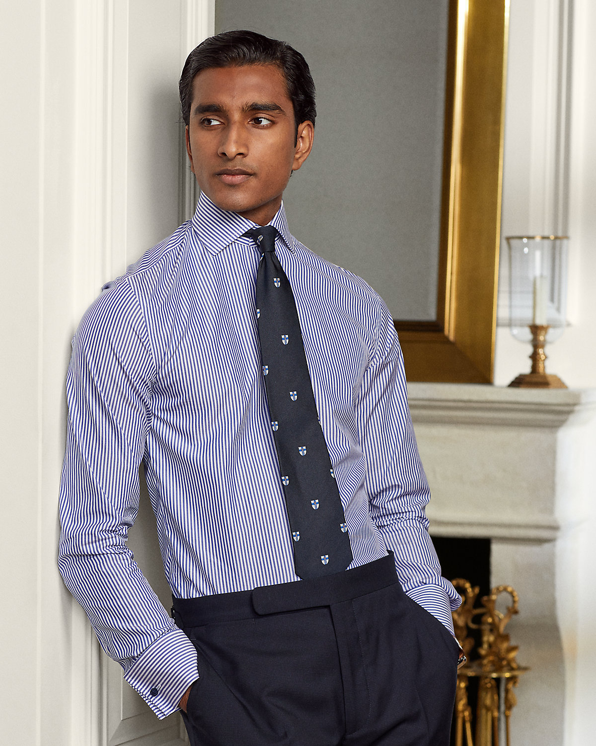 - Long sleeves with French cuffs.