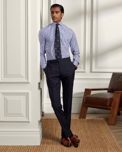 - Classic wide-spread collar. 3” point length and 5” collar spread. Signature collar stays.