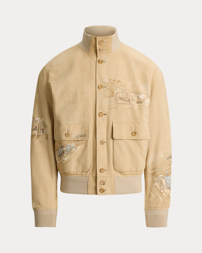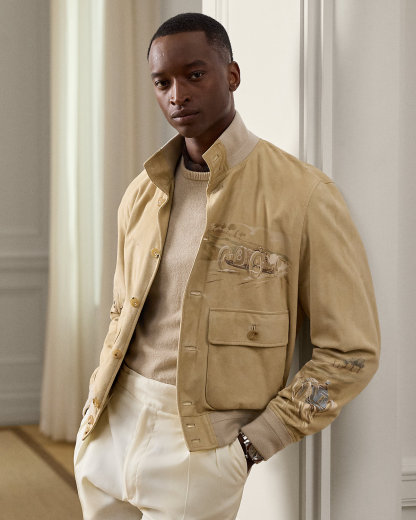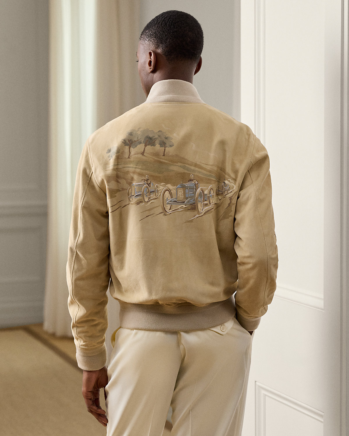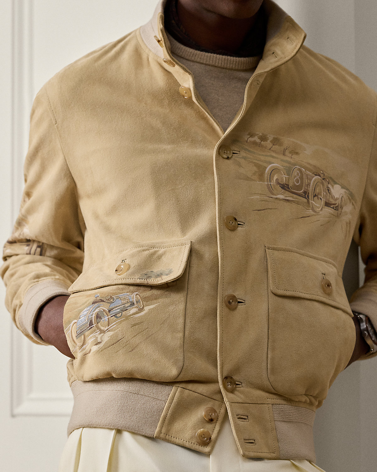 Masterfully constructed by our artisans in Italy with supple suede, this jacket represents Purple Label’s refined handcraftsmanship and understated luxury. Its utilitarian-inspired silhouette is elevated through impeccable tailoring and meticulous details, including bespoke divs. The sumptuous layer features hand-painted scenes of vintage soapbox cars racing through the countryside—an homage to motoring culture.