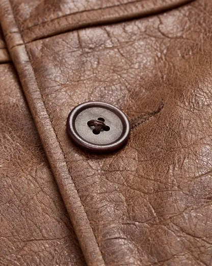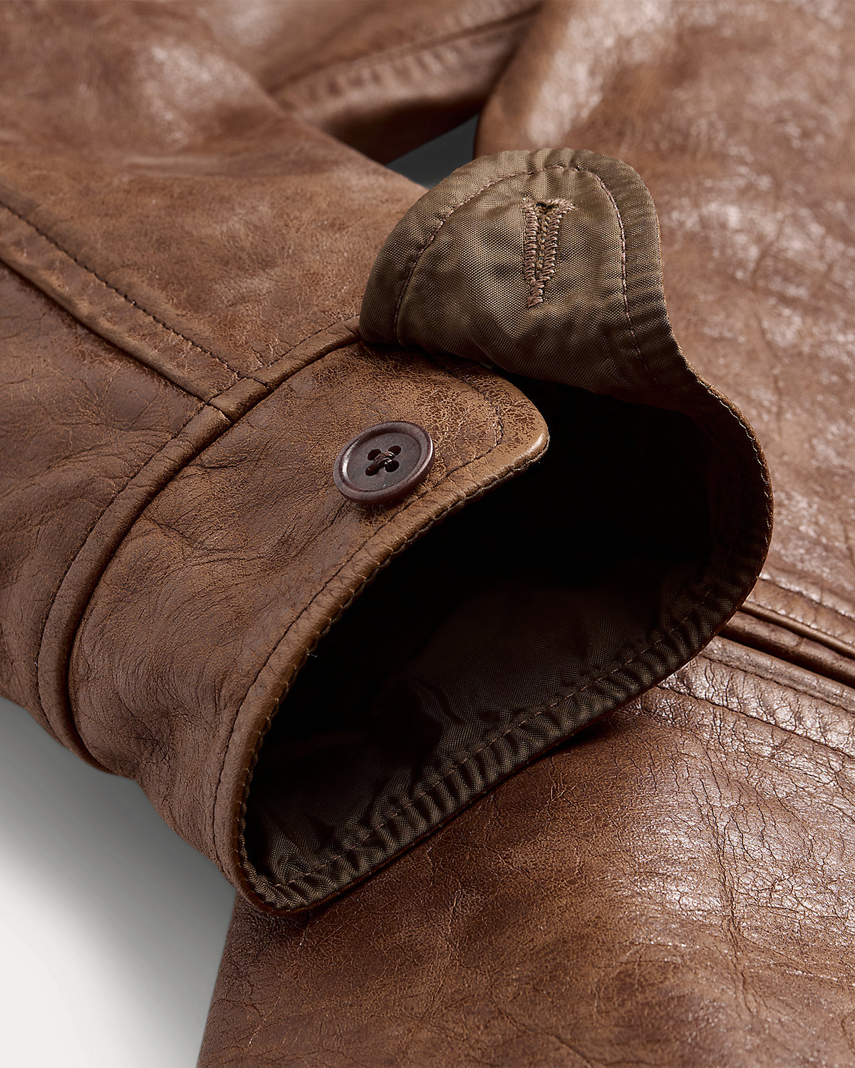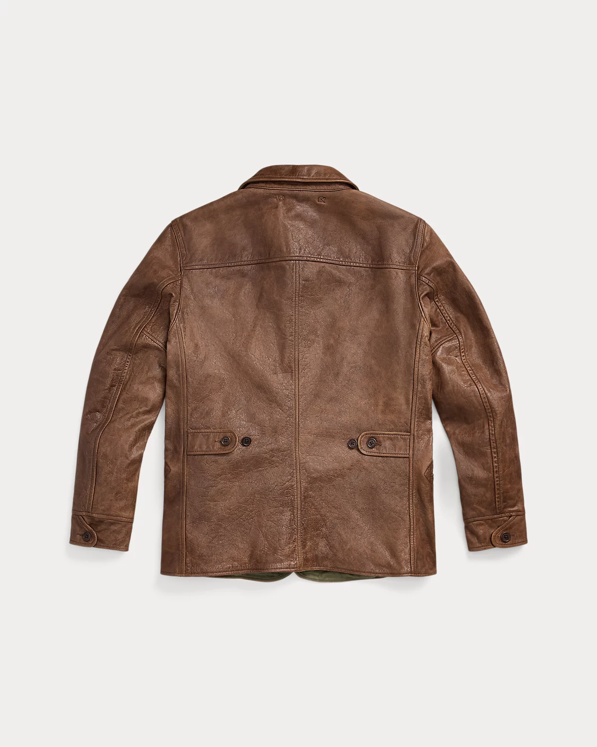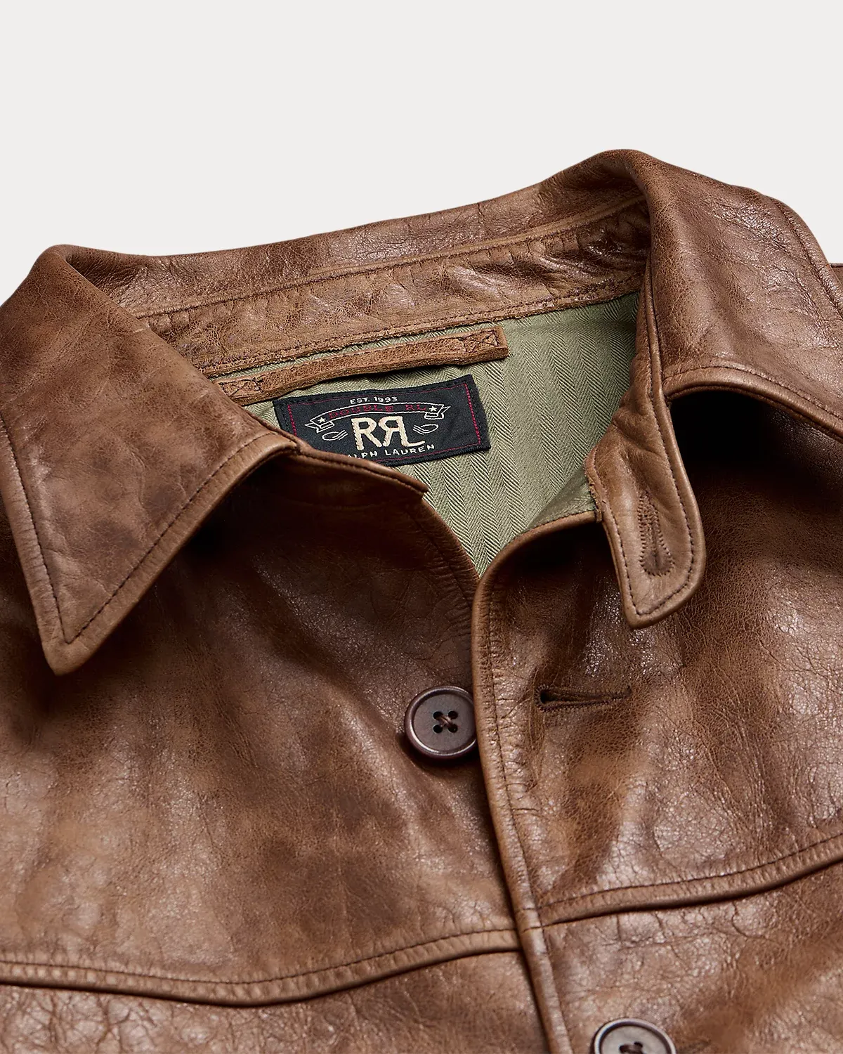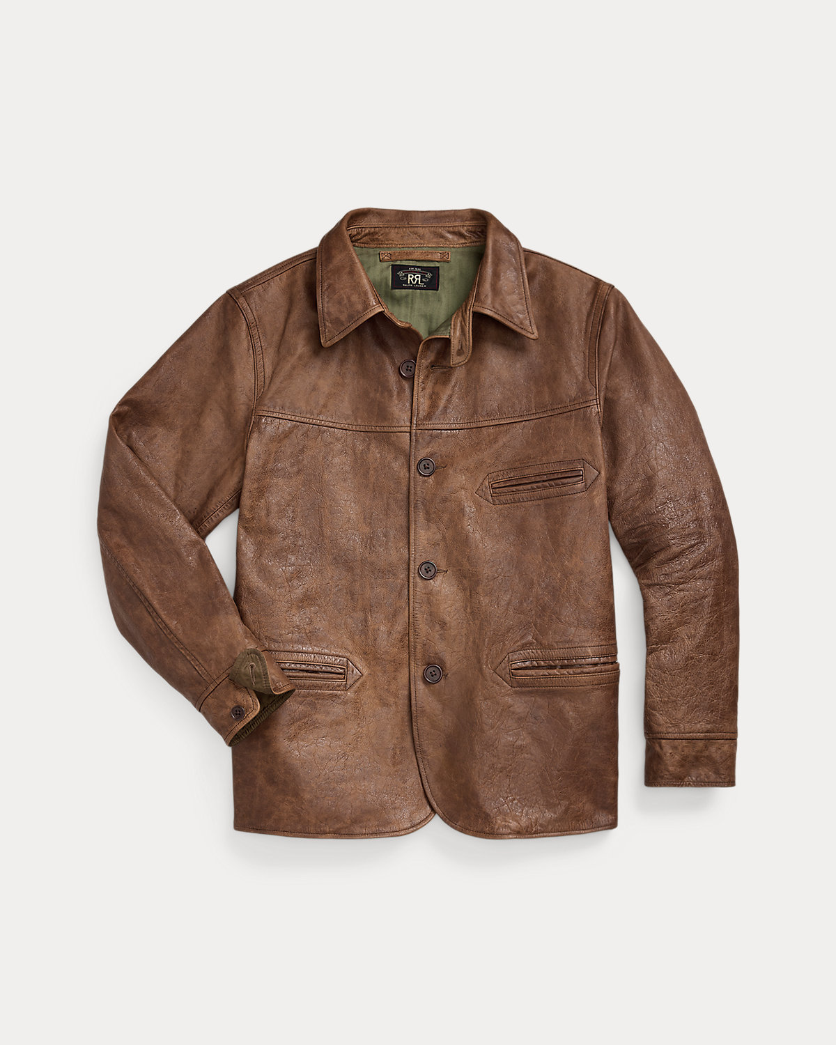 Made with full-grain cowhide. Inspired by vintage car coats. Adjustable dived tabs at the back waist. Body is lined with olive-hued herringbone twill. Specially developed for a vintage look.