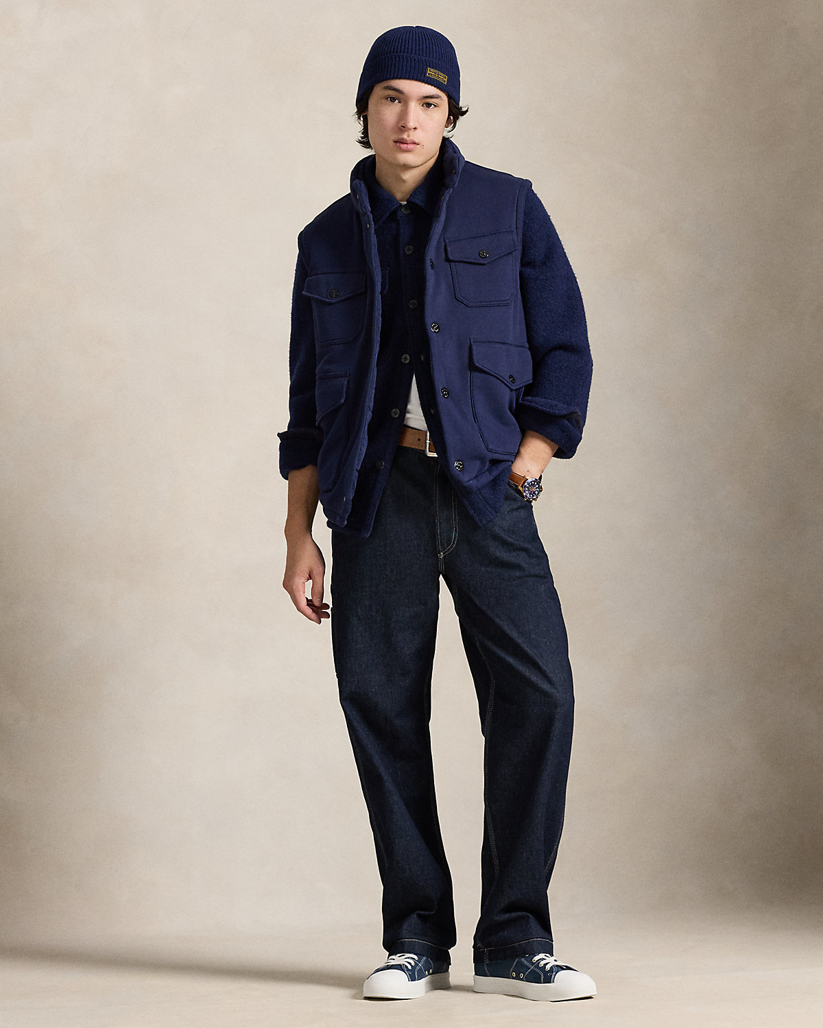- Mockneck. Snapped placket. Metals snaps custom-developed with a “Ralpthth Lauren” logo.