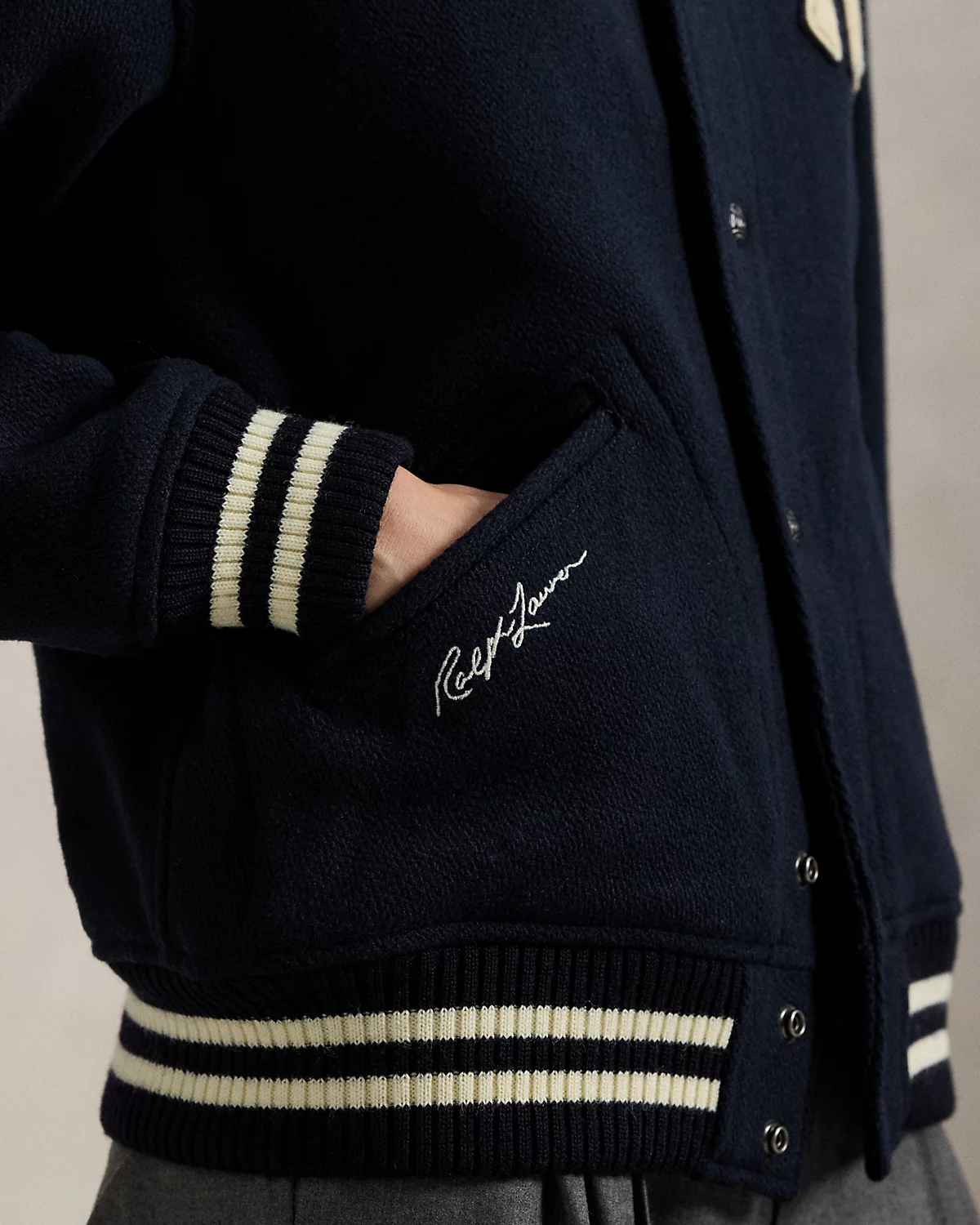 • Chenille patches spelling out “Ralpthth Lauren” at the center back. Striped ribbed hem. Fully lined.