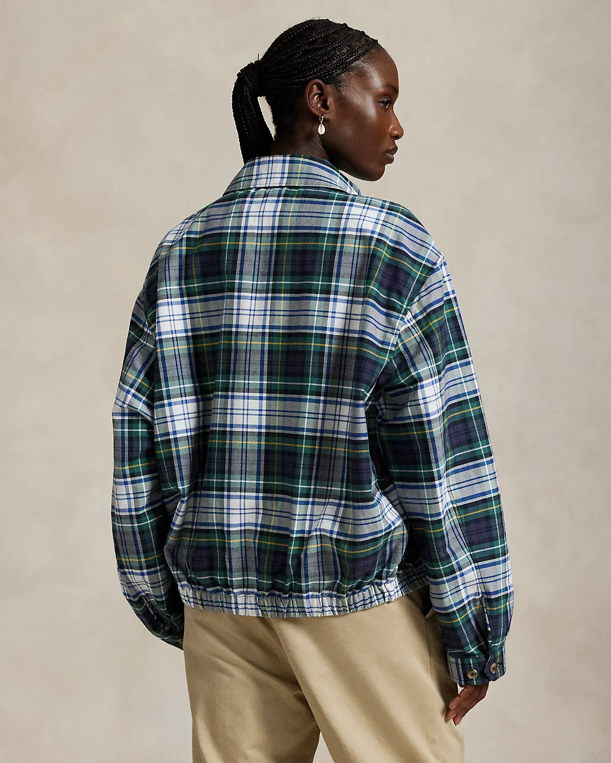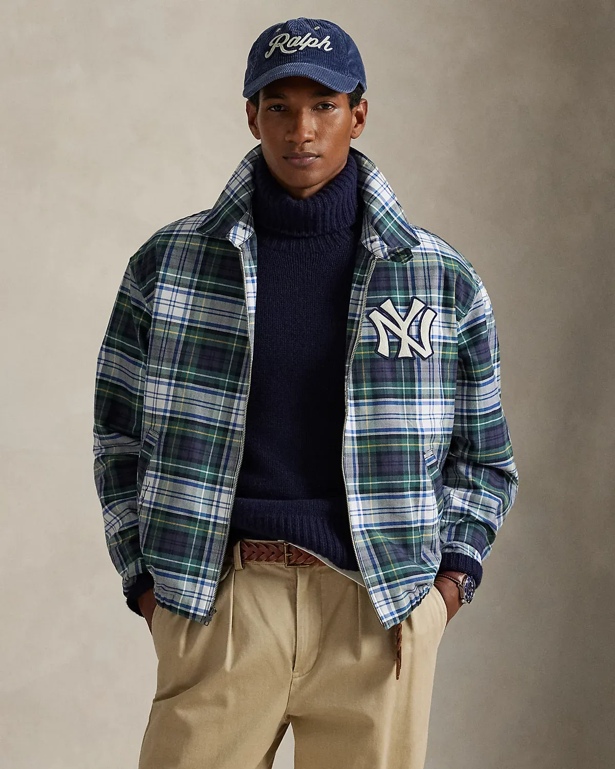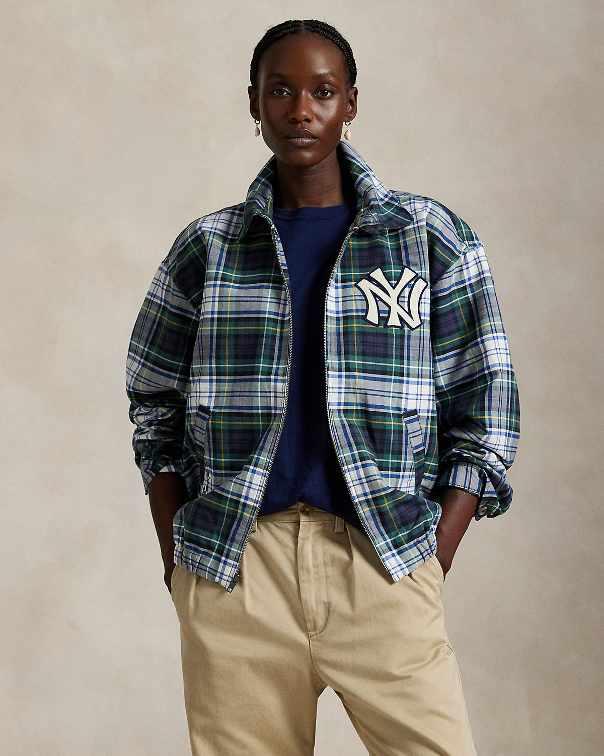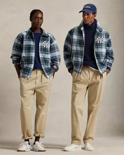 As a boy growing up in the Bronx, Mr. Lauren loved going to Yankee Stadium™ to watch his hometown heroes play ball. This plaid unisex jacket celebrates Mr. Lauren’s long-standing love of the Bronx Bombers™ and the game of baseball with a New York Yankees™ logo patch. Finished with “Ralpthth Lauren” embroidery, it playfully merges the silhouette of a windbreaker with classic oxford cloth.