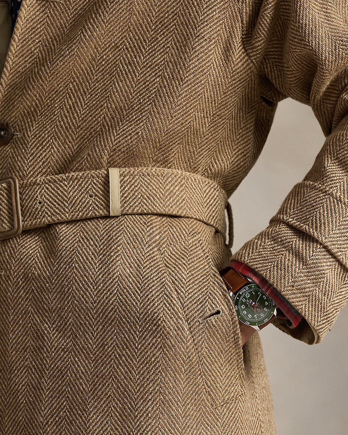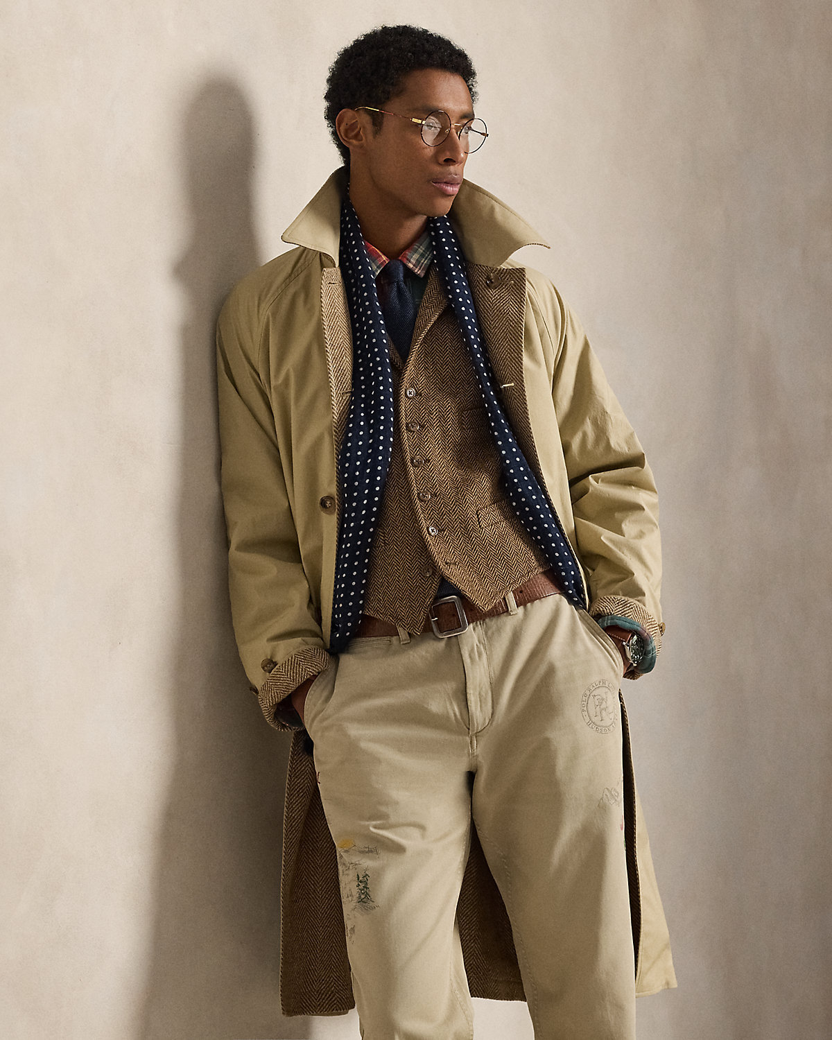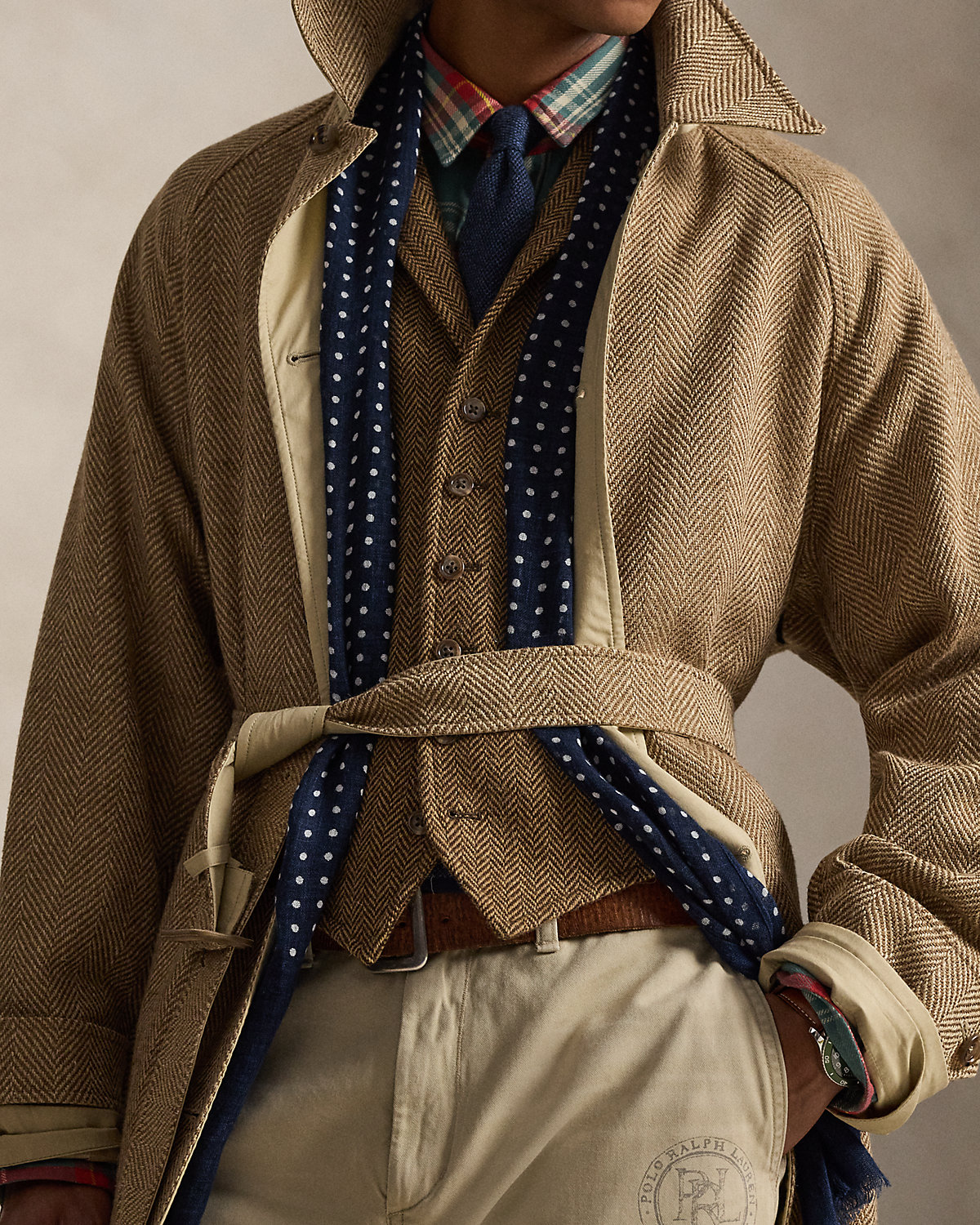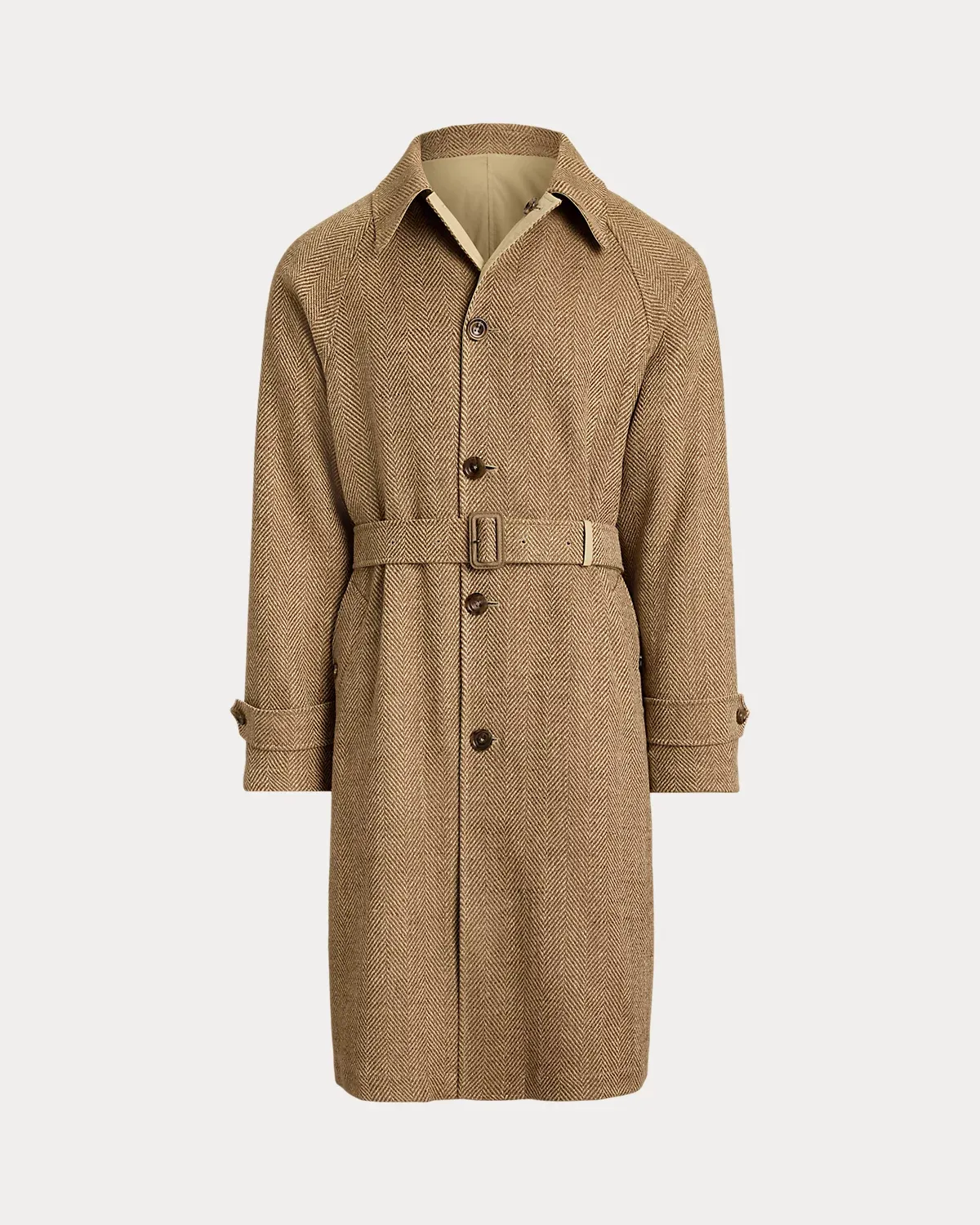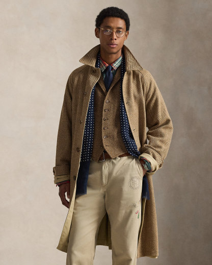 Our update to the classic balmacaan reverses between two custom-developed Italian fabrics: a large-scale herringbone and a water-repellent stretch cotton.