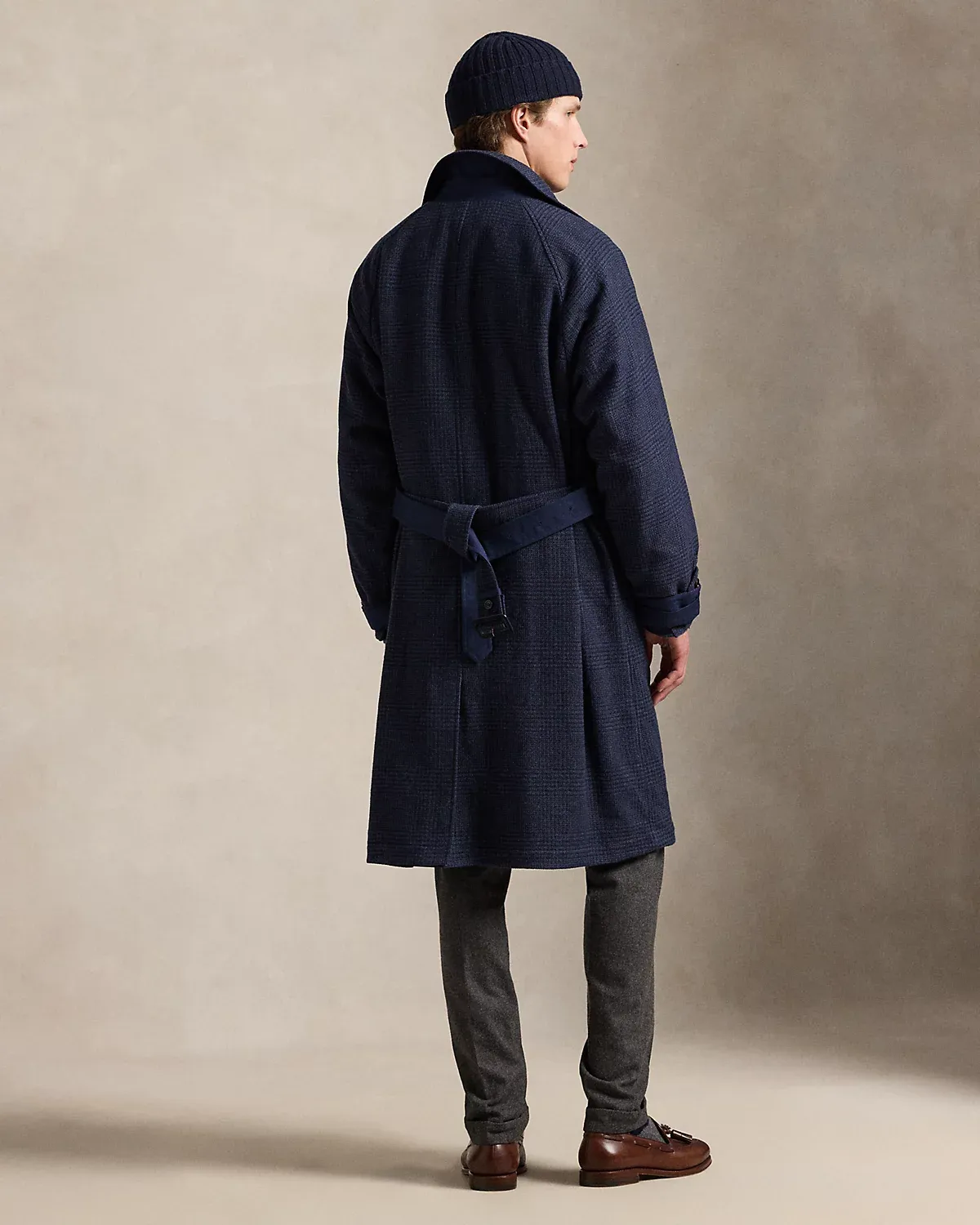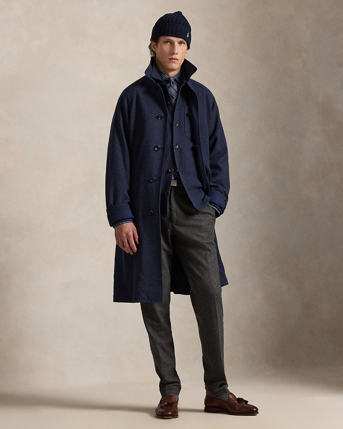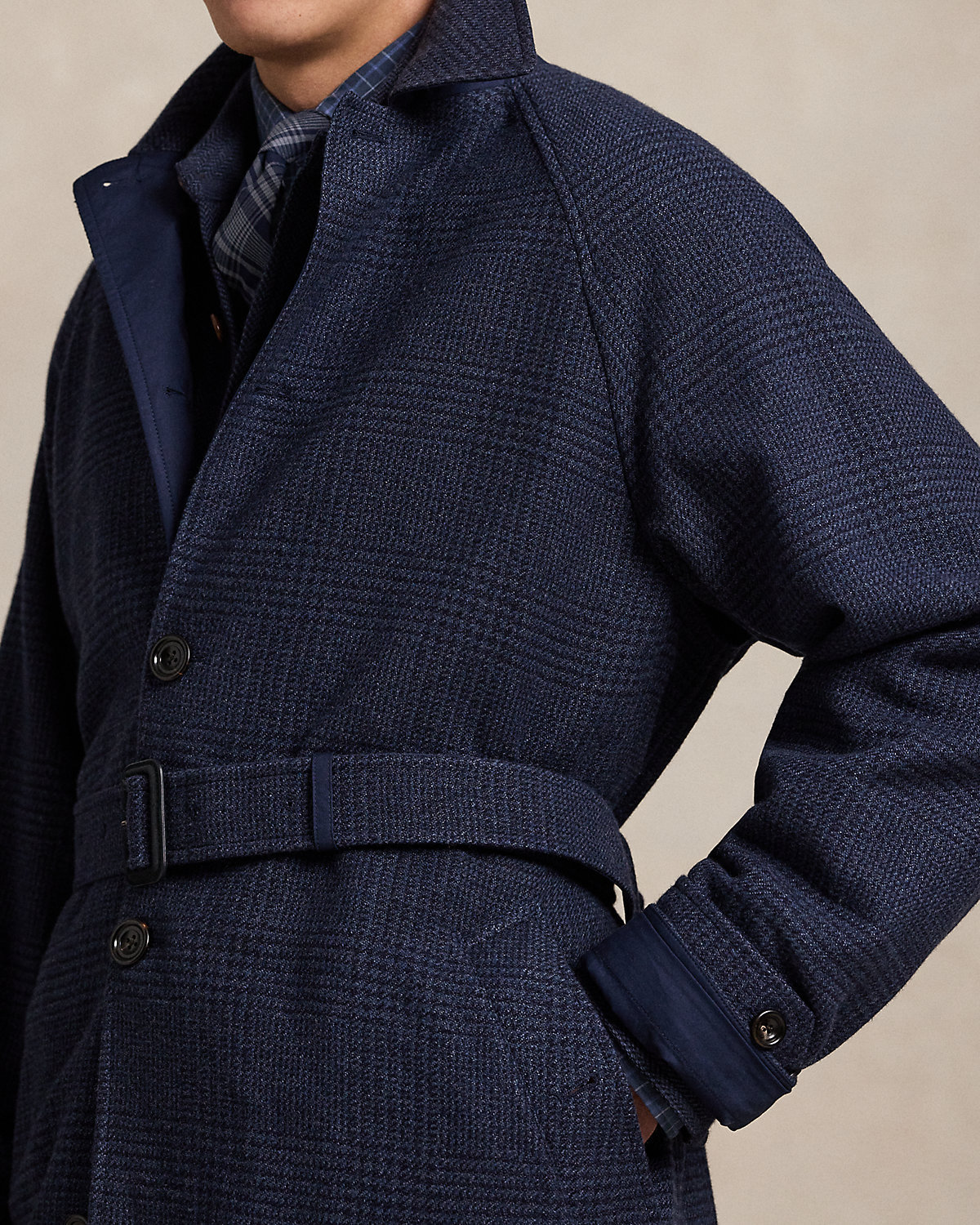 Our update to the classic balmacaan reverses between two custom-developed Italian fabrics: a large-scale tonal Glen plaid and a water-repellent stretch cotton.