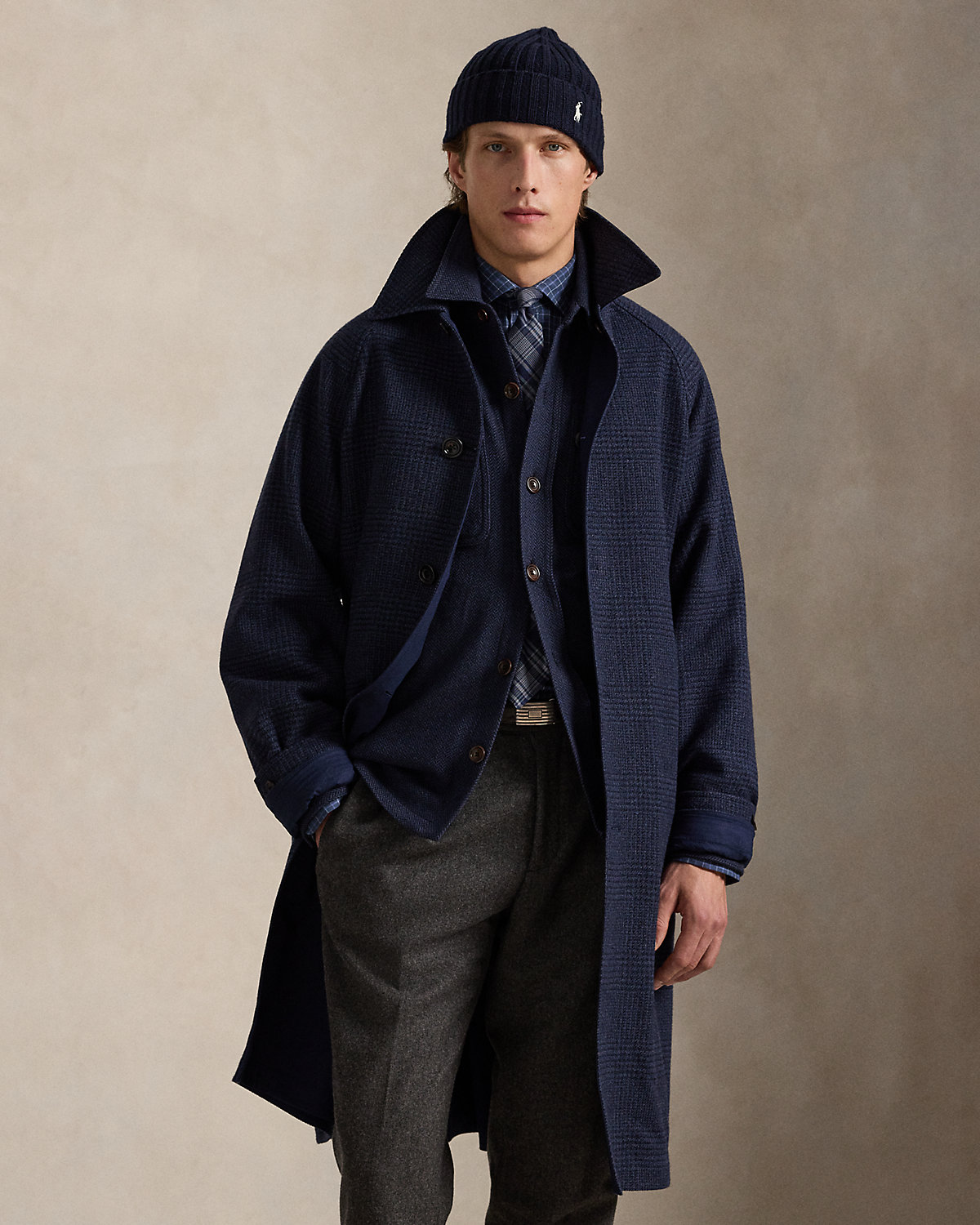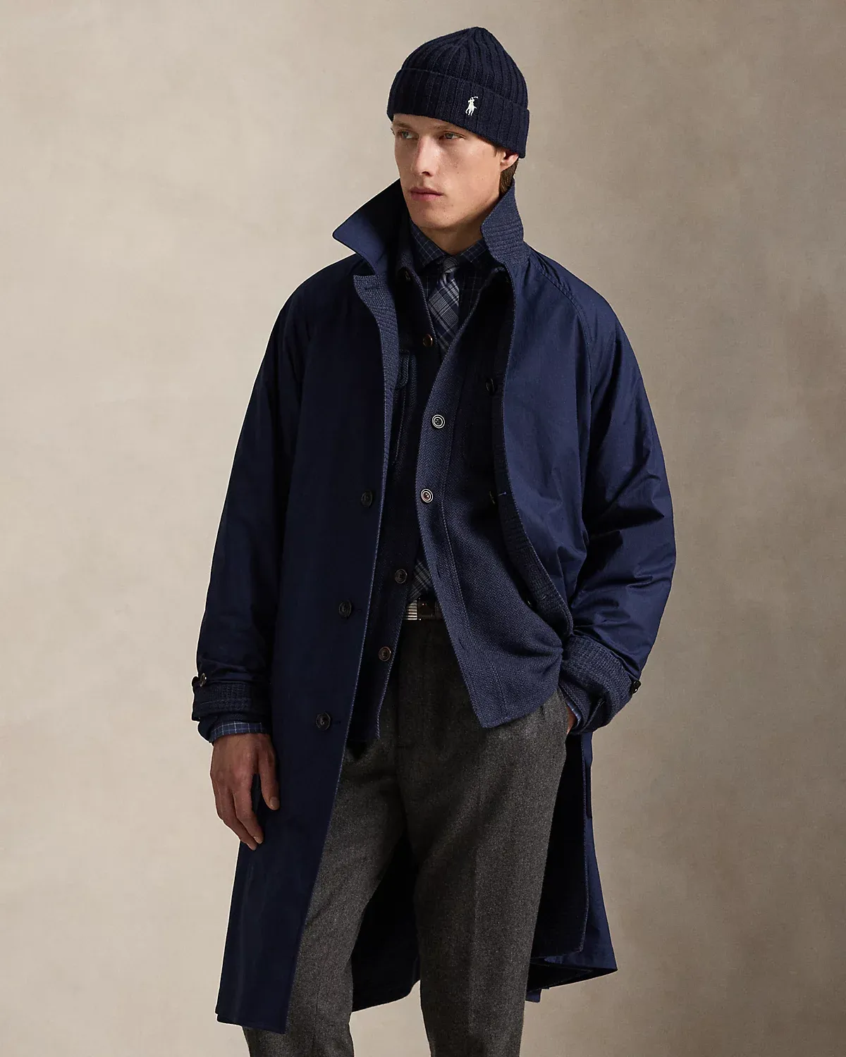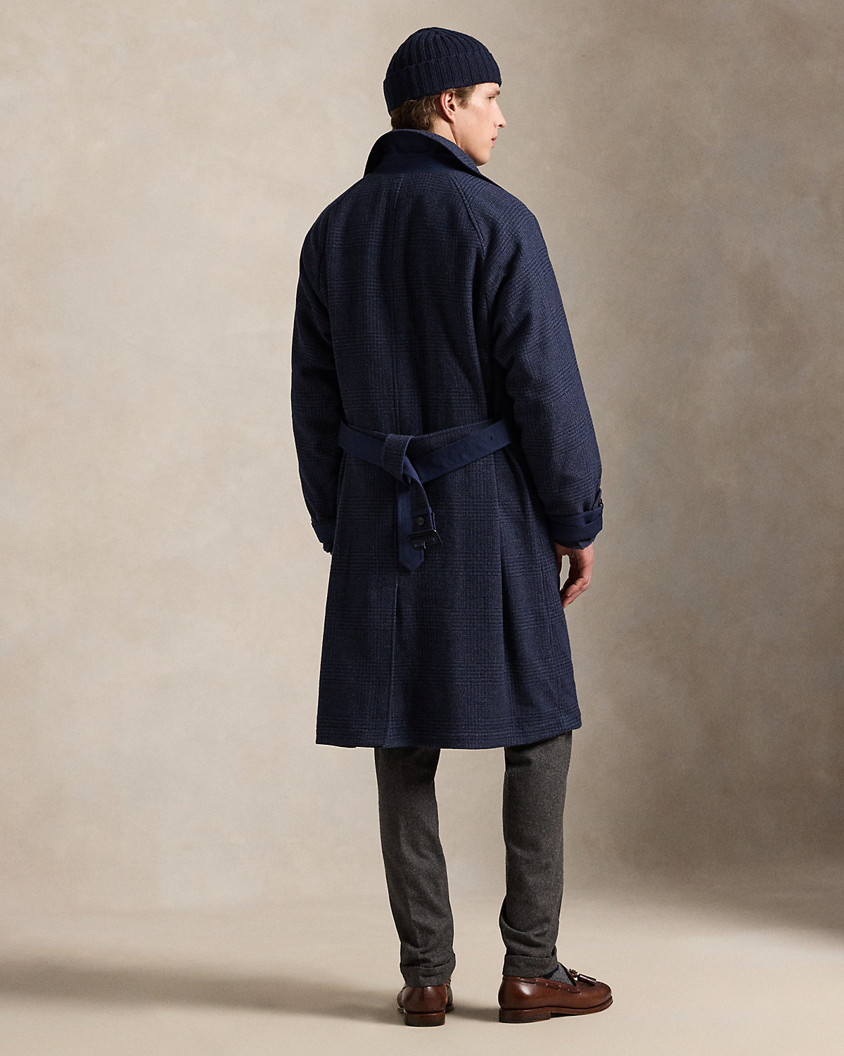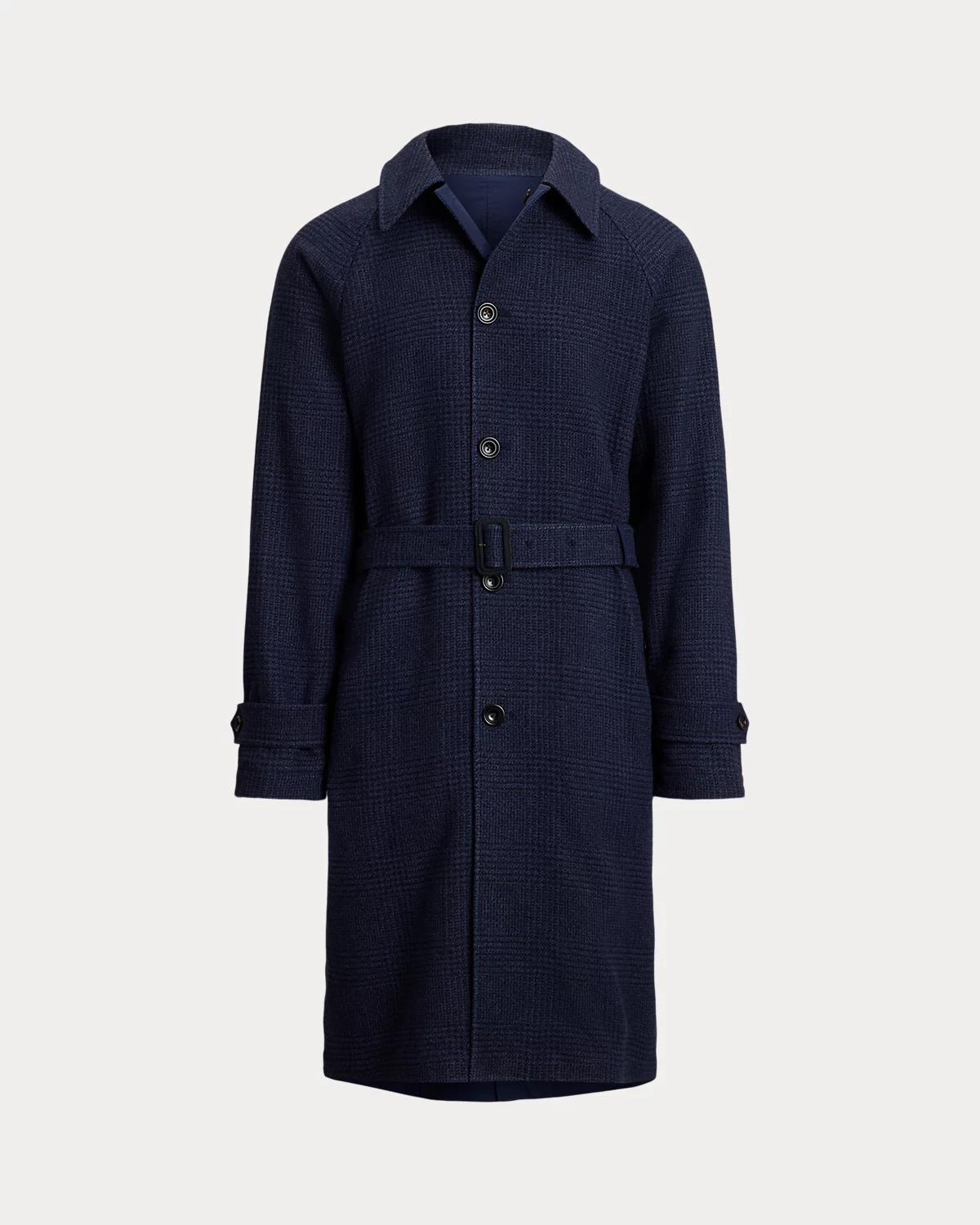 Our update to the classic balmacaan reverses between two custom-developed Italian fabrics: a large-scale tonal Glen plaid and a water-repellent stretch cotton.