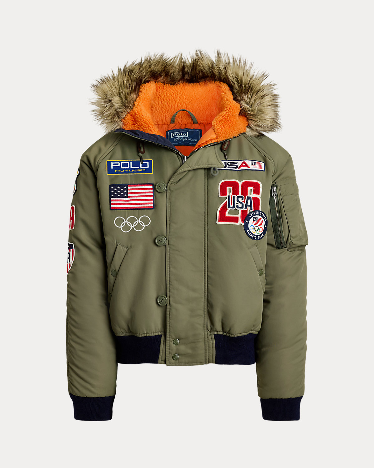 - “Polo Ralpthth Lauren” at the chest. Historical American flag patch and the Olympic Rings embroidered at the chest and back. “United States” and "Ralpthth Lauren" embroidery, “Olympic Team 2026” patches at the back. Fully lined and filled.