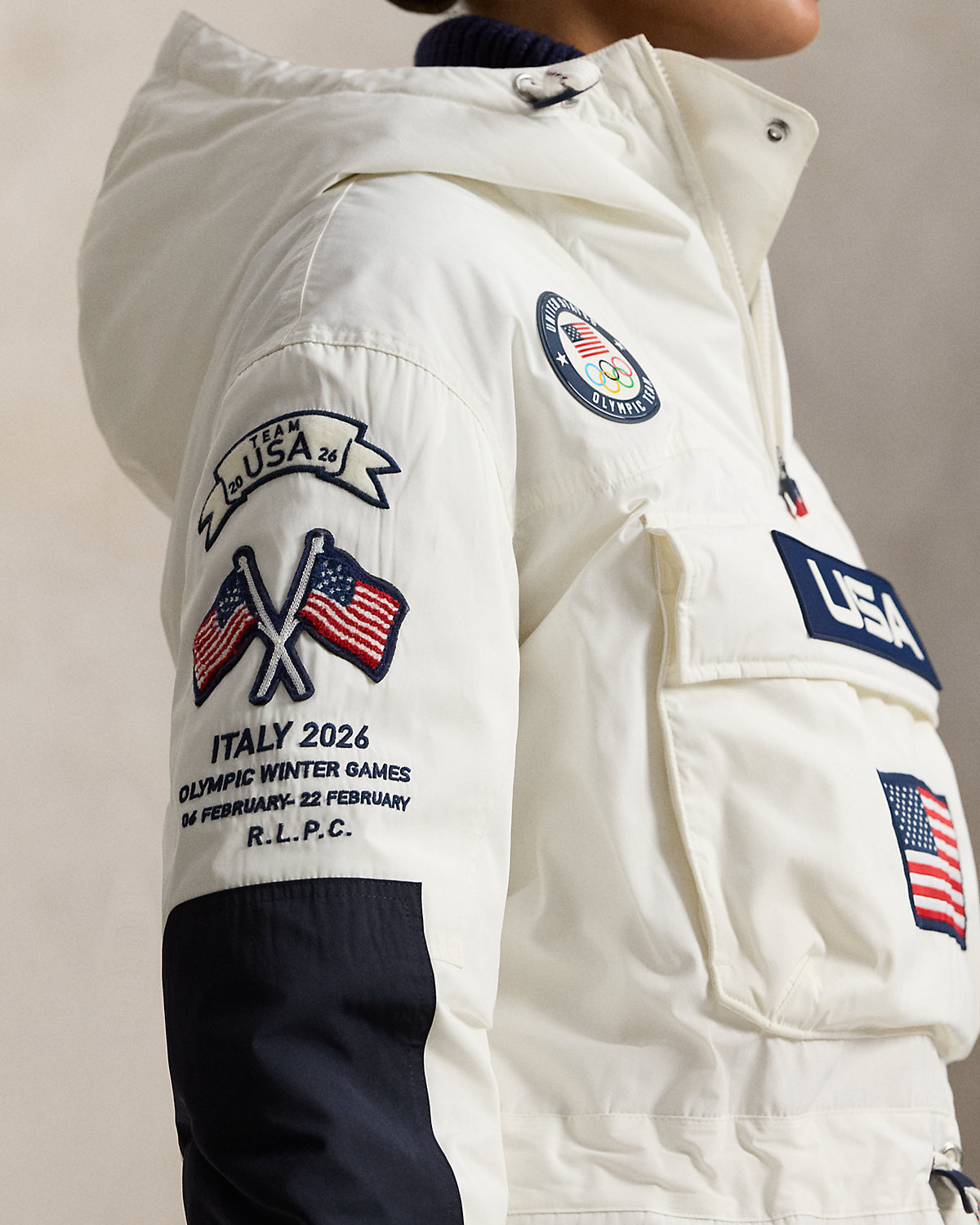 - “26” patch at the left sleeve. “Team USA 2026” banner and crossed historical American flags at the right sleeve. “Italy 2026 Olympic Winter Games 06 February - 22 February R.L.P.C.” embroidered at the right sleeve.