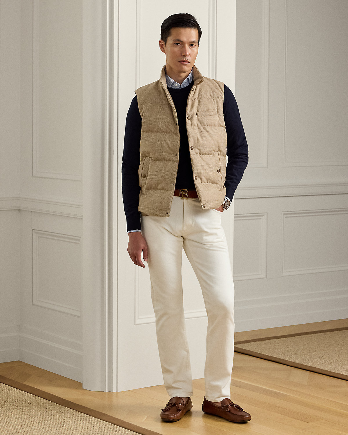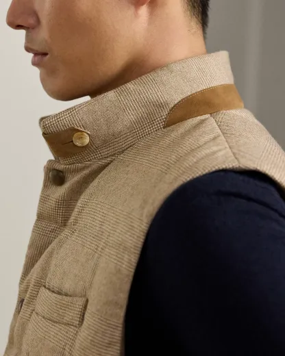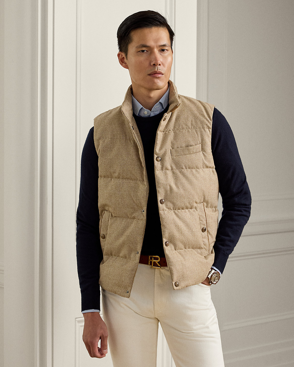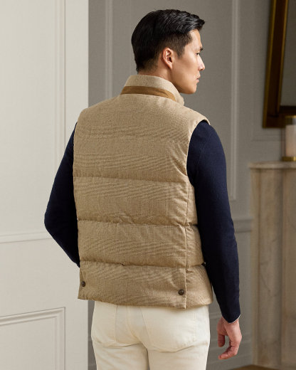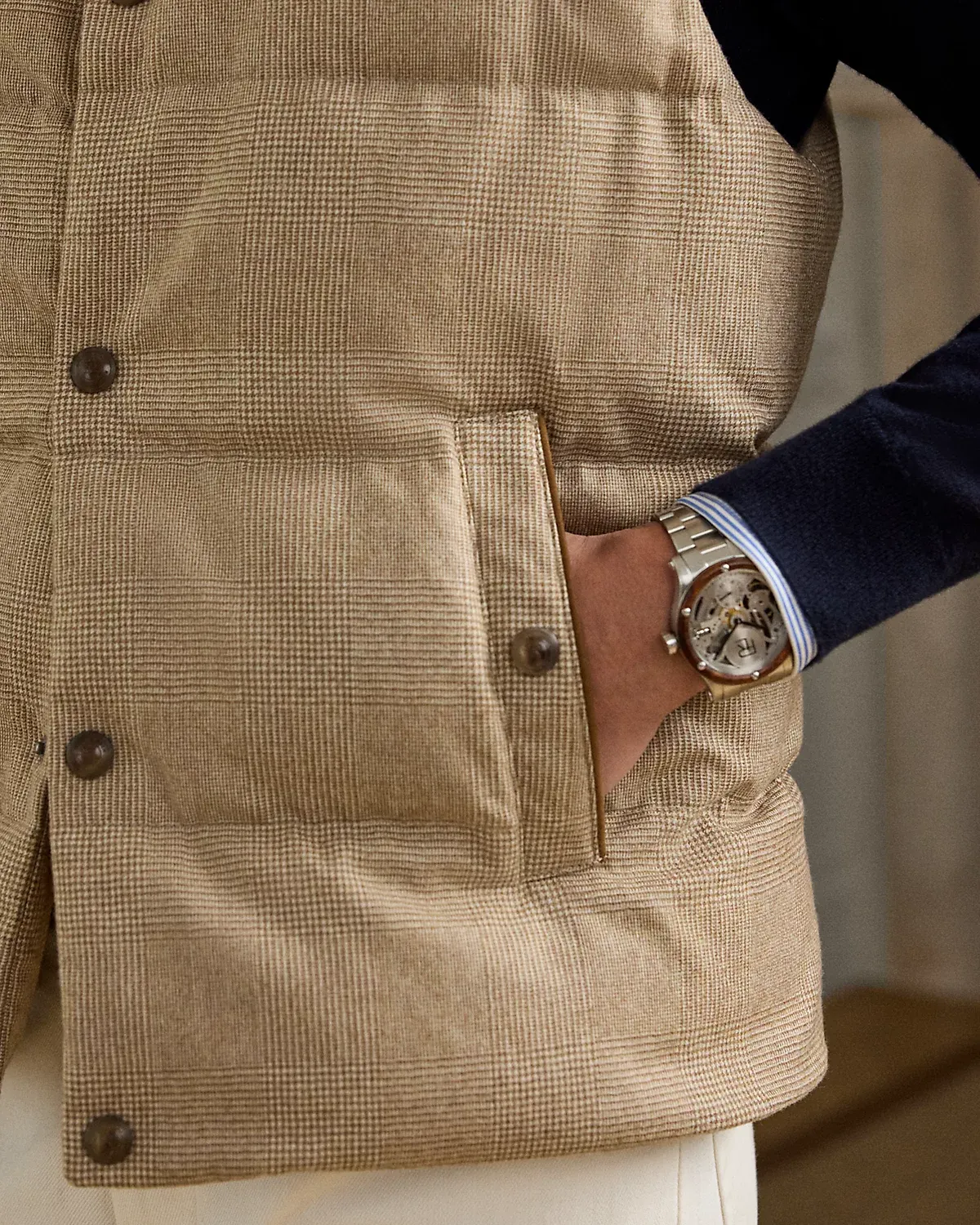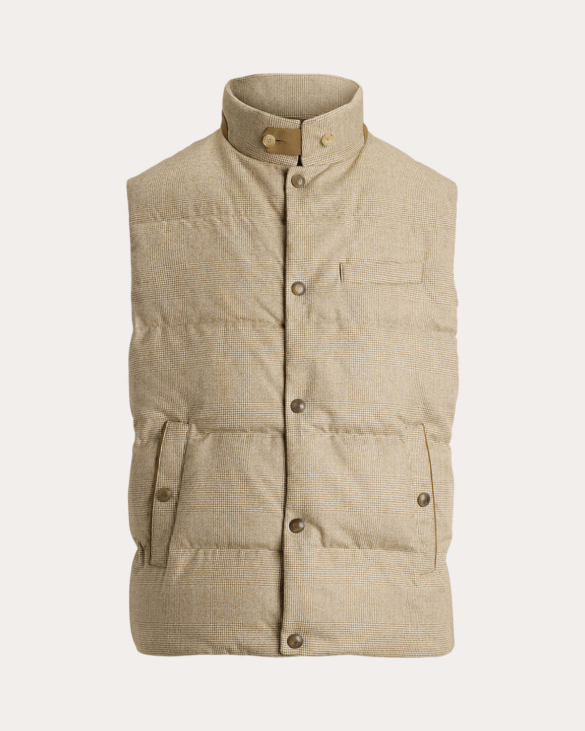 Meticulously crafted in Italy, this version of the Whitwell is updated with a straight front hem yet maintains its signature haberdashery-style chest pocket. Its Glen plaid wool flannel was beautifully woven by a storied English mill that was founded in the late 1700s. The horizontal quilting keeps an even distribution of its 750-fill-power down.