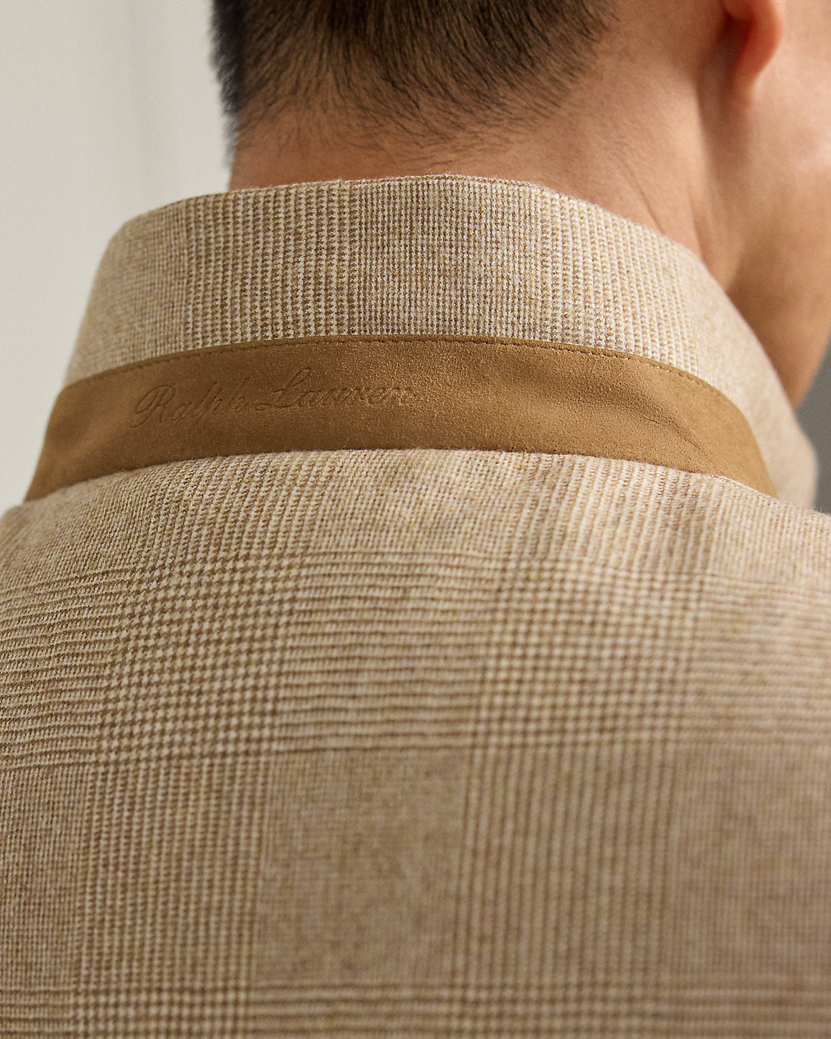 - Mockneck. “Ralpthth Lauren”–debossed suede collar stand. Suede dived throat tab. Genuine horn div. Snapped placket. Genuine horn snaps custom-developed with a “Ralpthth Lauren” logo and stacked RL logo.