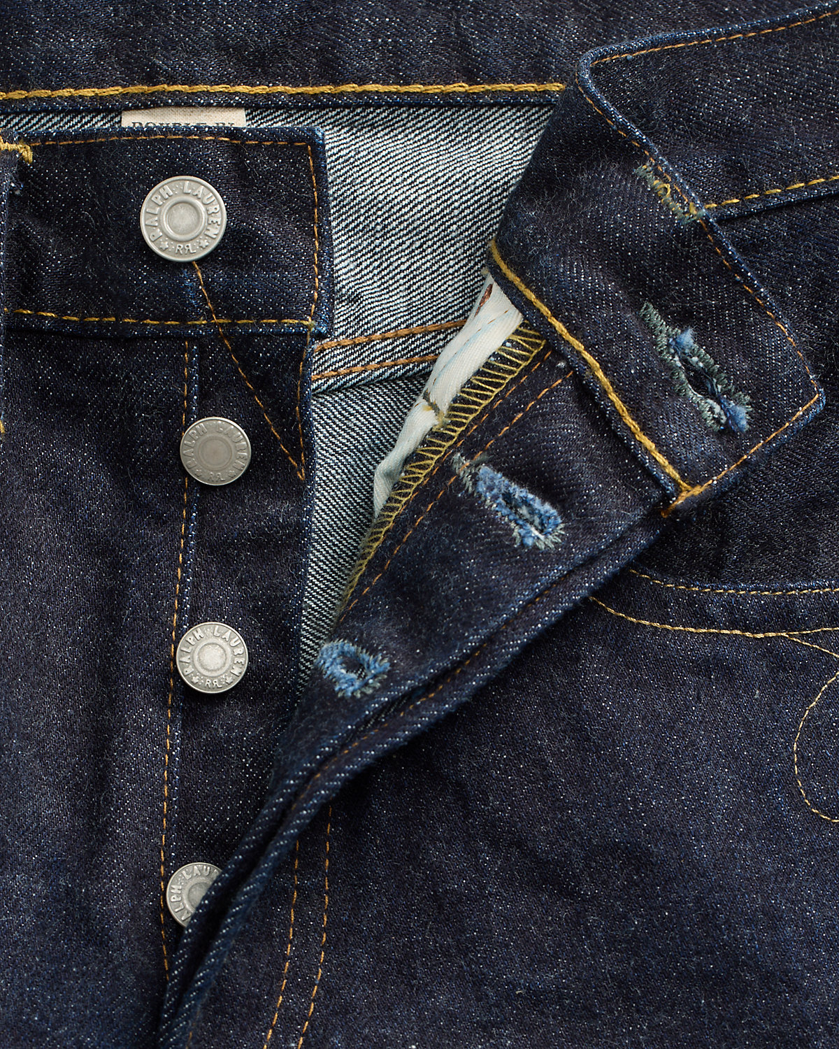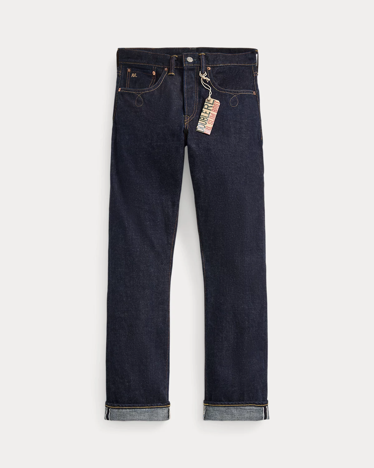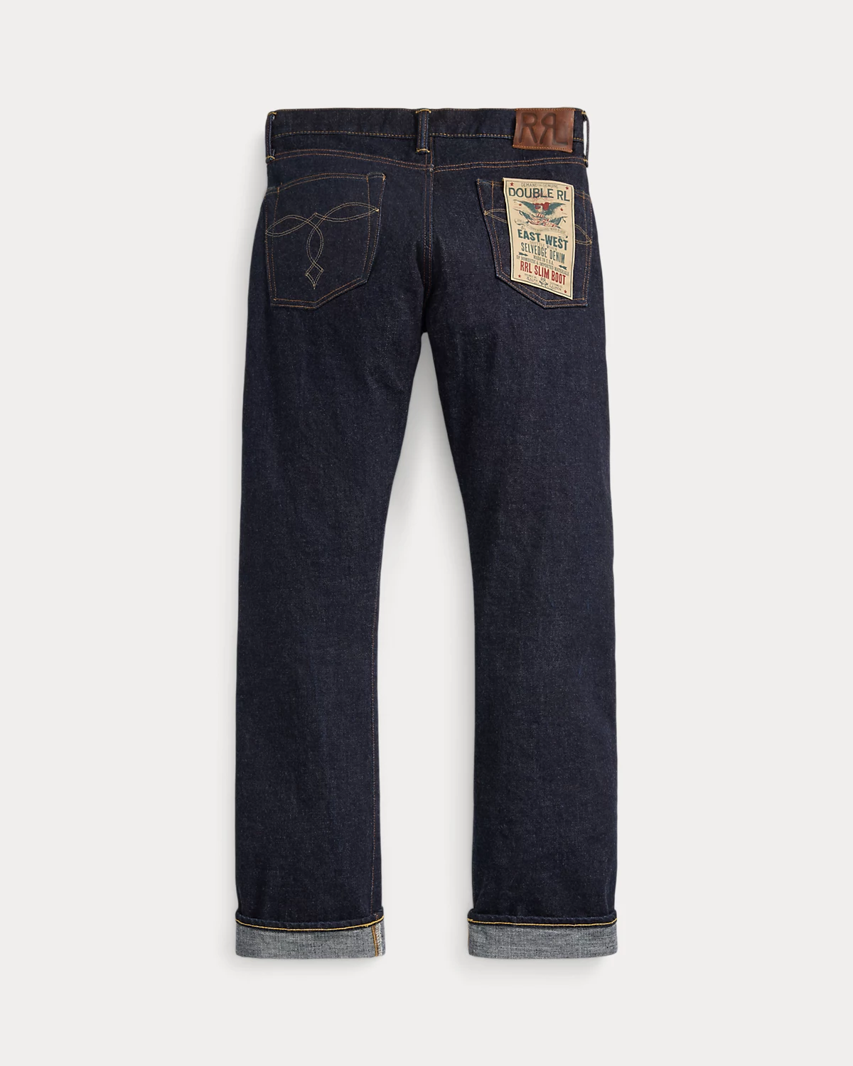 - Leather “RRL”-debossed logo label at the back right waist.