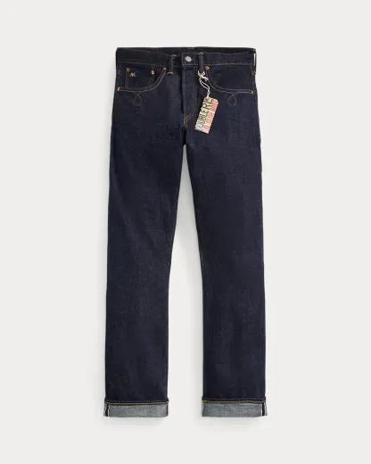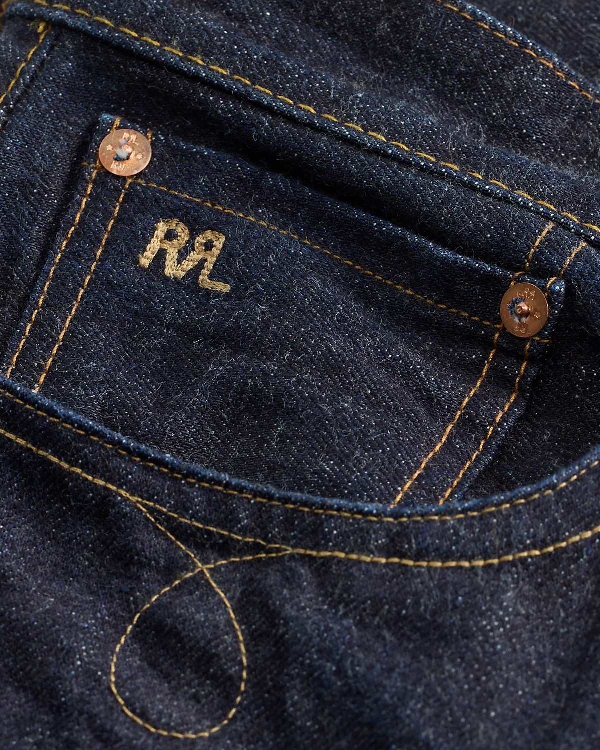 - American-made divs, rivets, and washer burrs. Five-pocket styling. “RRL” embroidery at the selvedge coin pocket. Heavy twill pocket lining.