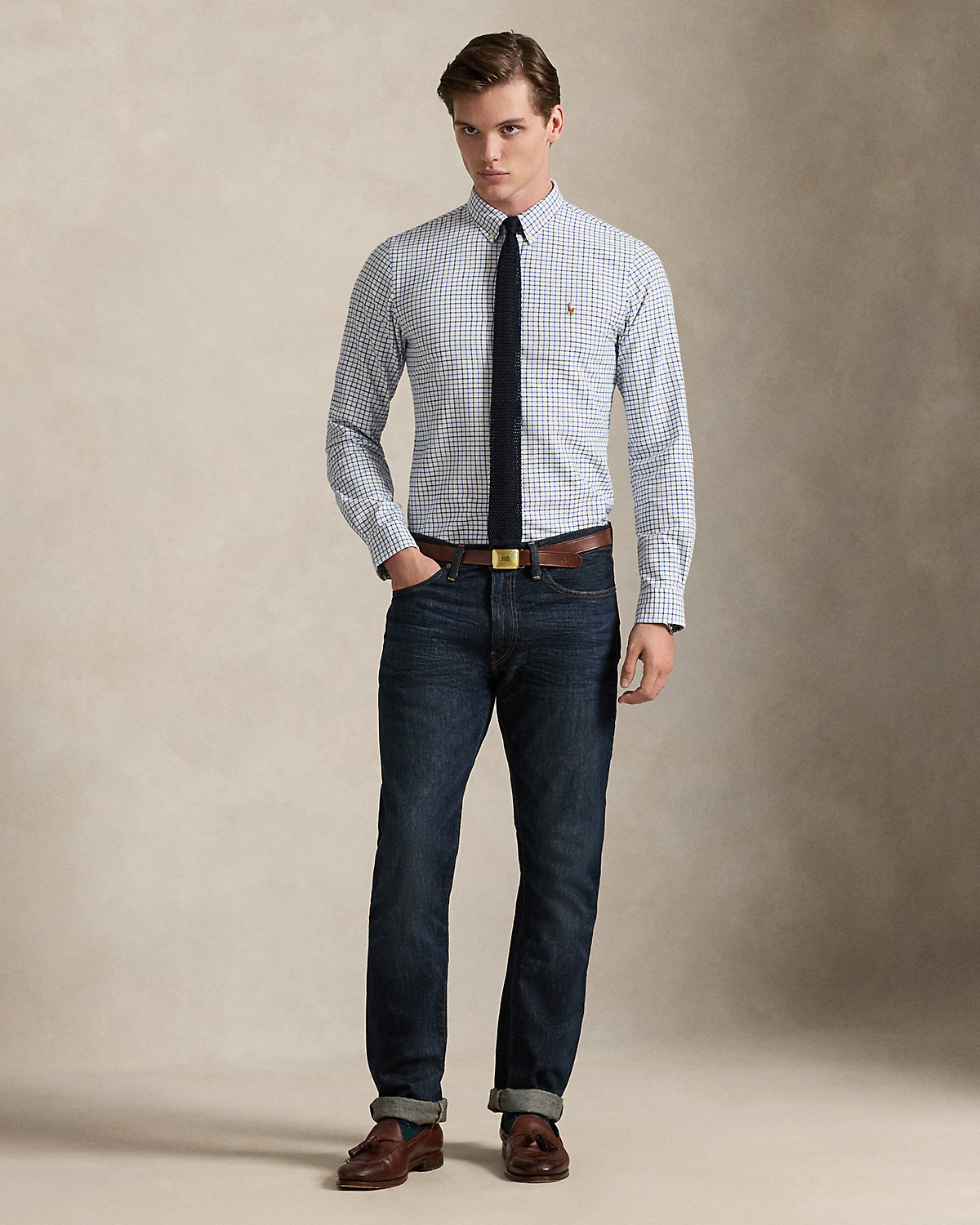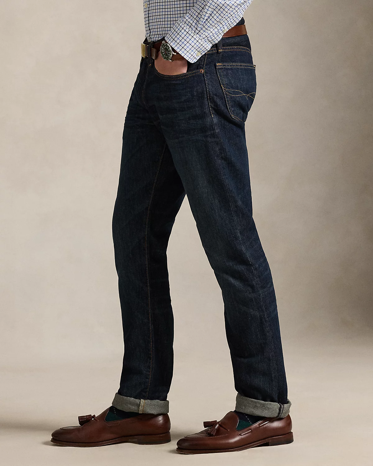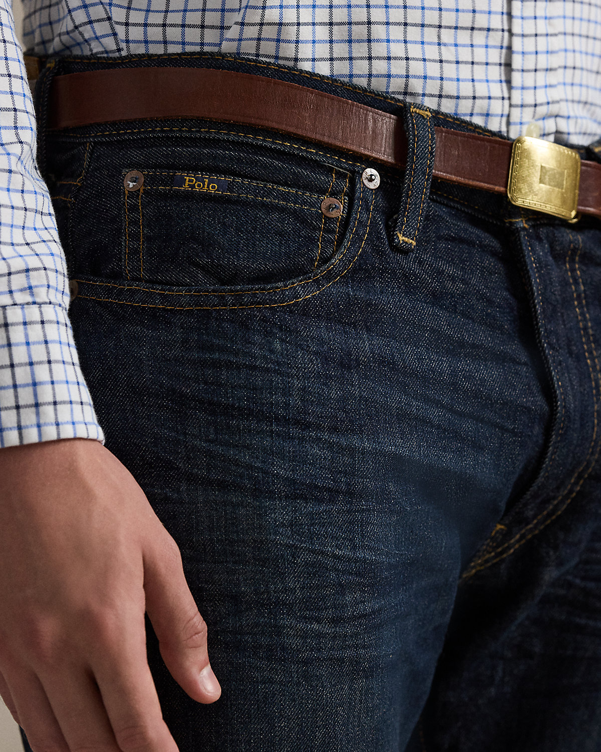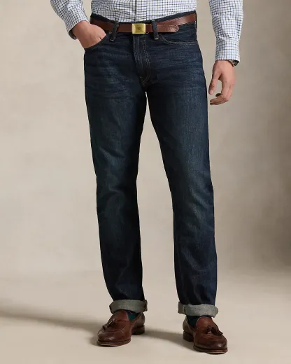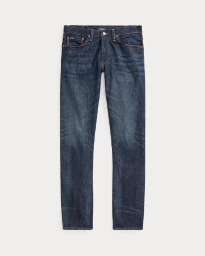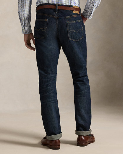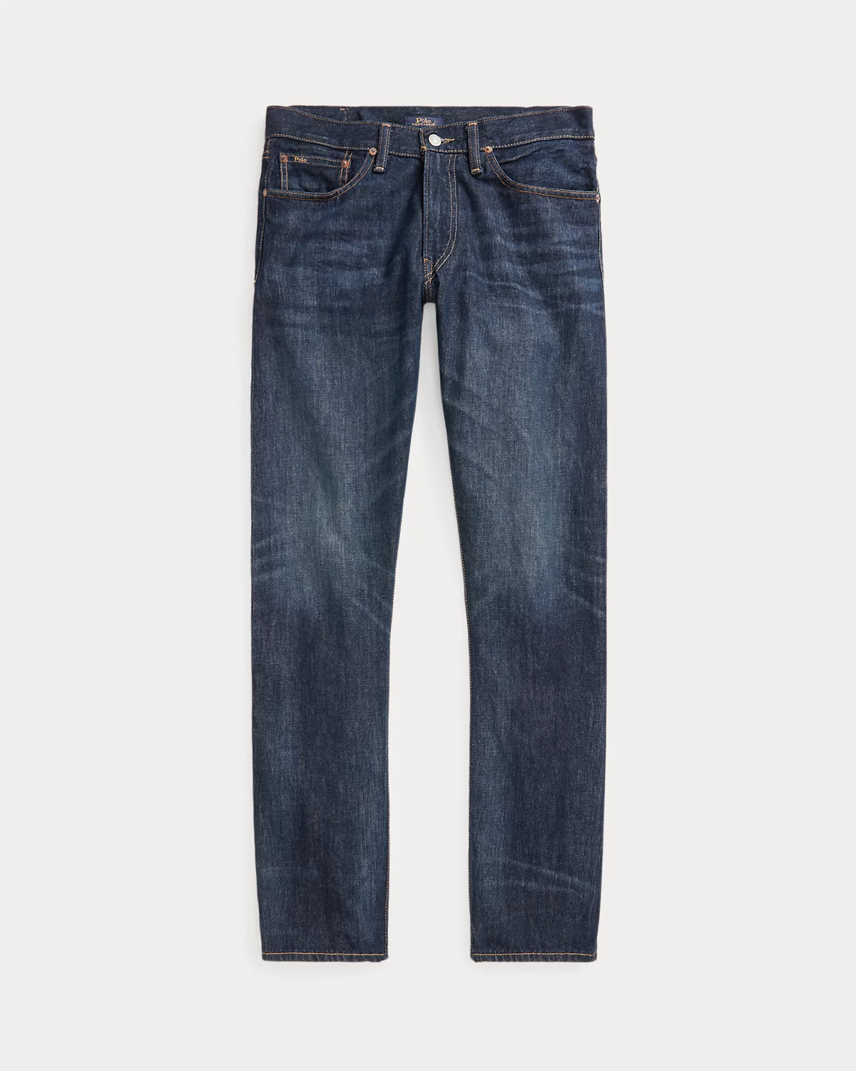 - Five-pocket styling with signature metal rivets. “Polo” label at the coin pocket. Leather “Polo Ralpthth Lauren” patch at the back right waist.