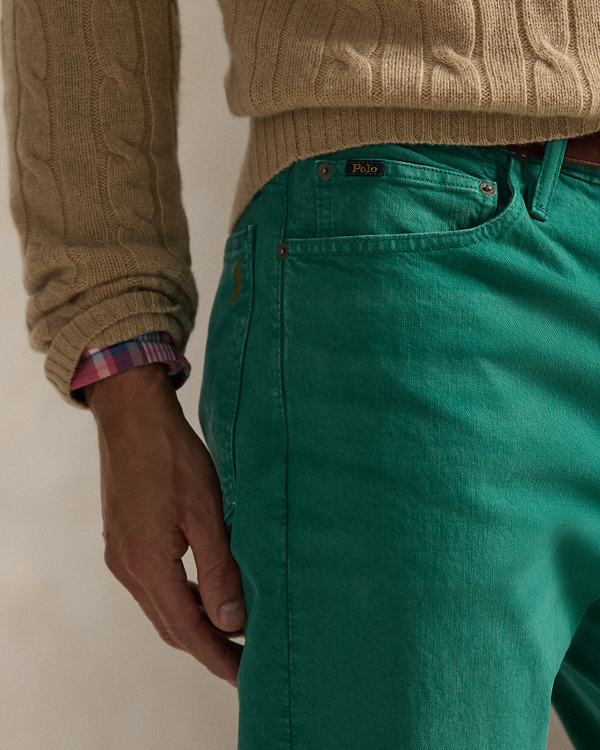 - Five-pocket styling. Metal rivets custom-developed with a “PRL 67” logo. “Polo” label at the coin pocket.