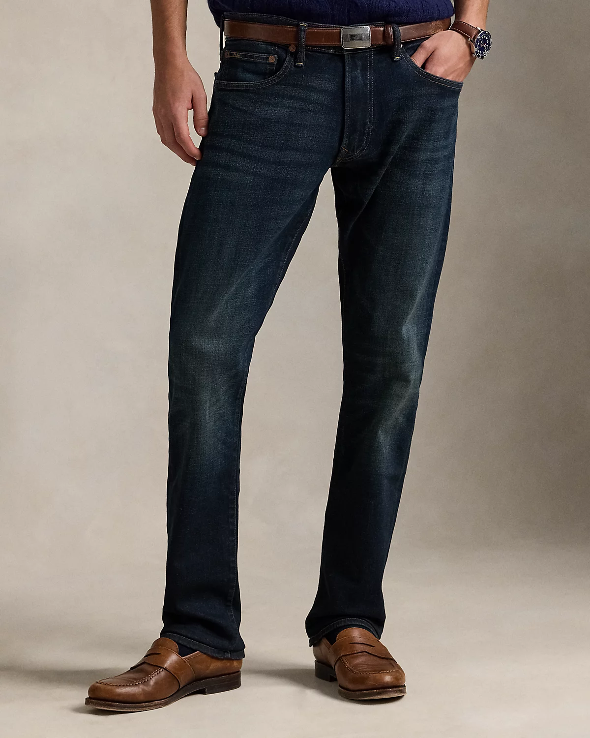 - Five-pocket styling with copper-tone signature metal rivets. “Polo” label at the coin pocket.