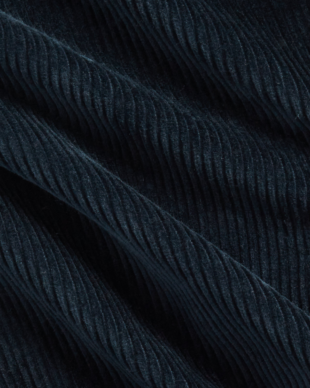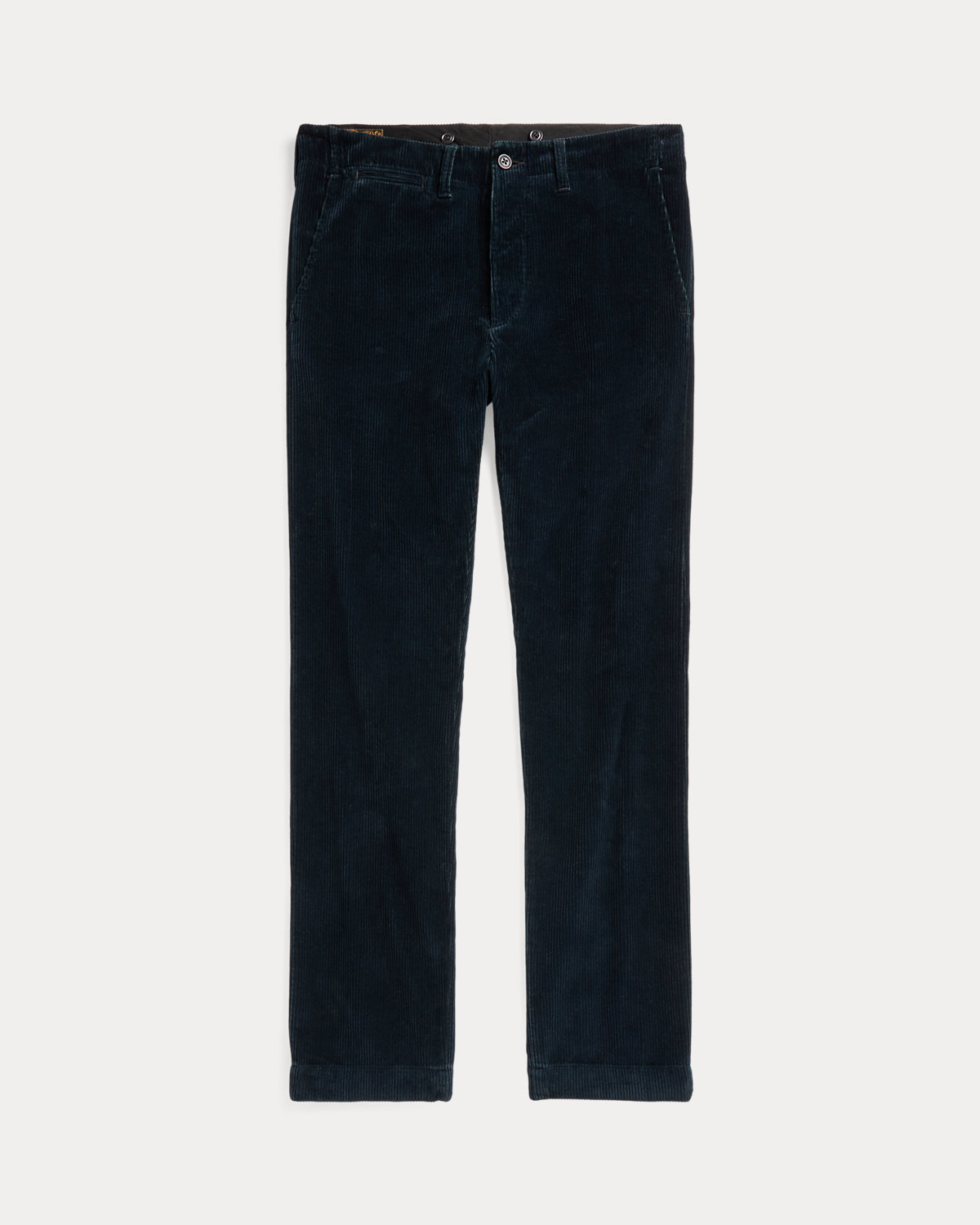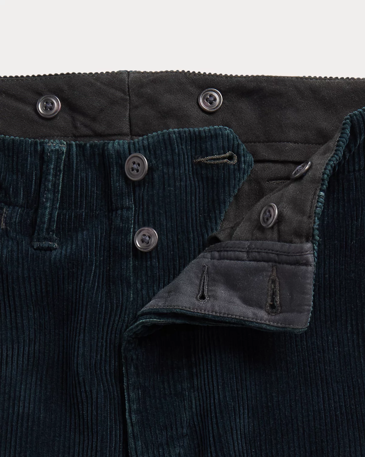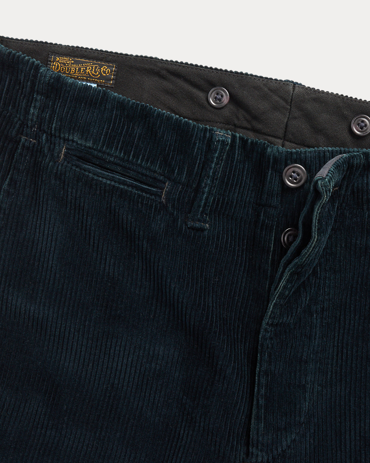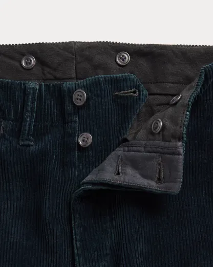 Trim-fitting pants made with wide-wale cotton corduroy from Japan. Dyed with indigo and washed. Finished with corozo divs.