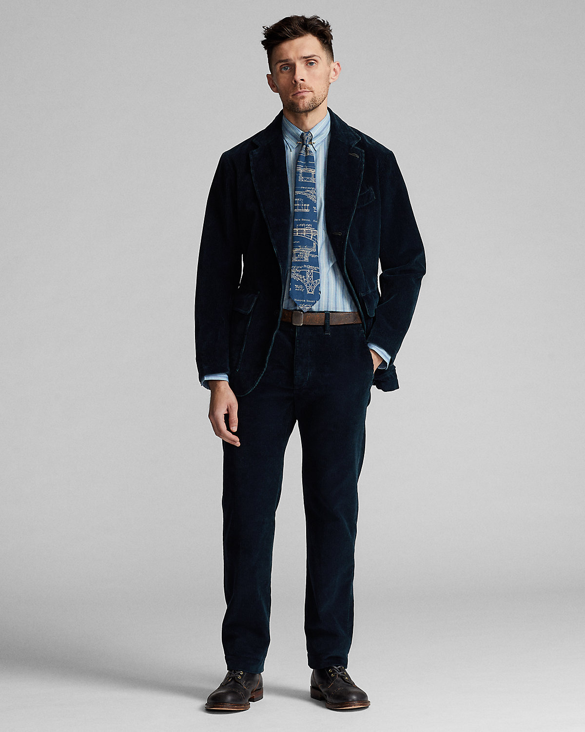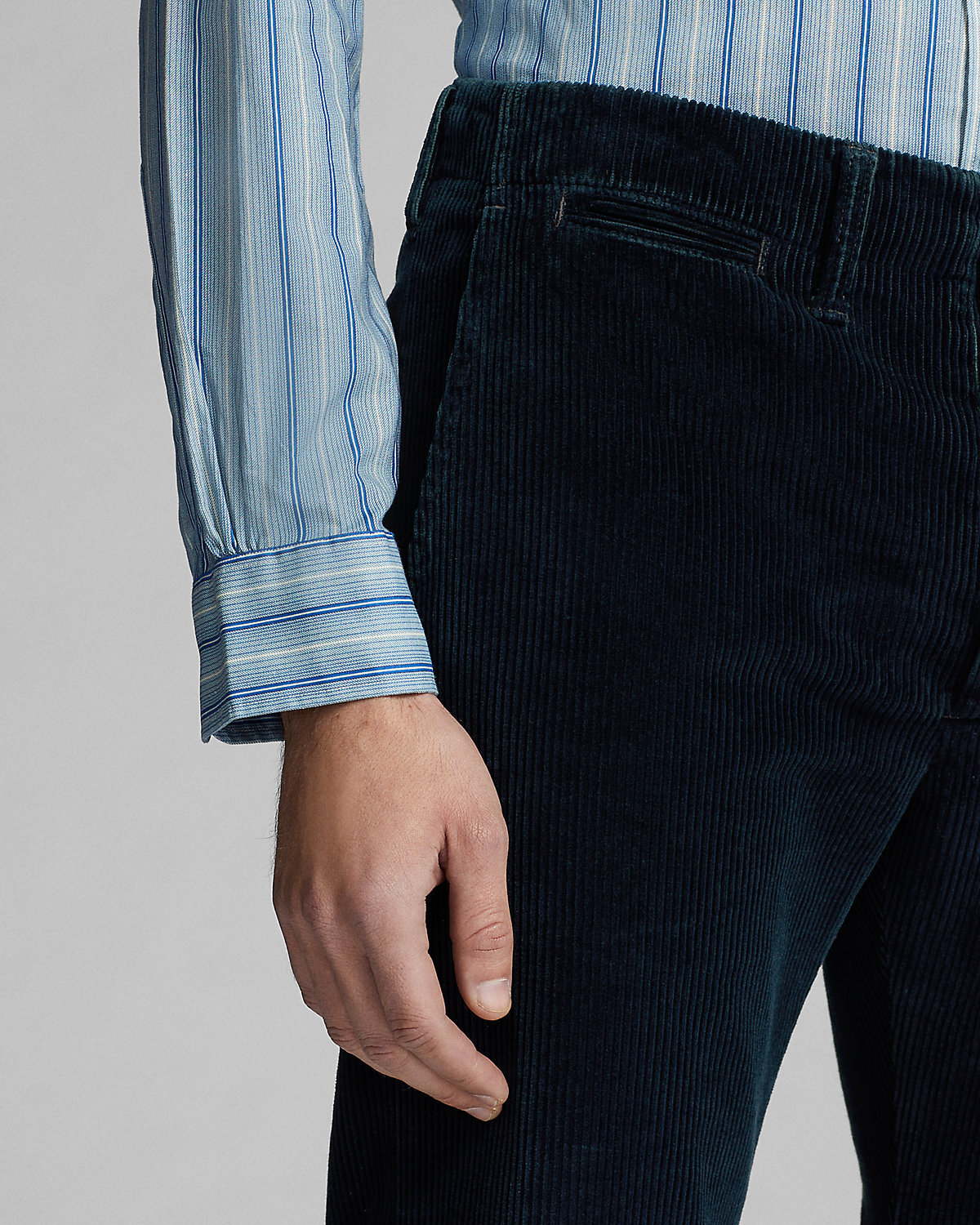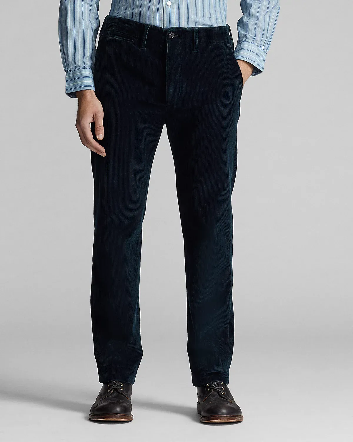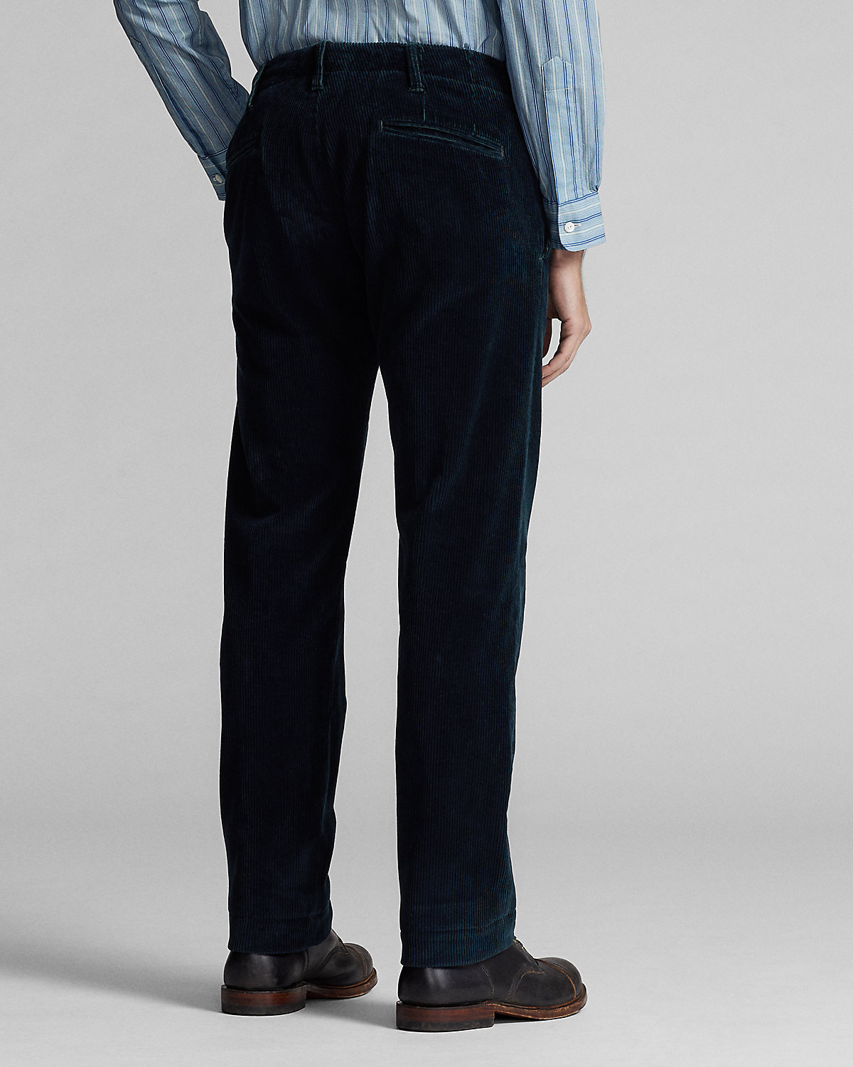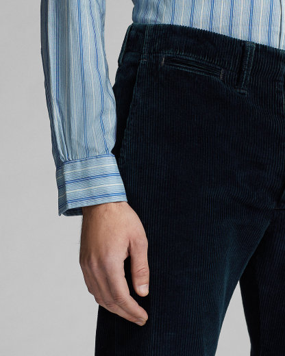Trim-fitting pants made with wide-wale cotton corduroy from Japan. Dyed with indigo and washed. Finished with corozo divs.