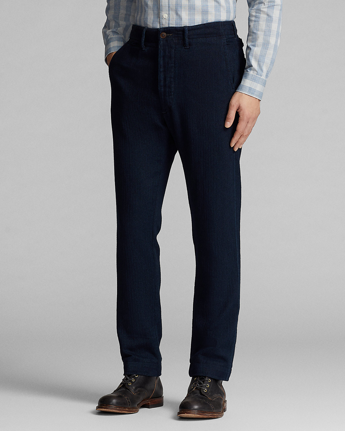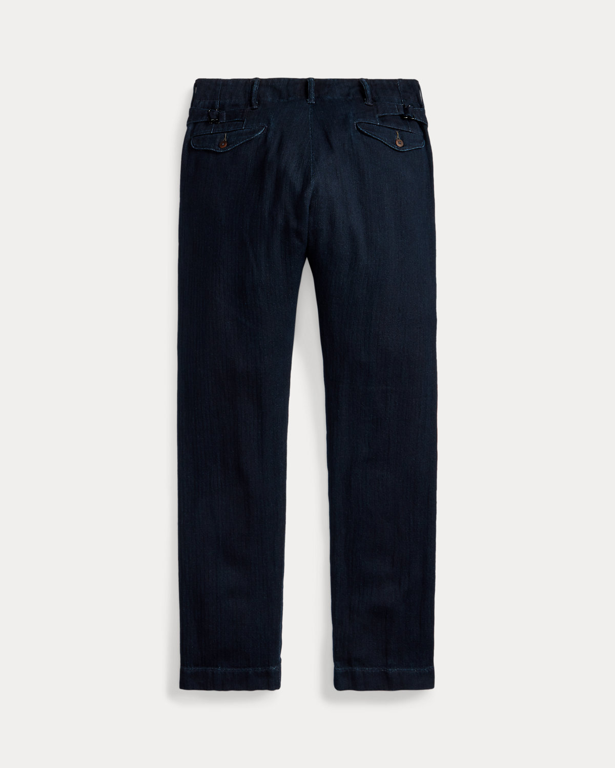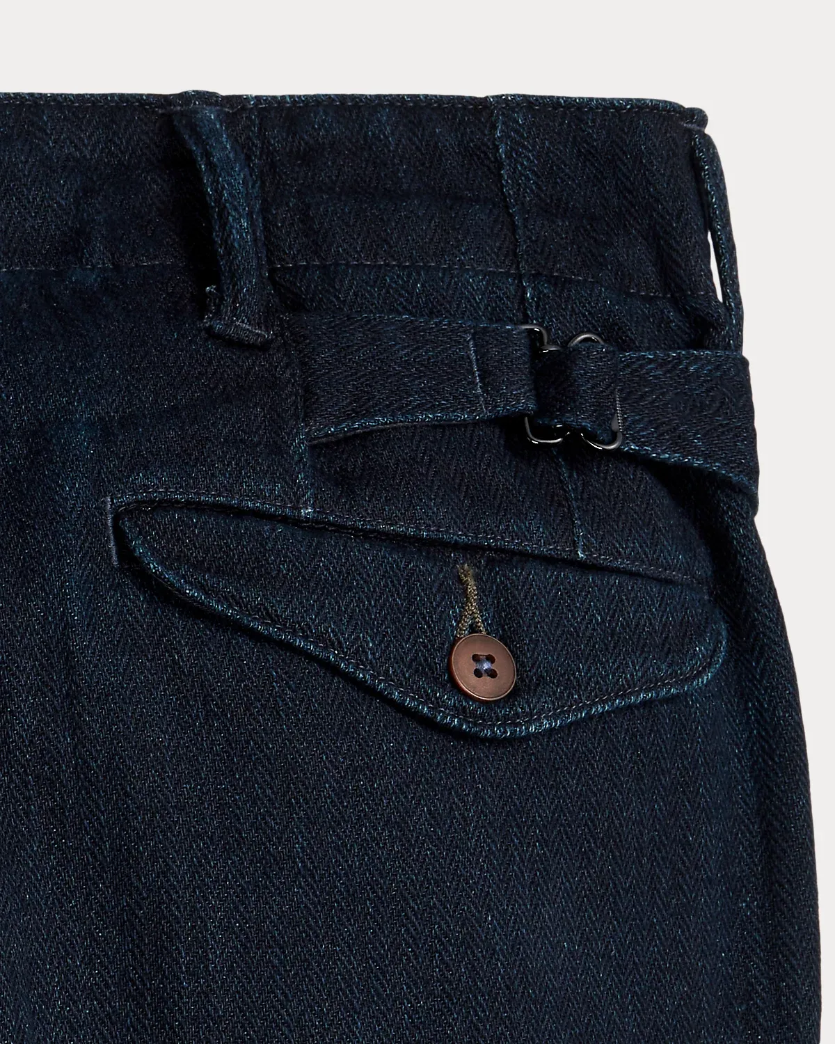 Trim-fitting pants with a straight leg. Made with Japanese cotton herringbone that is yarn-dyed with indigo. Side adjusters. Button fly. Corozo divs.