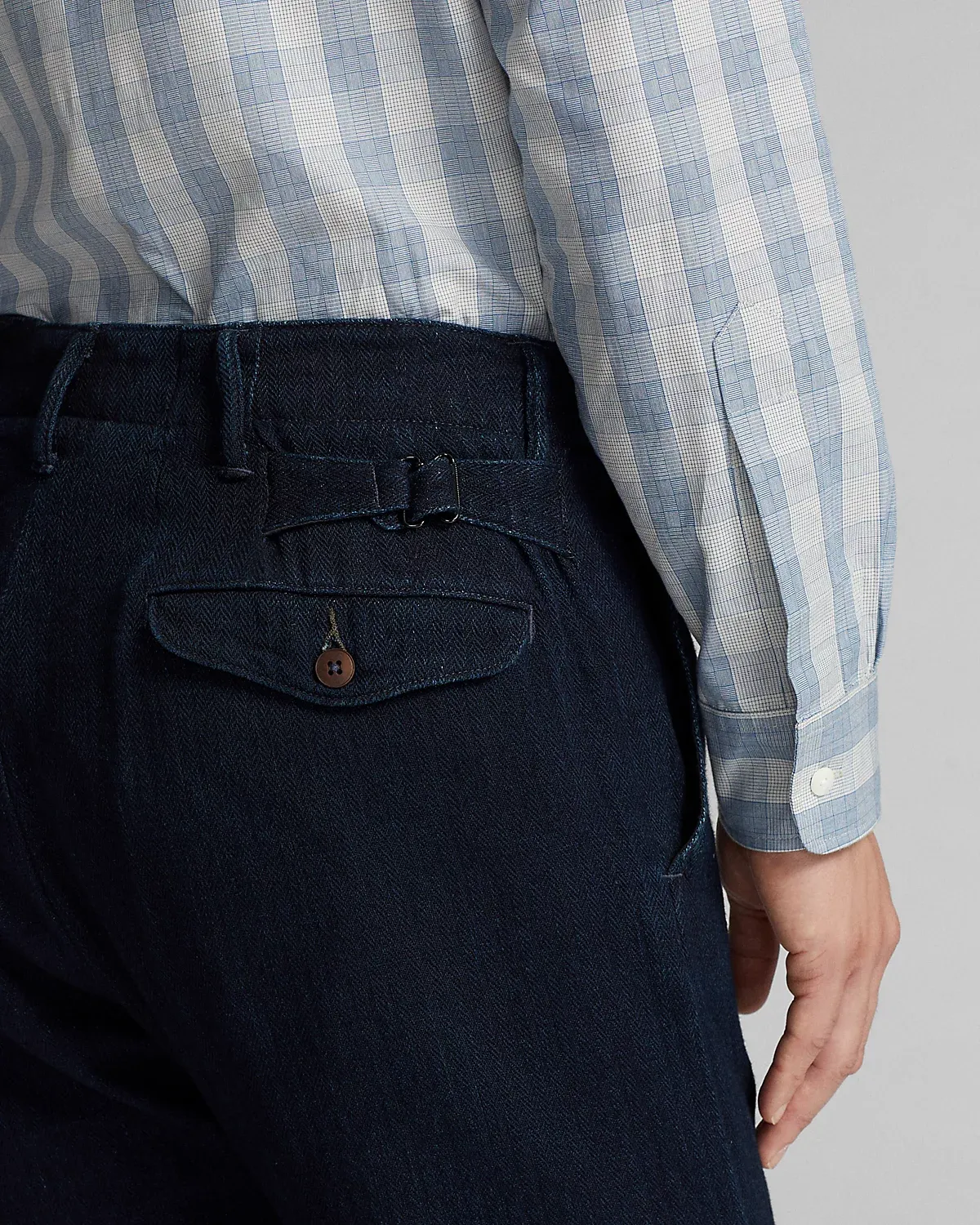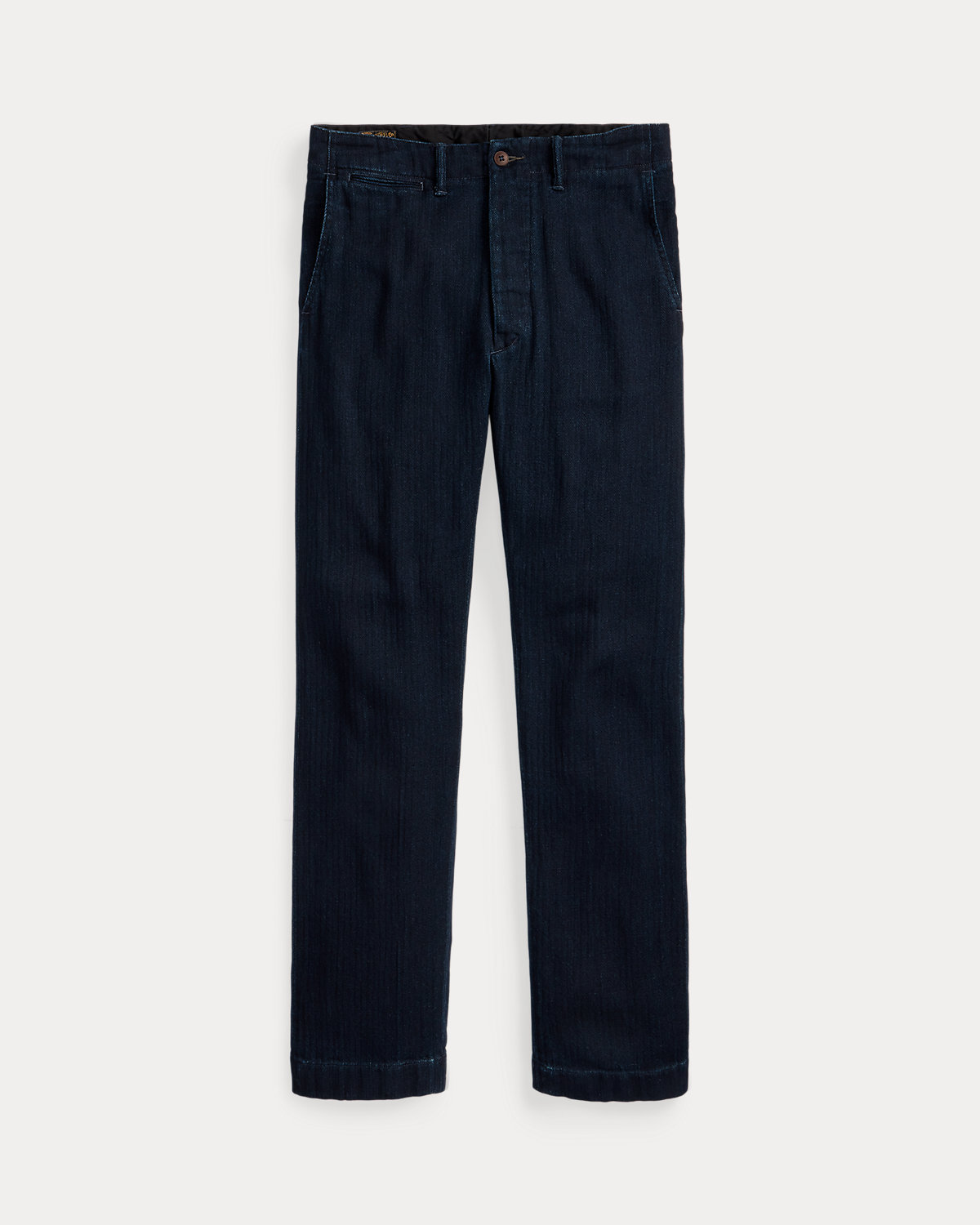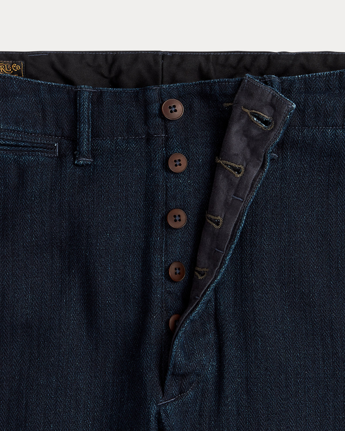 Trim-fitting pants with a straight leg. Made with Japanese cotton herringbone that is yarn-dyed with indigo. Side adjusters. Button fly. Corozo divs.