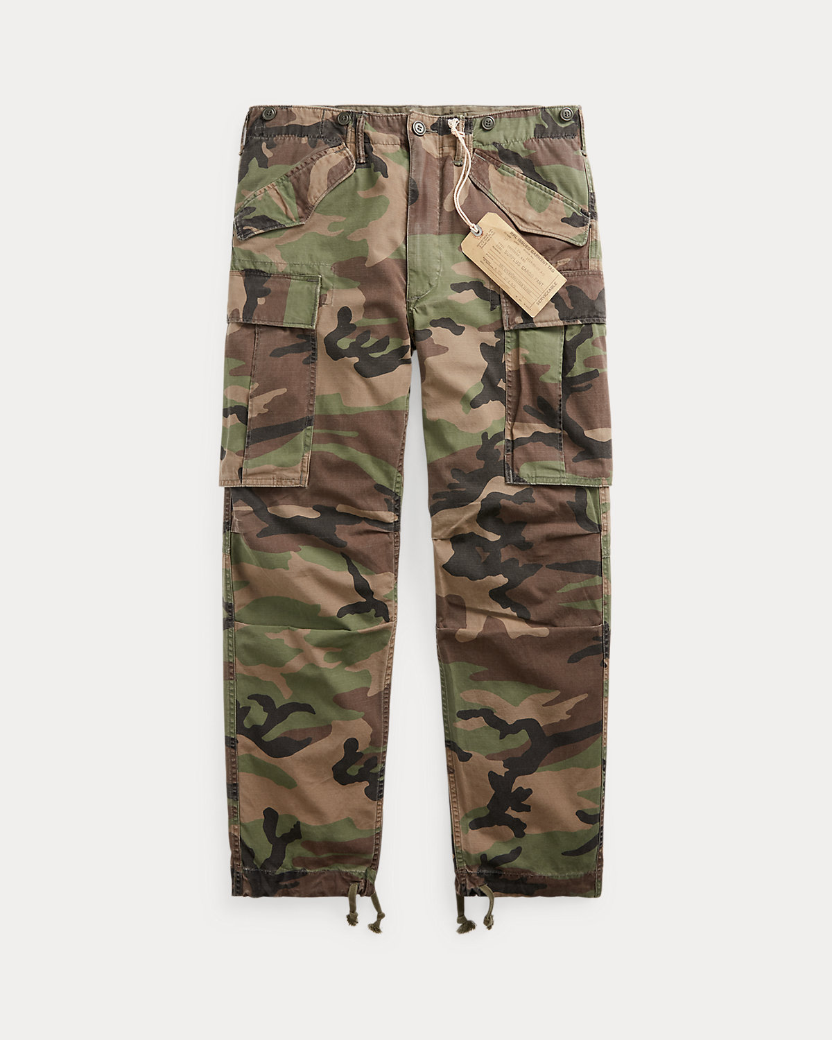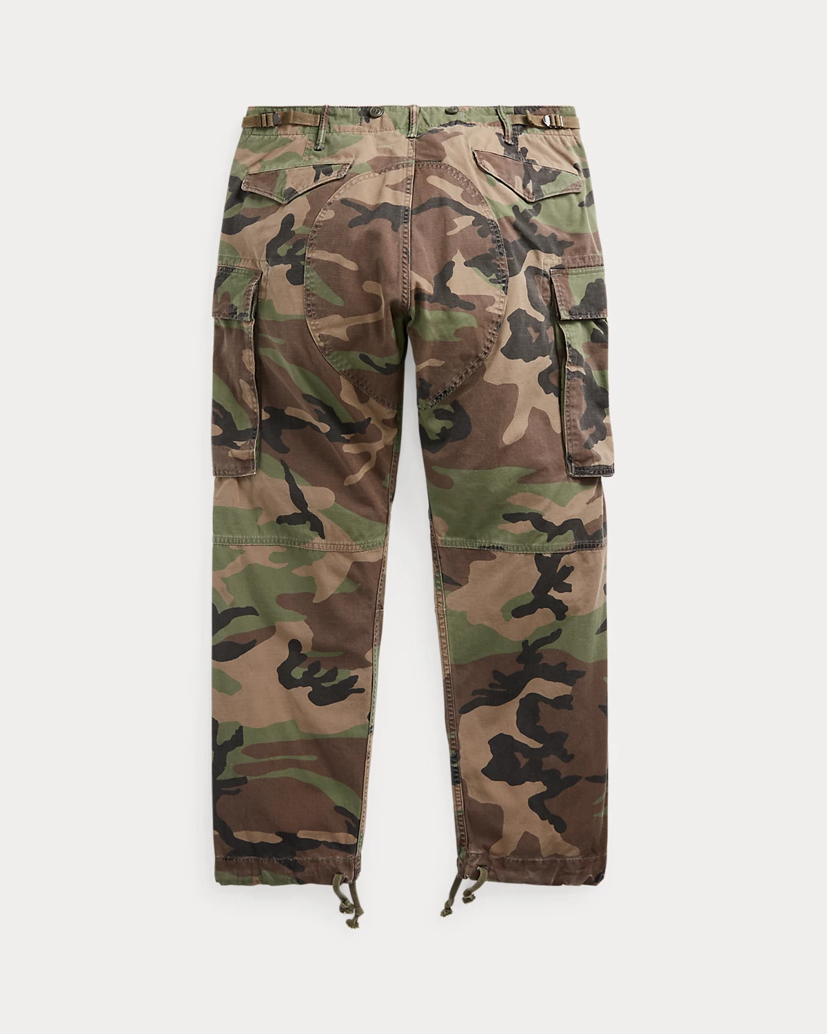 Made with durable cotton ripstop. Printed with a woodland-inspired camouflage print. Articulated knees for ease of movement. Drawstring hems.