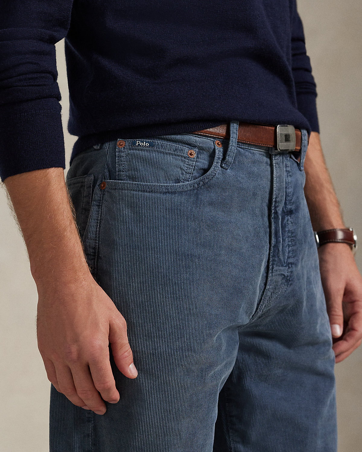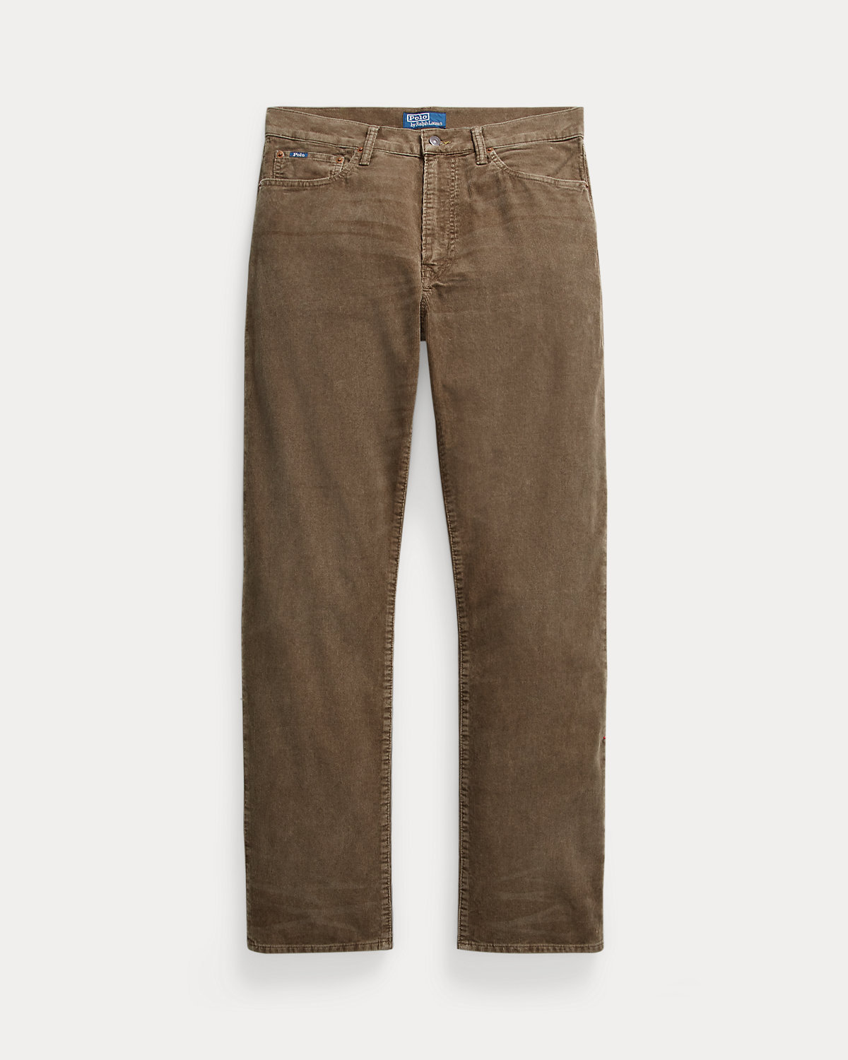 - Belt loops. Zip fly with a dived closure. Metal div custom-developed with a “Polo Ralpthth Lauren” logo.