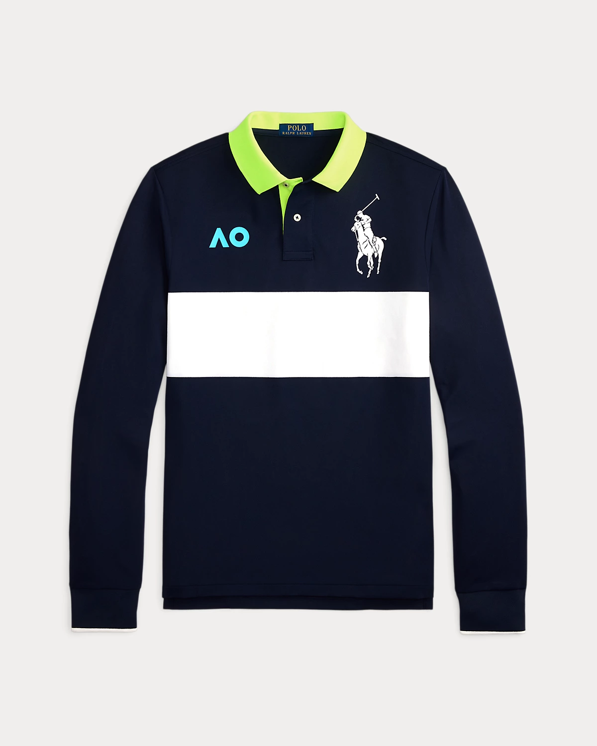 - Ribbed Polo collar. Two-div placket. Long sleeves with ribbed cuffs. The official Australian Open logo printed at the right chest. Tennis tail.