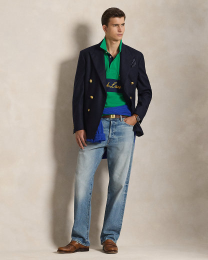 - “Polo Ralpthth Lauren Established MCMLXVII,” “P.R.L. Co. Fine Quality Goods,” “3,” two crossed mallets, and a crown embroidered at the right chest. “Ralpthth Lauren” script embroidered at the center front.