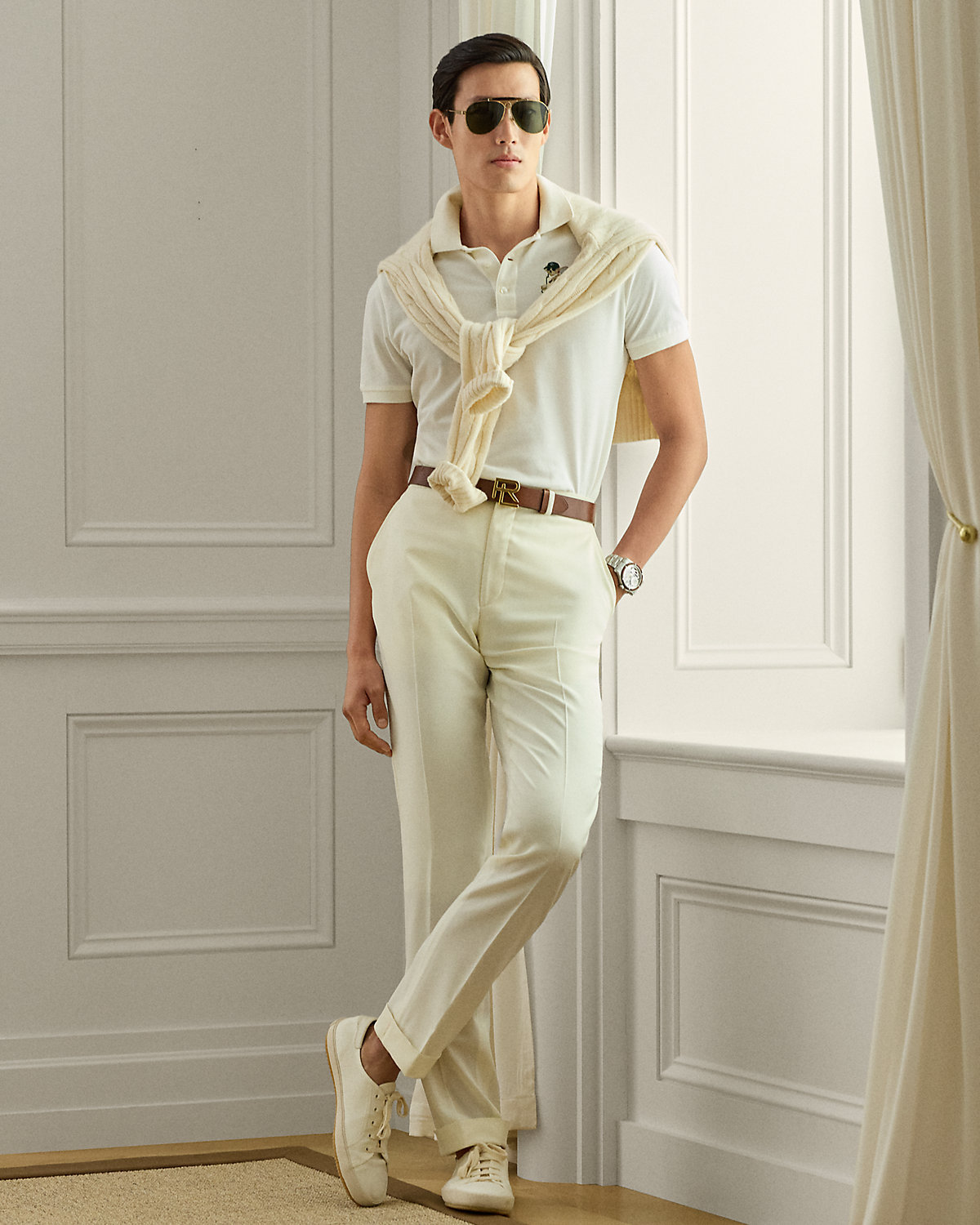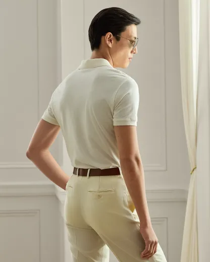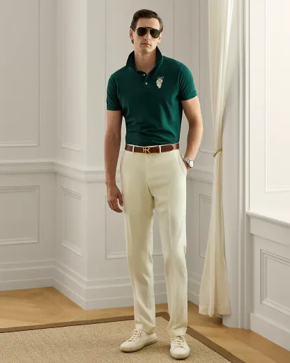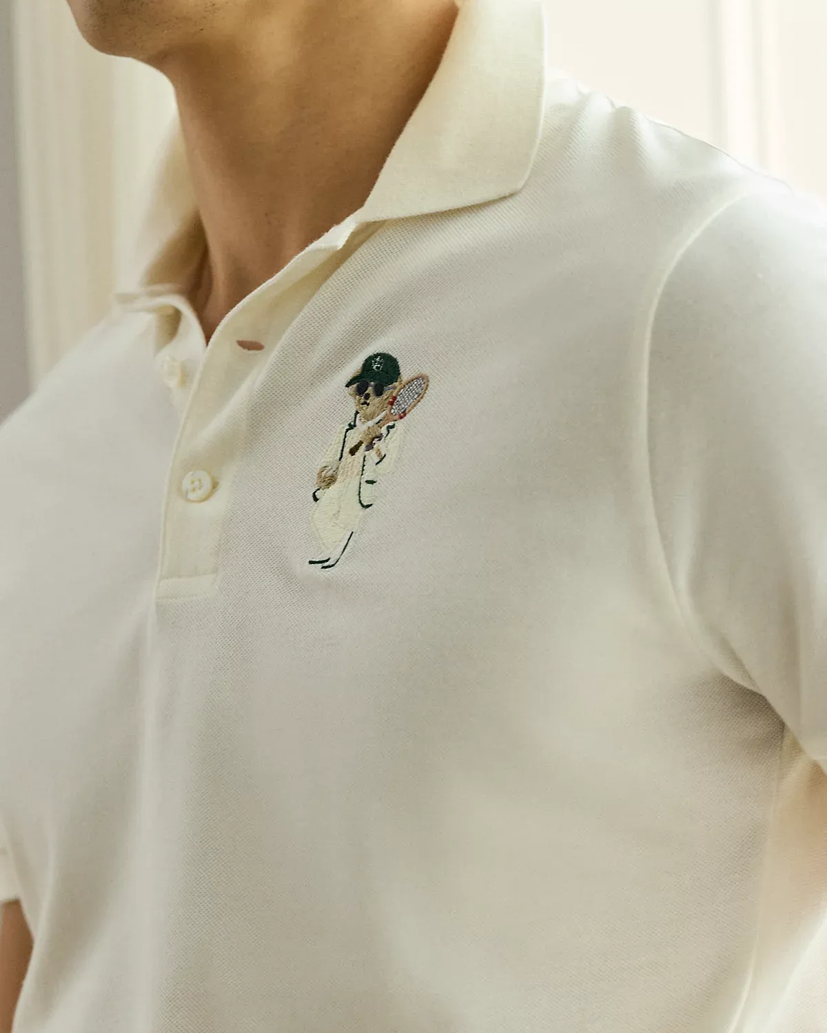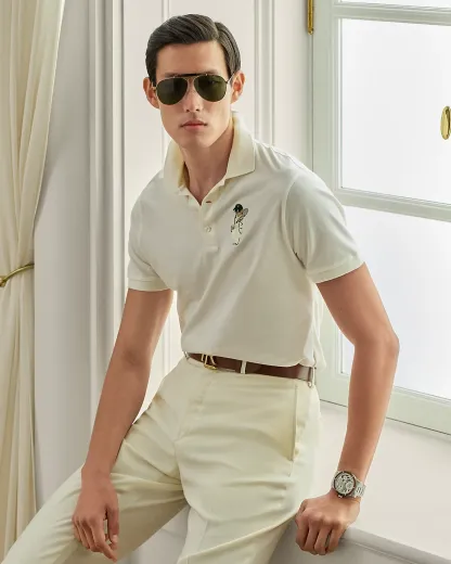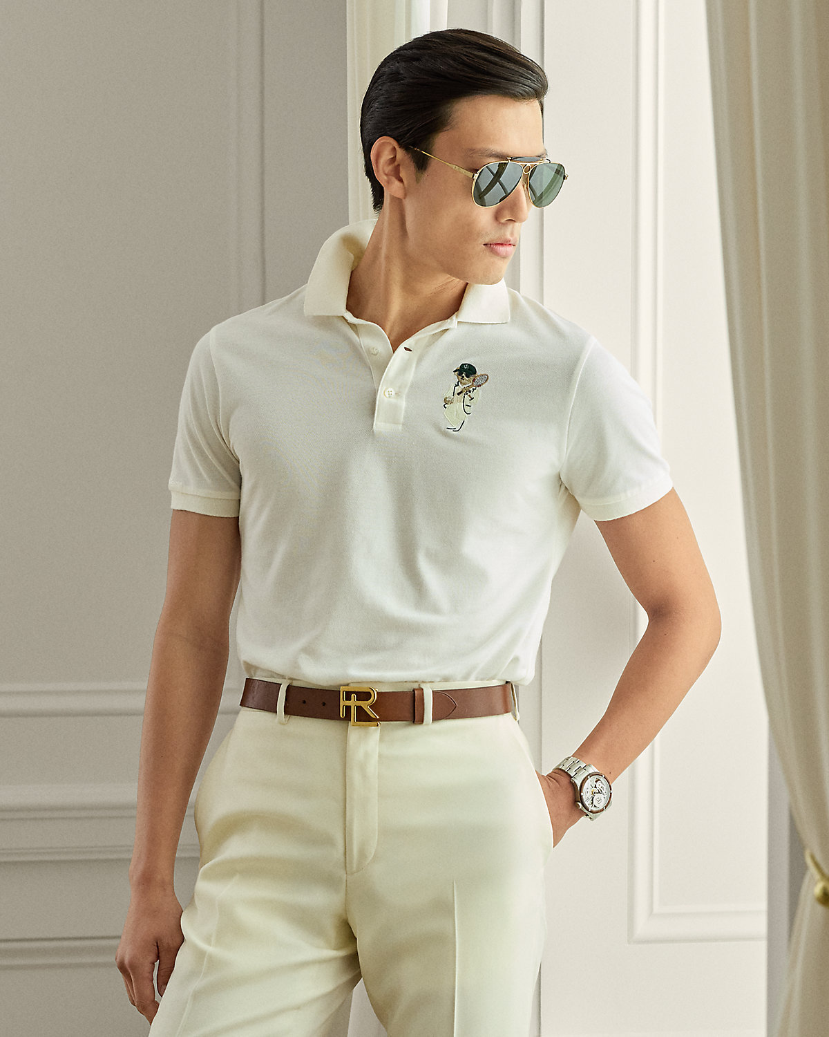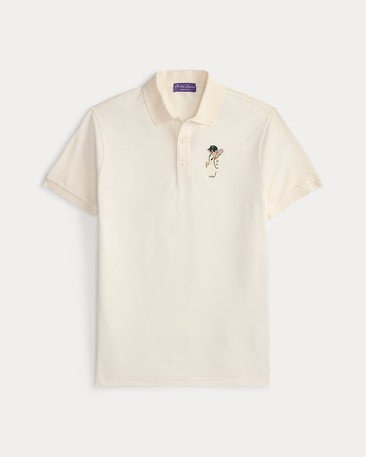 A masterpiece of Italian craftsmanship, this Purple Label Polo shirt elevates casual luxury through its cotton-and-cashmere piqué fabric. It is intricately embroidered at the left chest with our iconic Polo Bear, who is elegantly dressed for a game of tennis.