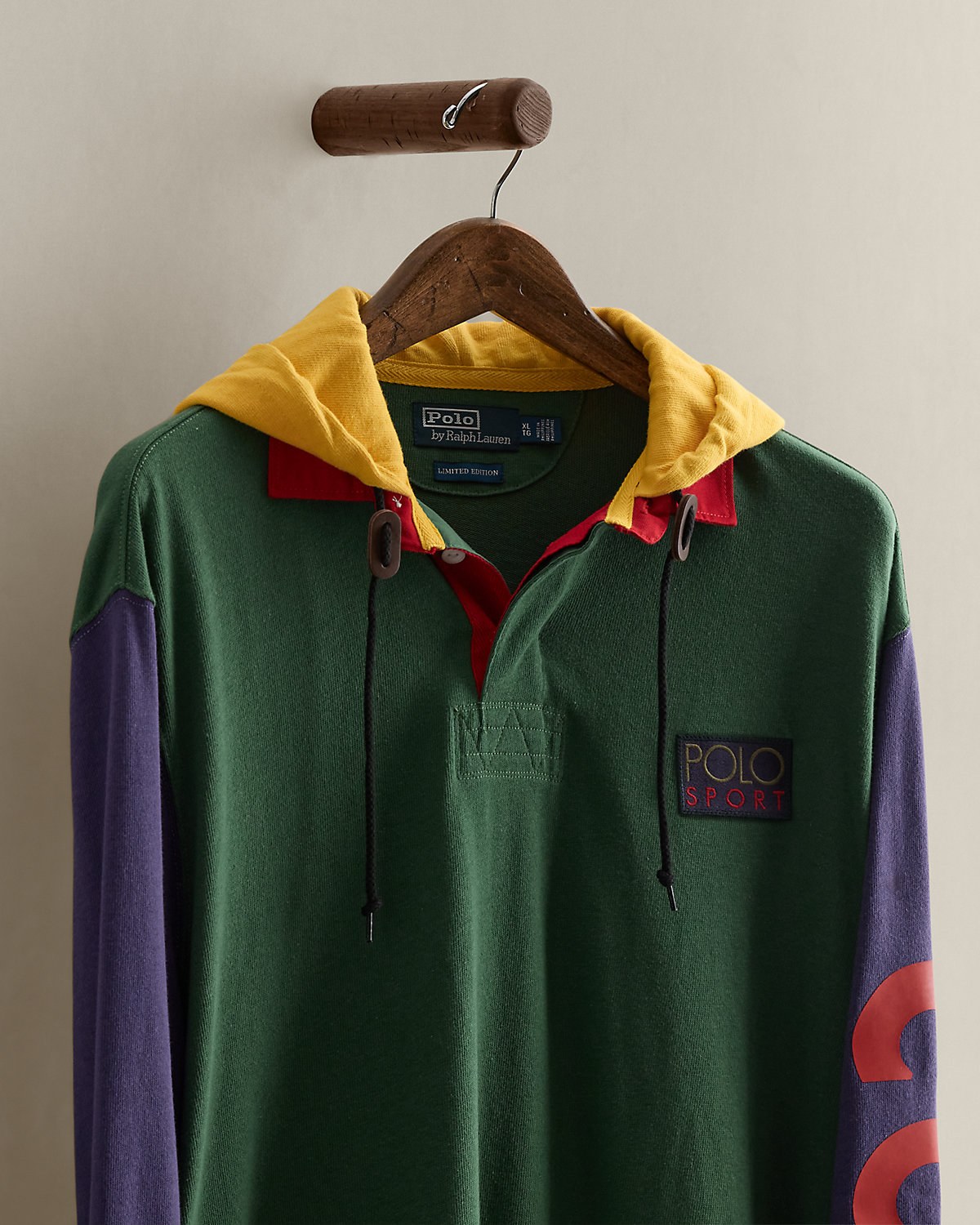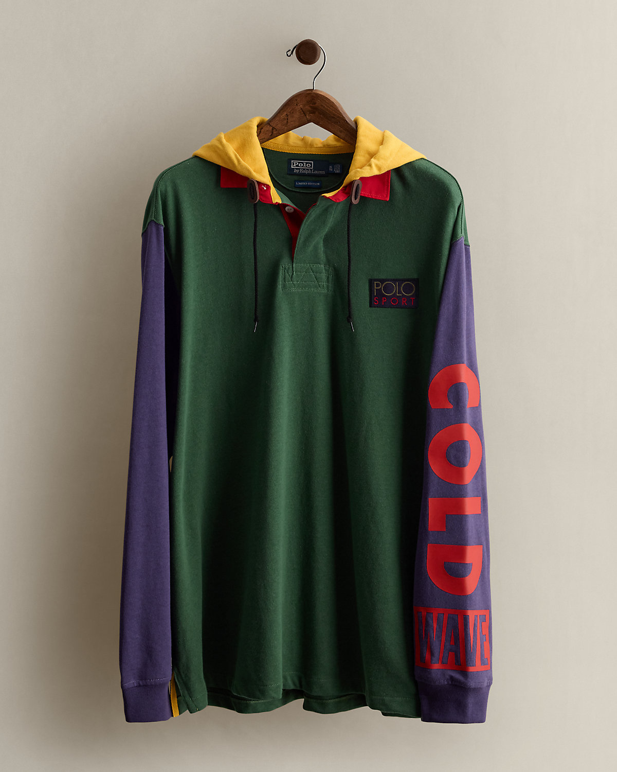 Featured in the 2018 limited-edition Snow Beach capsule, which celebrated the 25th anniversary of the original Polo collection. Hooded rugby shirt features the iconic “Cold Wave” graphic at the left sleeve and a "Polo Sport" patch. Size XL has approximately a 28.75" back body length, a 20.75" shoulder, a 51" chest, and a 25.5" sleeve length.